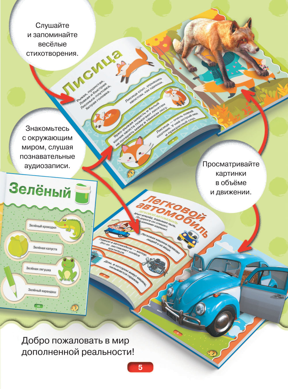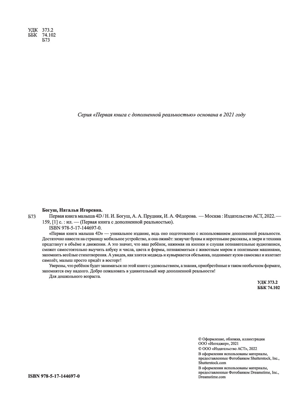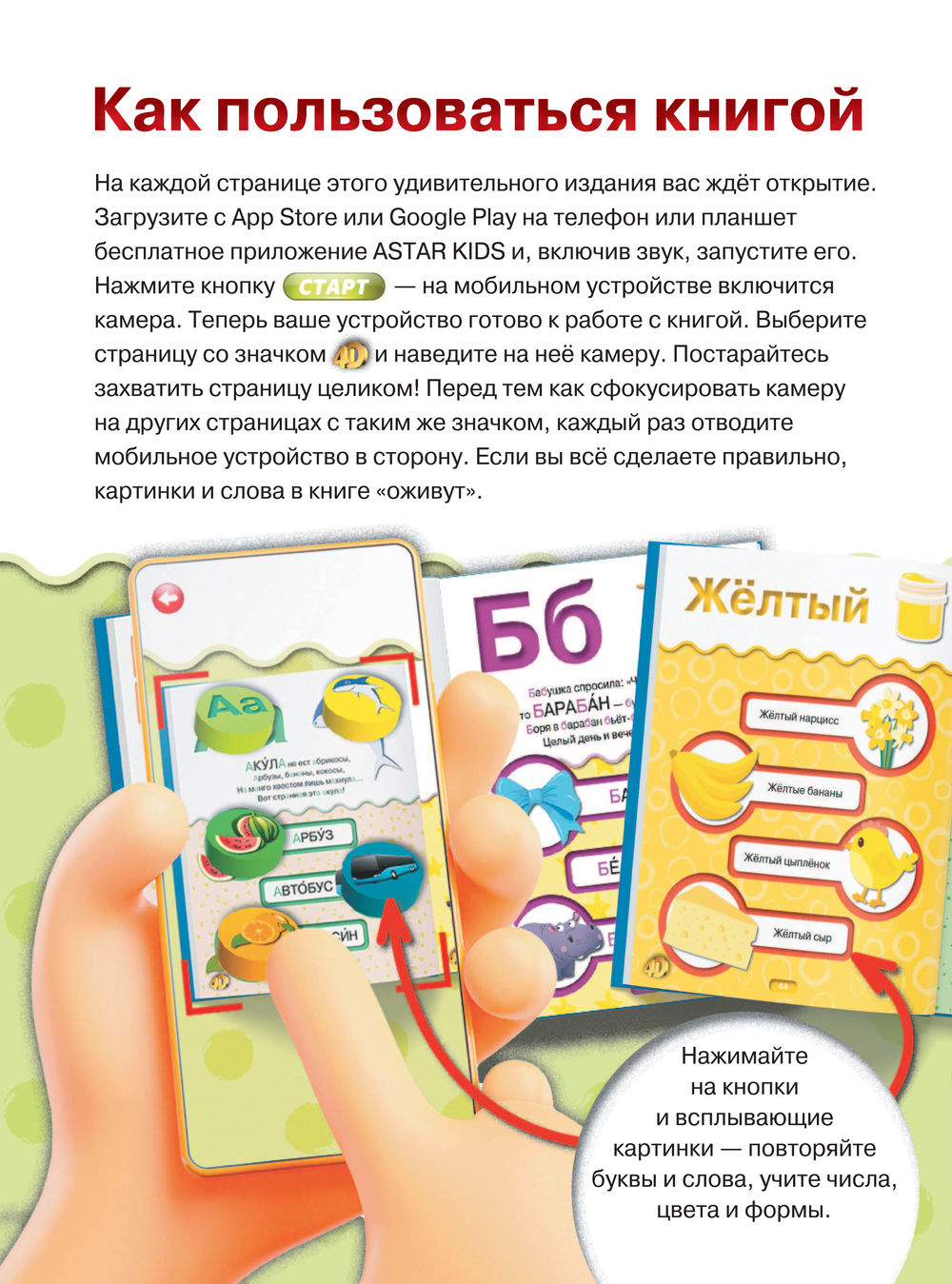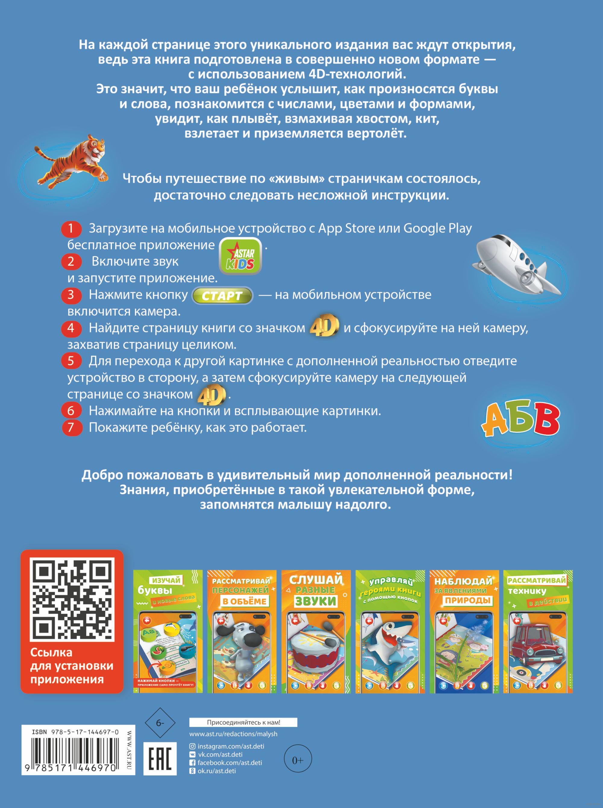 "Первая книга малыша 4D" – уникальное издание, ведь оно подготовлено с использованием дополненной реальности. Достаточно навести на страницу мобильное устройство, и она оживёт: зазвучат буквы и коротенькие рассказы, начнут двигаться звери и машинки. А это значит, что ваш ребёнок сможет заниматься по ней самостоятельно. Нажимая на кнопки и слушая познавательные аудиозаписи, малыш выучит буквы и слова, числа, цвета и формы, познакомится с животным миром и полезными машинами, запомнит весёлые стихотворения.