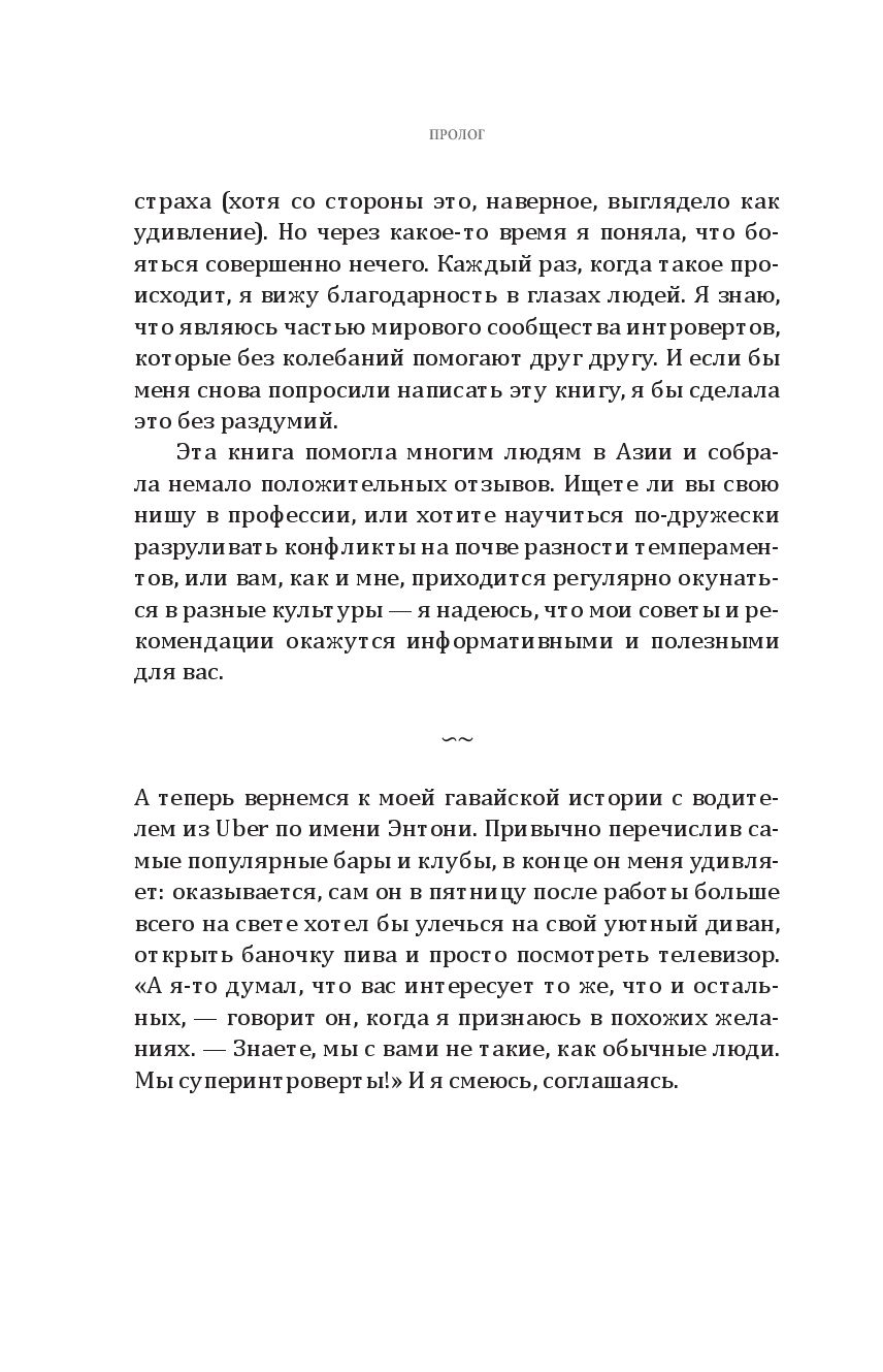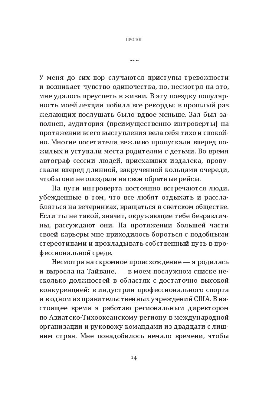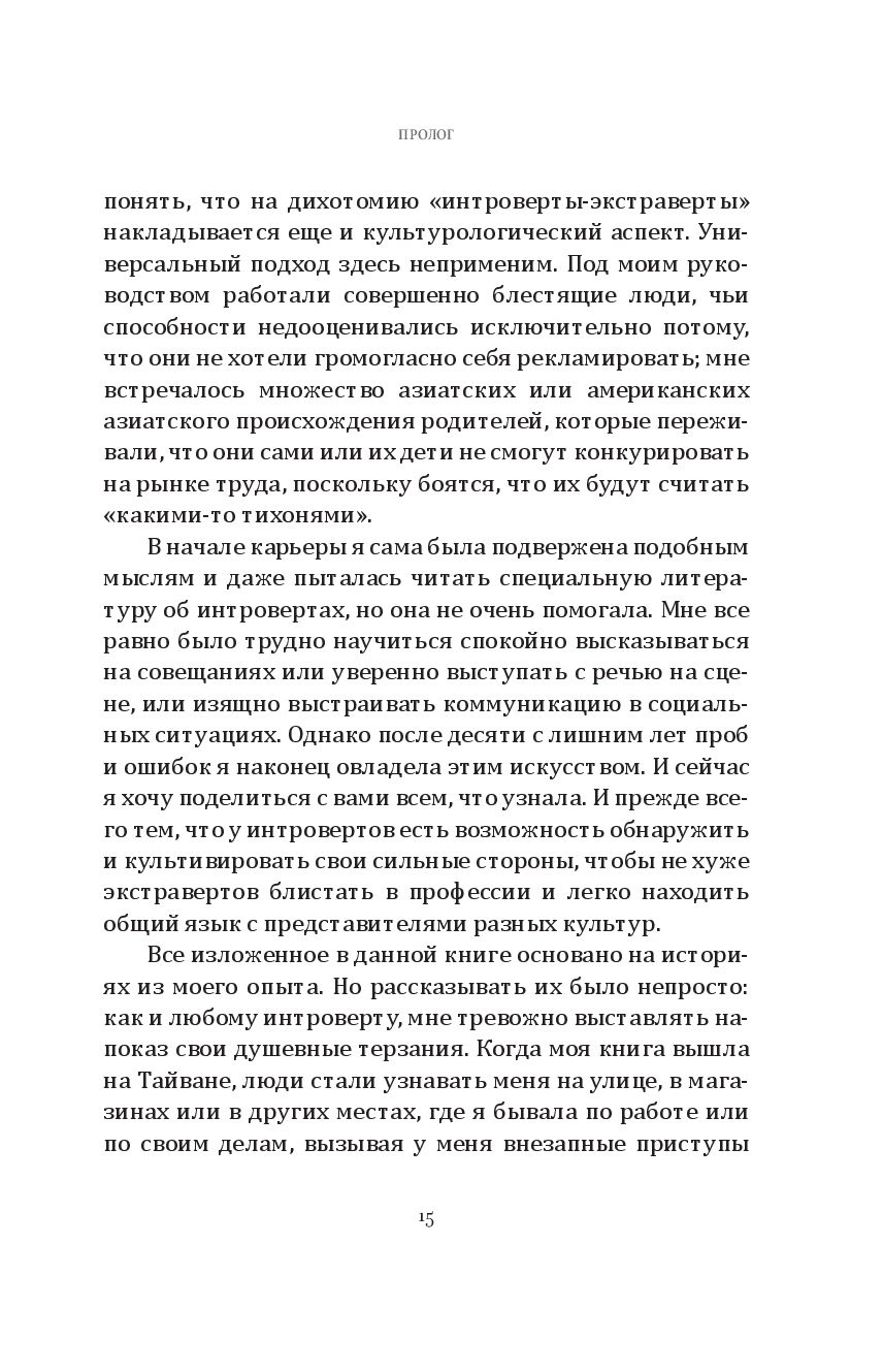 Вместо того чтобы ломать и переделывать себя, она научилась принимать свою интровертность, превратив её из недостатка в силу, позволившую добиться высоких целей и преуспеть в задачах, перед которыми пасовали её коллеги-экстраверты. Она подсказывает замкнутым людям, как искать подходящую работу, как преодолевать дополнительные трудности из-за языкового барьера и культурологических различий, как справляться с вызовами светских мероприятий и деловых презентаций, оборачивая в свою пользу особые лидерские качества своего психотипа. Эта книга – отчасти мемуары, отчасти руководство по профессиональному росту – даёт интровертам инструменты для понимания того, как им выстраивать взаимоотношения, продвигаться по карьерной лестнице, находить общий язык с коллегами и проводить время в окружении экстравертов, никем не притворяясь и не жертвуя собственным чувством комфорта.