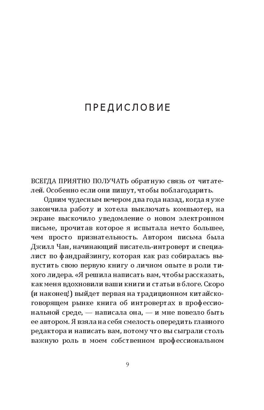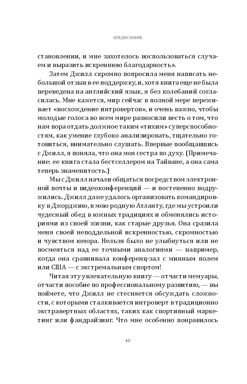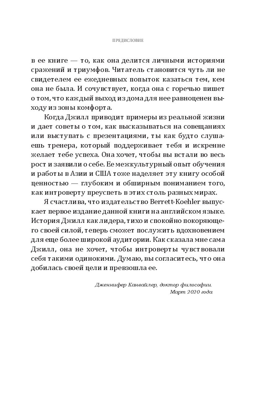 Вместо того чтобы ломать и переделывать себя, она научилась принимать свою интровертность, превратив её из недостатка в силу, позволившую добиться высоких целей и преуспеть в задачах, перед которыми пасовали её коллеги-экстраверты. Она подсказывает замкнутым людям, как искать подходящую работу, как преодолевать дополнительные трудности из-за языкового барьера и культурологических различий, как справляться с вызовами светских мероприятий и деловых презентаций, оборачивая в свою пользу особые лидерские качества своего психотипа. Эта книга – отчасти мемуары, отчасти руководство по профессиональному росту – даёт интровертам инструменты для понимания того, как им выстраивать взаимоотношения, продвигаться по карьерной лестнице, находить общий язык с коллегами и проводить время в окружении экстравертов, никем не притворяясь и не жертвуя собственным чувством комфорта.
