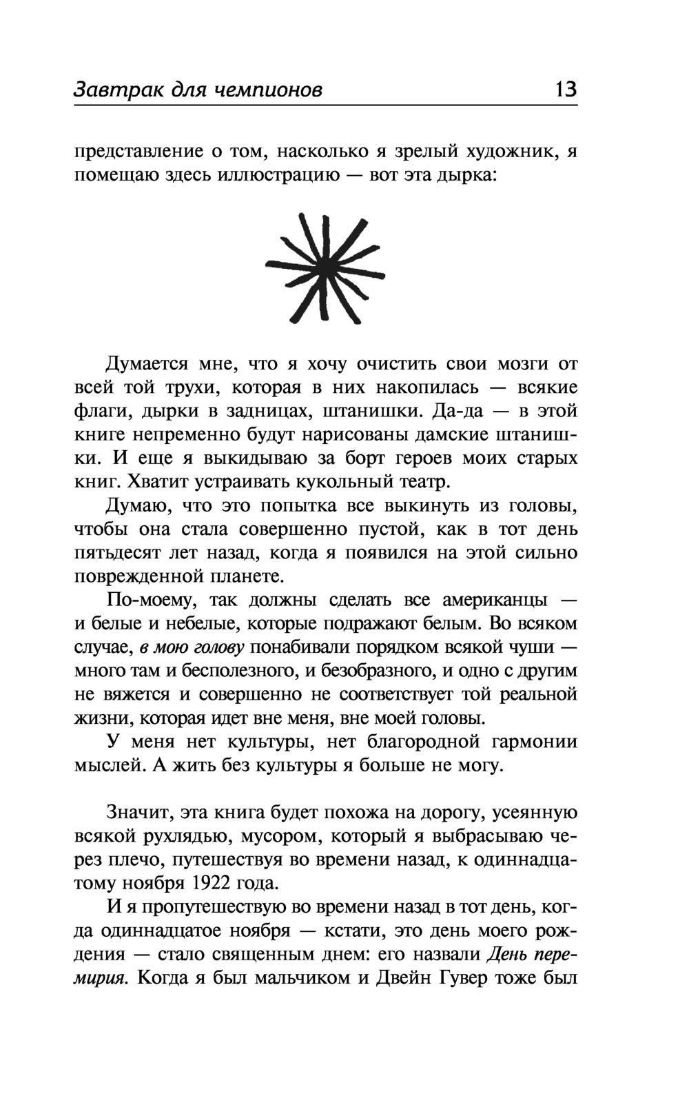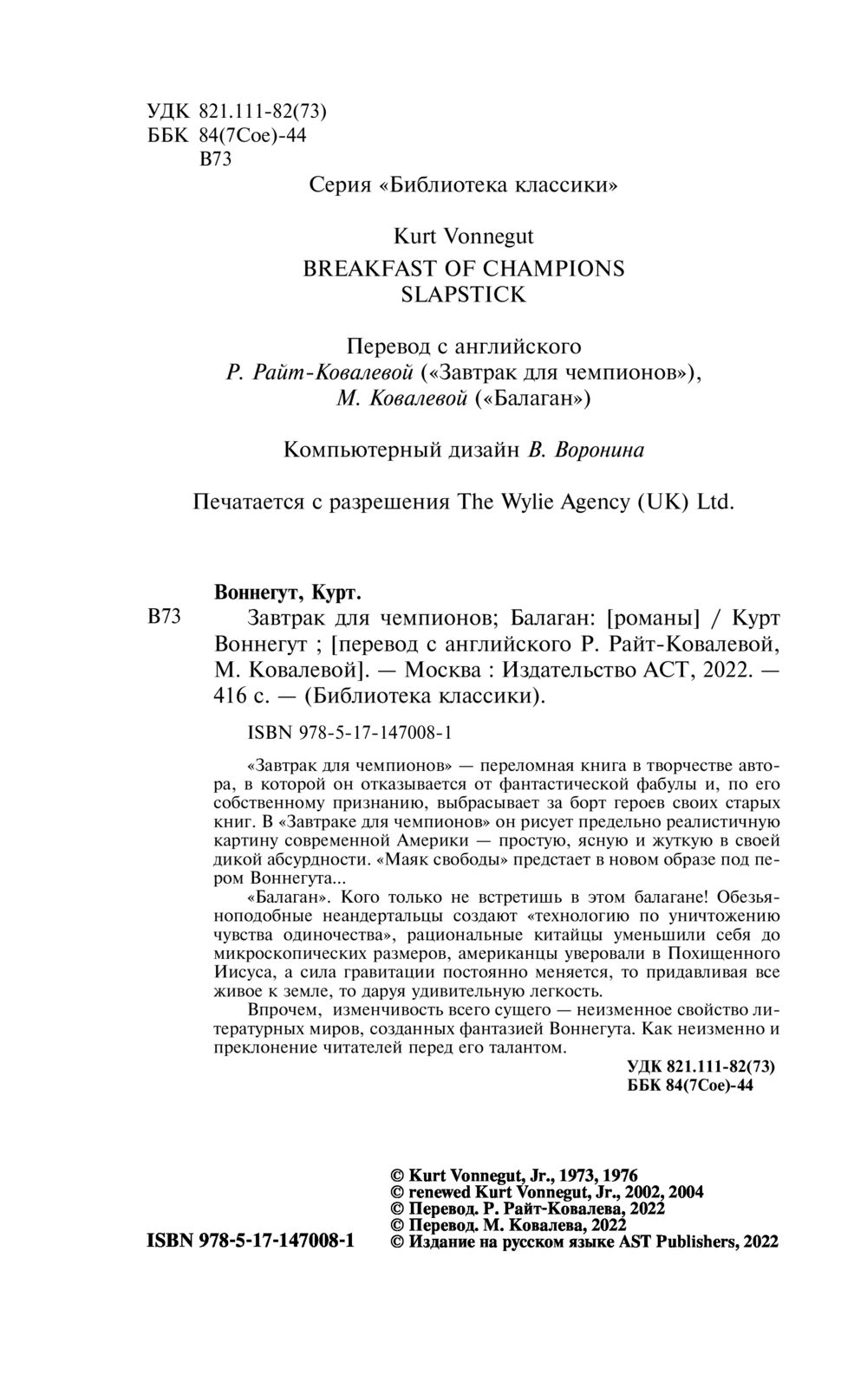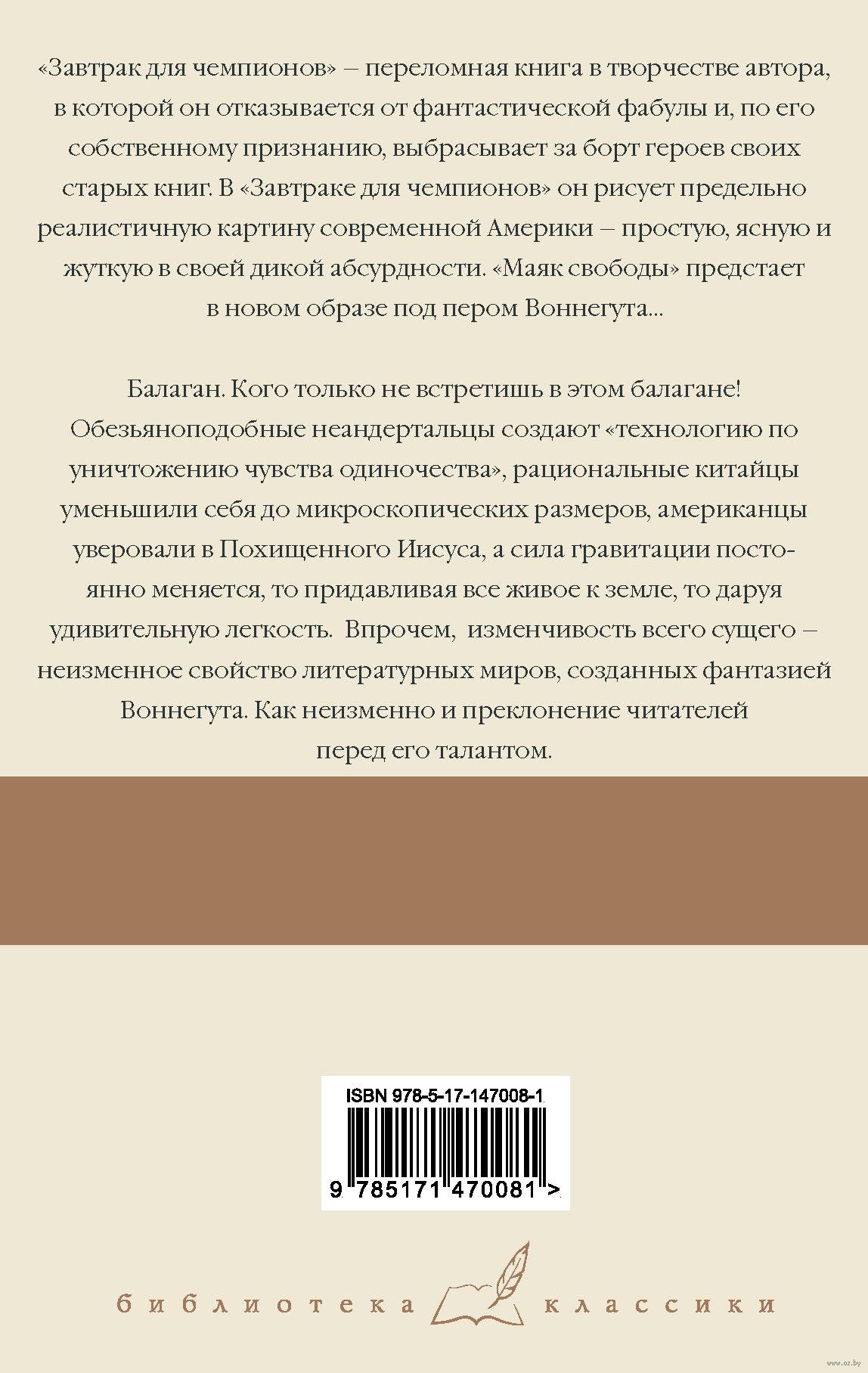 Переломная книга в творчестве автора, в которой он отказывается от фантастической фабулы и, по его собственному признанию, выбрасывает за борт героев своих старых книг. В "Завтраке для чемпионов" он рисует предельно реалистичную картину современной Америки – простую, ясную и жуткую в своей дикой абсурдности. "Маяк свободы" предстает в новом образе под пером Воннегута...