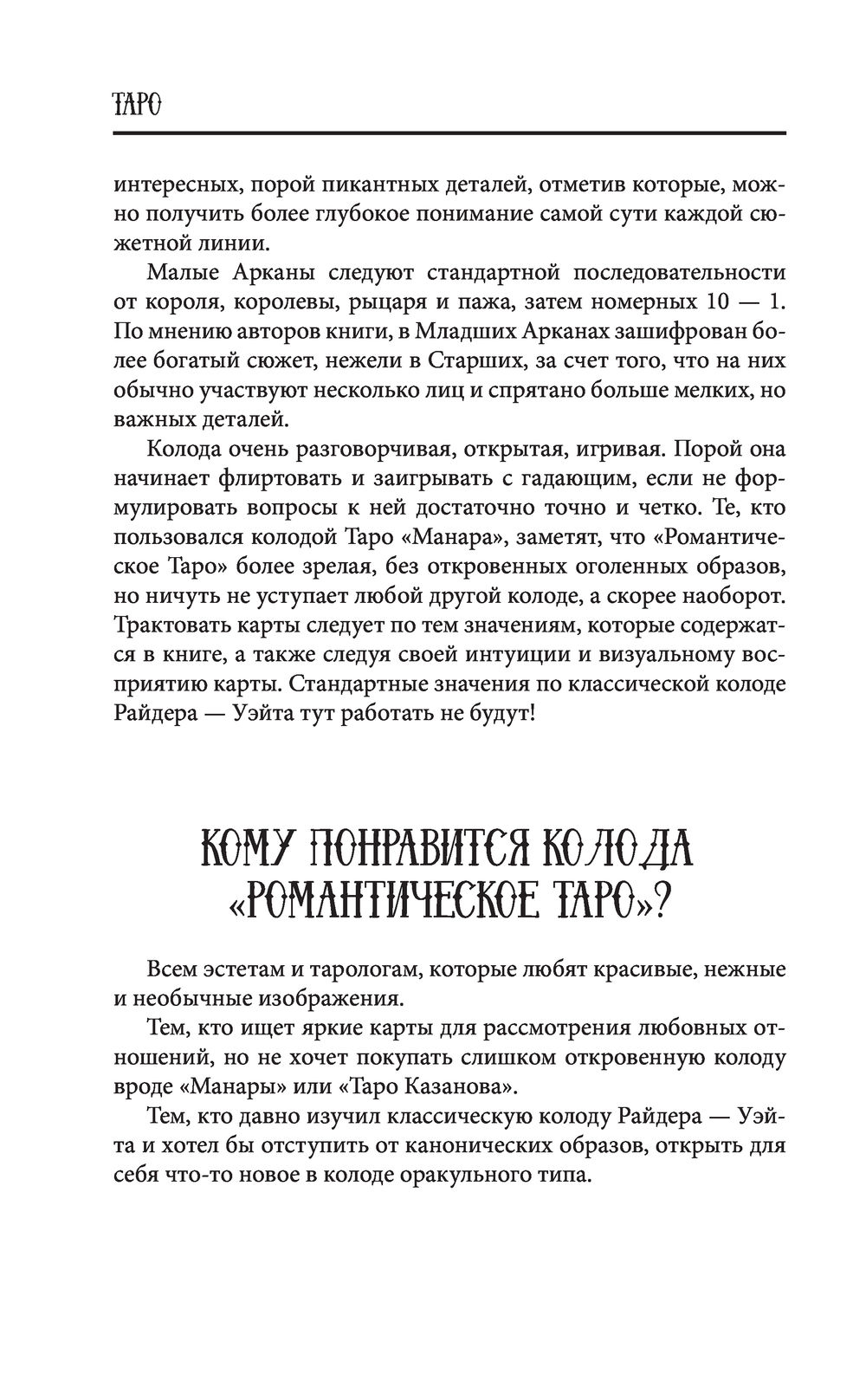 Эта книга – плод многих лет исследовательской и консультативной работы опытного таролога Дианы Дорн. Диана подробно рассказывает читателям о колоде "Романтическое Таро". Главный ориентир этого издания – в исследовании взаимоотношений романтического характера и всего, что связано с темой любви, привязанности и симпатии. Колодой можно воспользоваться как вспомогательной, показывающей сквозь призму традиционных архетипов романтические отношения, взаимодействие полов и любовные авантюры. Ни одна другая колода карт, используемая тарологами, не показывает и не улавливает так детали отношений между людьми, как "Романтическое Таро".
