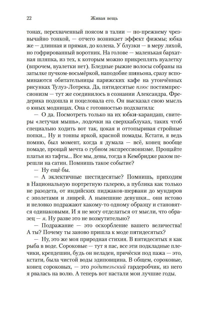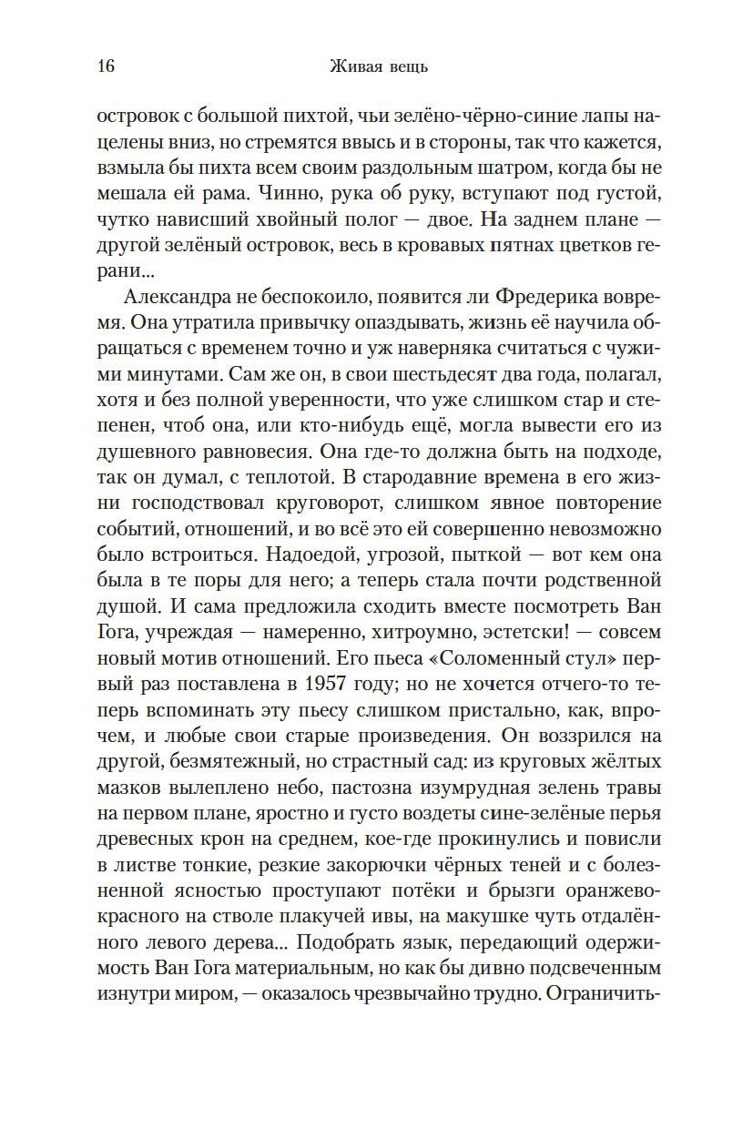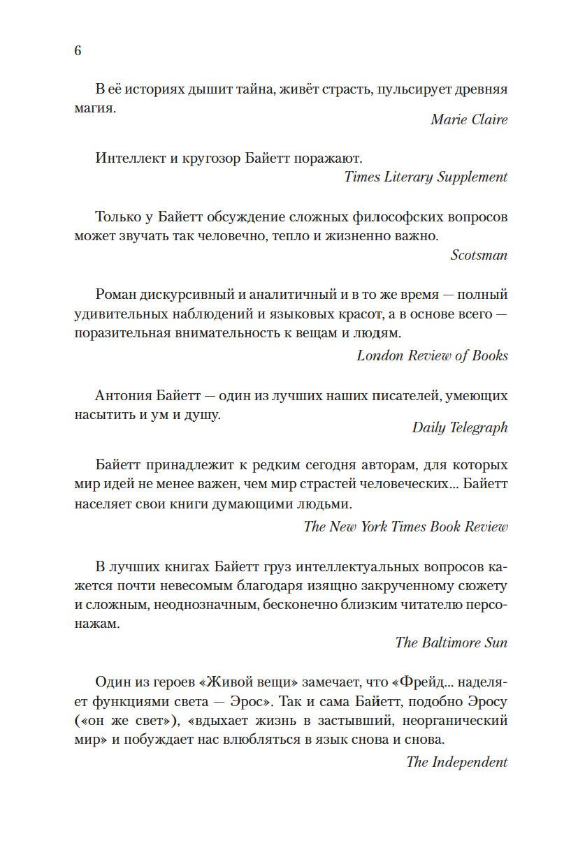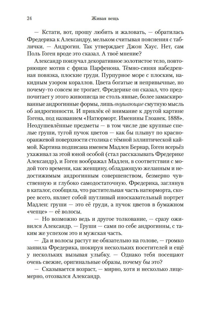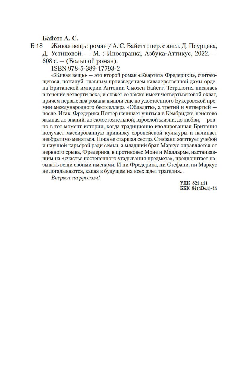 "Живая вещь" – это второй роман "Квартета Фредерики", считающегося, пожалуй, главным произведением кавалерственной дамы Ордена Британской империи Антонии Сьюзен Байетт. Тетралогия писалась в течение четверти века, и сюжет ее также имеет четвертьвековой охват, причем первые два романа вышли еще до удостоенного Букеровской премии международного бестселлера "Обладать", а третий и четвертый – после.