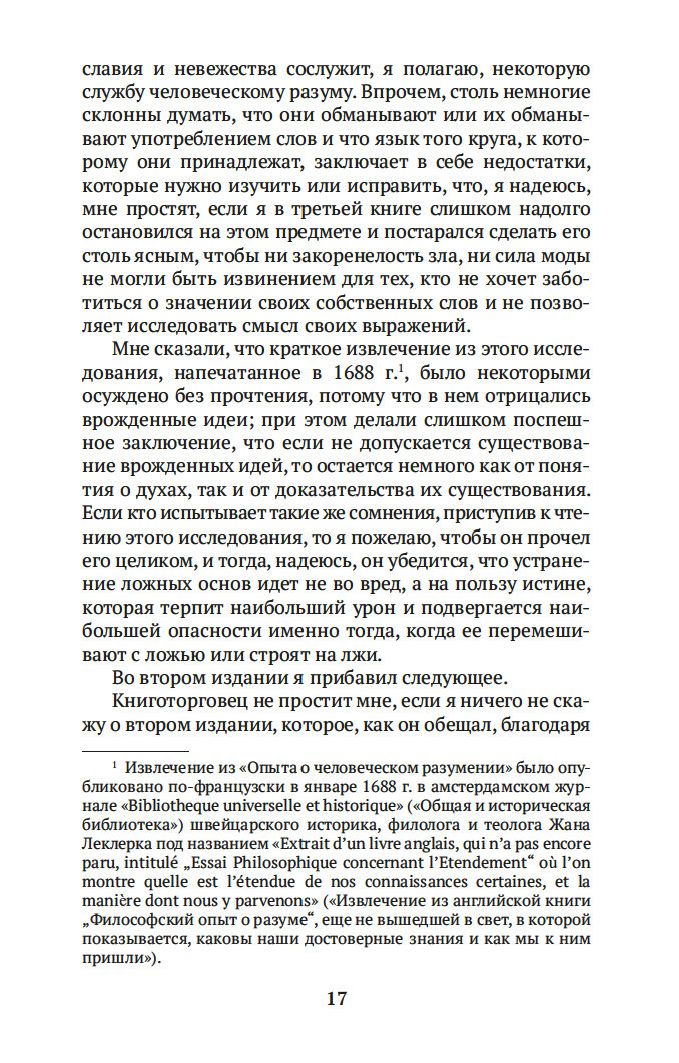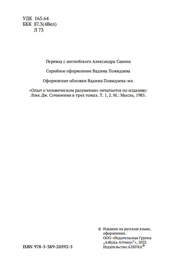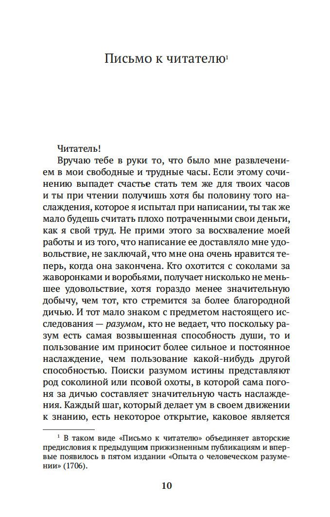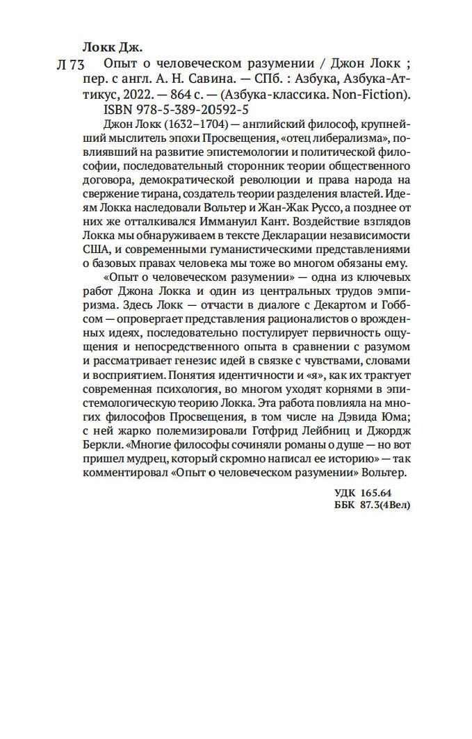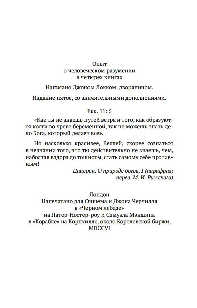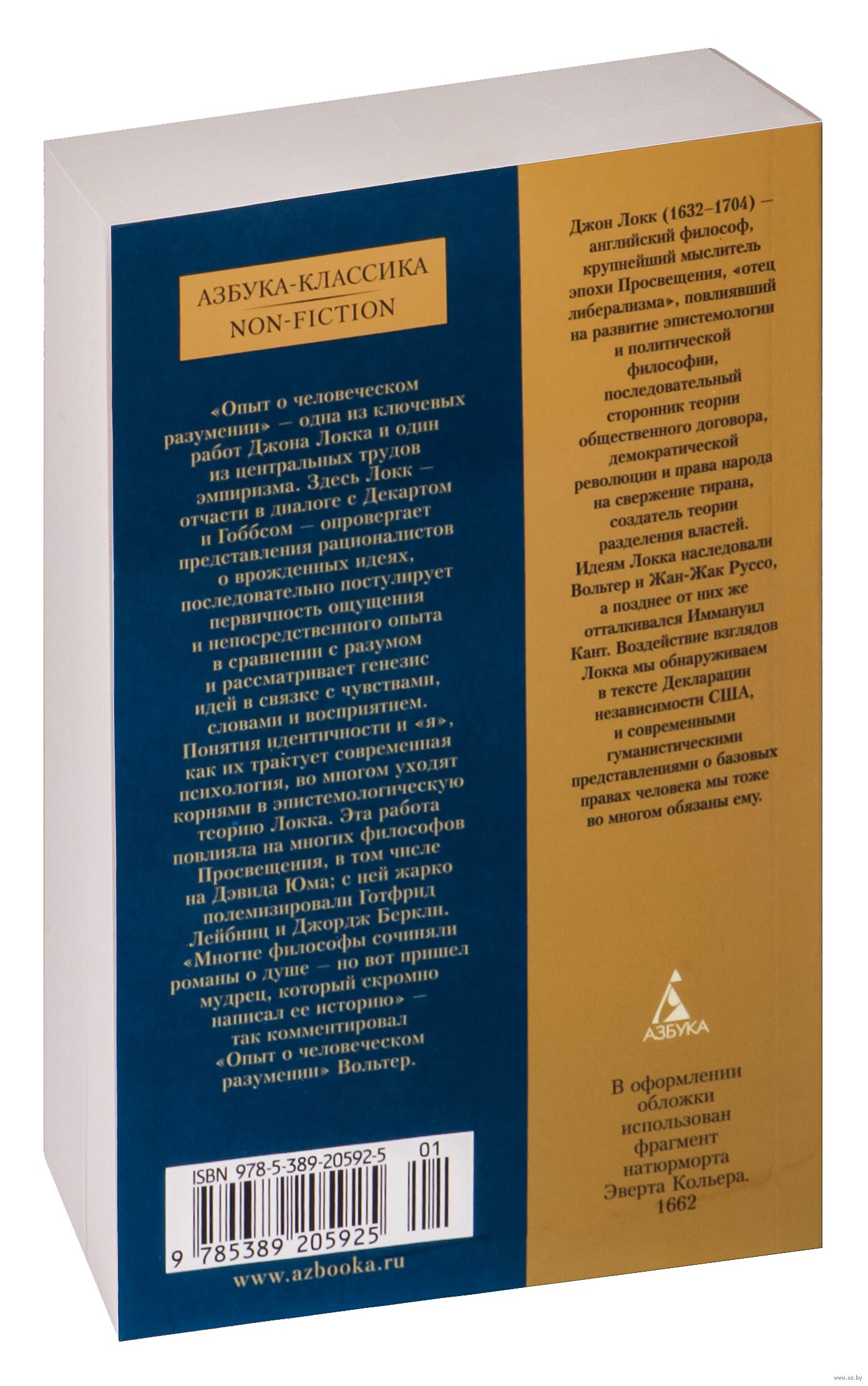 "Опыт о человеческом разумении" – одна из ключевых работ Джона Локка и один из центральных трудов эмпиризма. Здесь Локк – отчасти в диалоге с Декартом и Гоббсом – опровергает представления рационалистов о врожденных идеях, последовательно постулирует первичность ощущения и непосредственного опыта в сравнении с разумом и рассматривает генезис идей в связке с чувствами, словами и восприятием. Понятия идентичности и "я", как их трактует современная психология, во многом уходят корнями в эпистемологическую теорию Локка. Эта работа повлияла на многих философов Просвещения, в том числе на Дэвида Юма; с ней жарко полемизировали Готфрид Лейбниц и Джордж Беркли. "Многие философы сочиняли романы о душе – но вот пришел мудрец, который скромно написал ее историю", – так комментировал "Опыт о человеческом разумении" Вольтер.