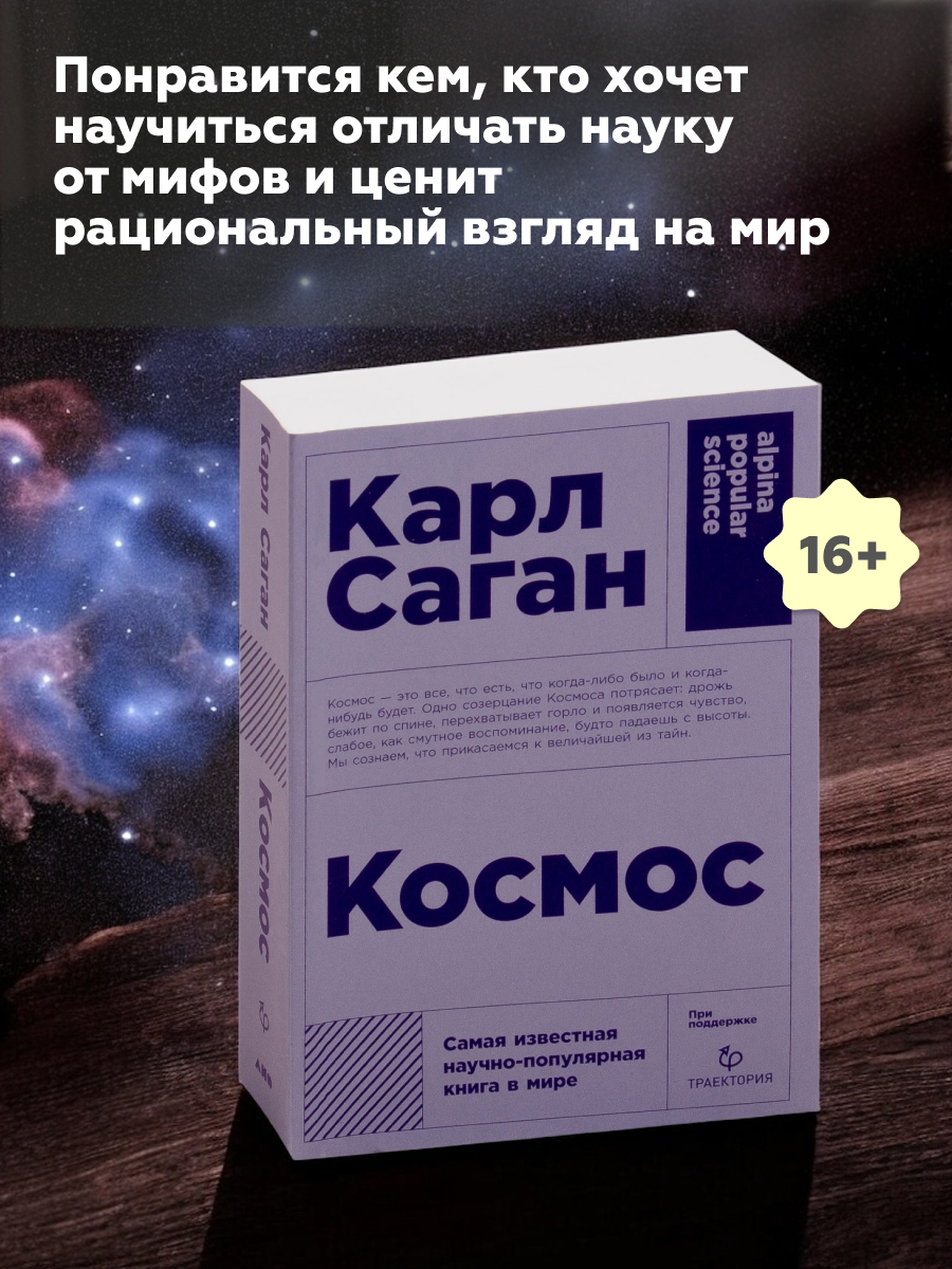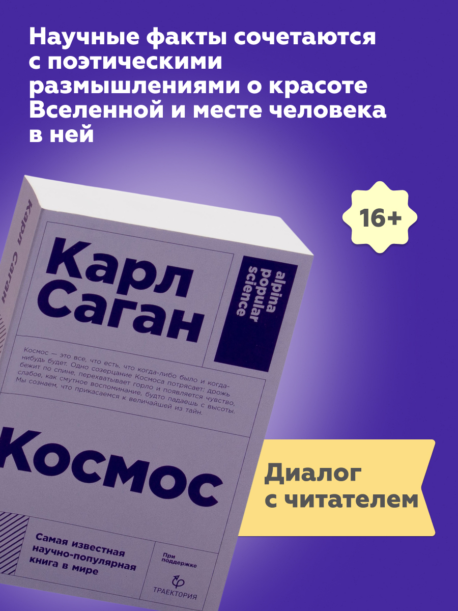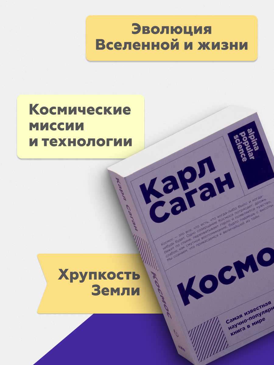 "Космос" – одна из самых продаваемых научно-популярных книг всех времен. В ней прослеживается почти четырнадцать миллиардов лет космической эволюции, превративших материю в сознание, и исследуются такие темы, как происхождение жизни, человеческий мозг, египетские иероглифы, миссии космических кораблей, смерть Солнца, эволюция галактик, а также обстоятельства и личности, которые помогли сформировать современную науку.
