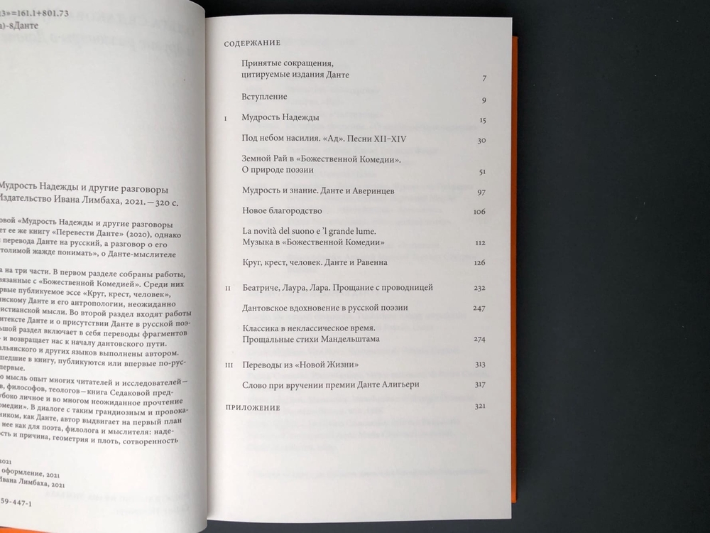 Книга Ольги Седаковой "Мудрость Надежды и другие разговоры о Данте" продолжает ее же книгу "Перевести Данте" (2020), однако это уже не вопросы перевода Данте на русский, а разговор о его "врожденной и неутолимой жажде понимать", о Данте-мыслителе и поэте-теологе.
