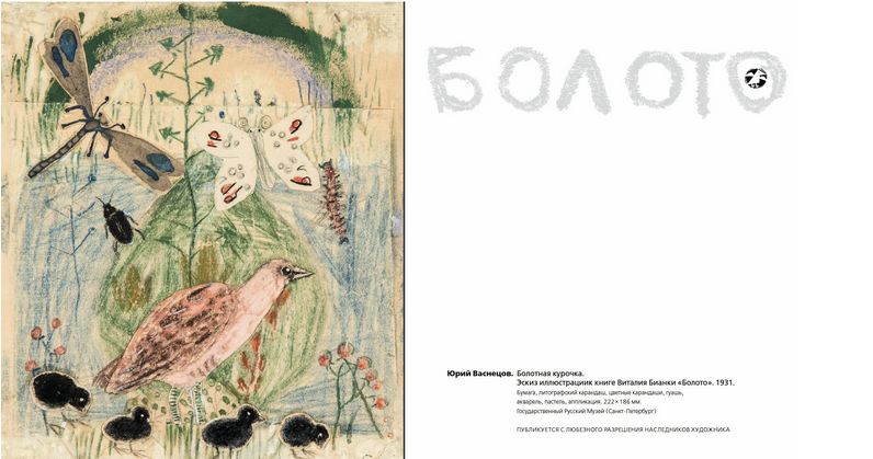Книга "Болото" началась именно с рисунков, все они созданы Васнецовым с натуры. Сочинил историю знаток природы Виталий Бианки. Но слова в "Болоте" выглядят дополнением к иллюстрациям, а сама книга может считаться авторским проектом Васнецова.