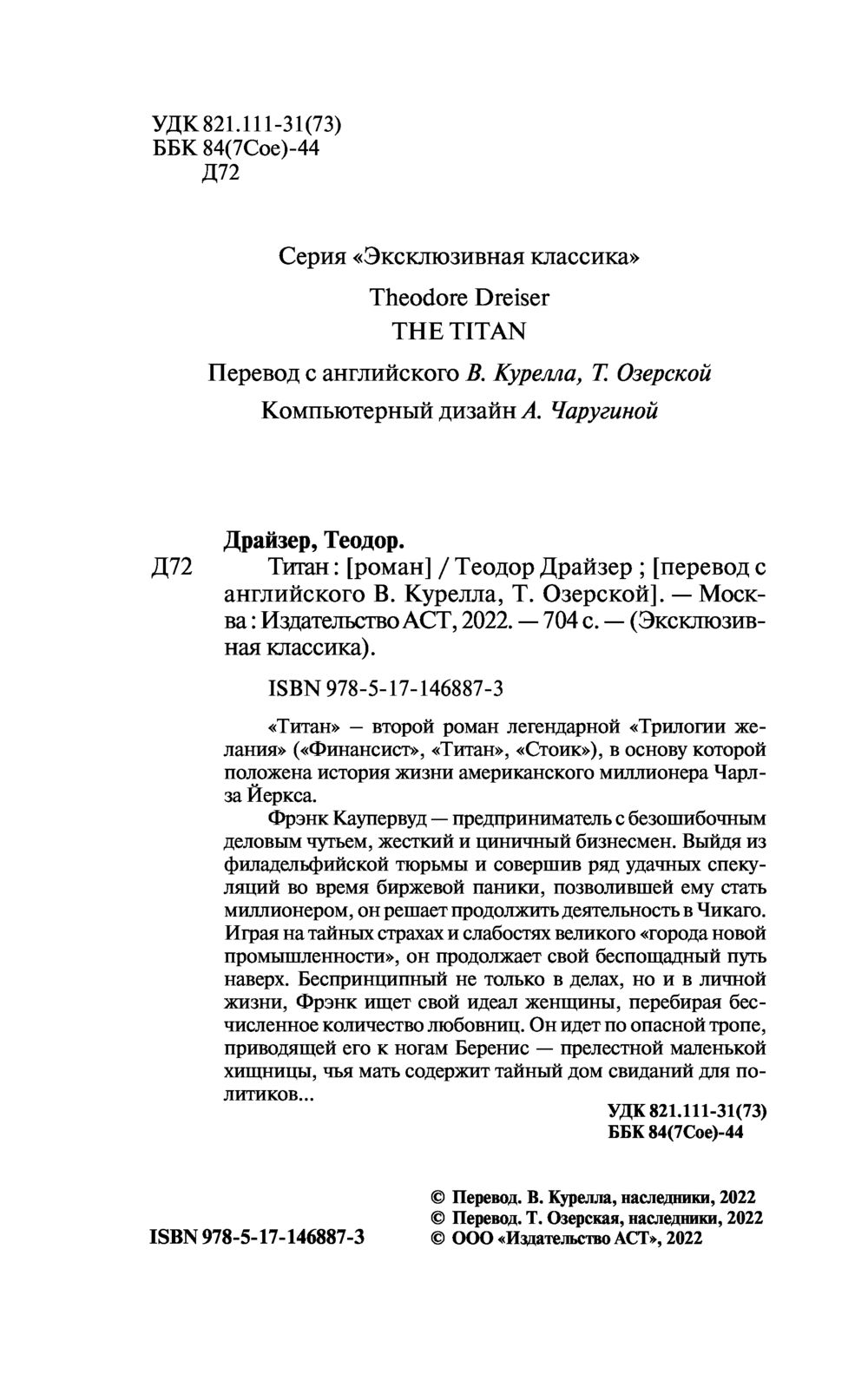 "Титан" – второй роман легендарной "Трилогии желания" ("Финансист", "Титан", "Стоик"), в основу которой положена история жизни американского миллионера Чарлза Йеркса.