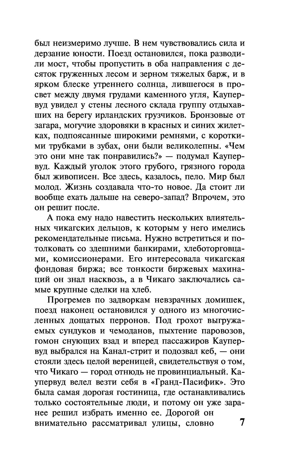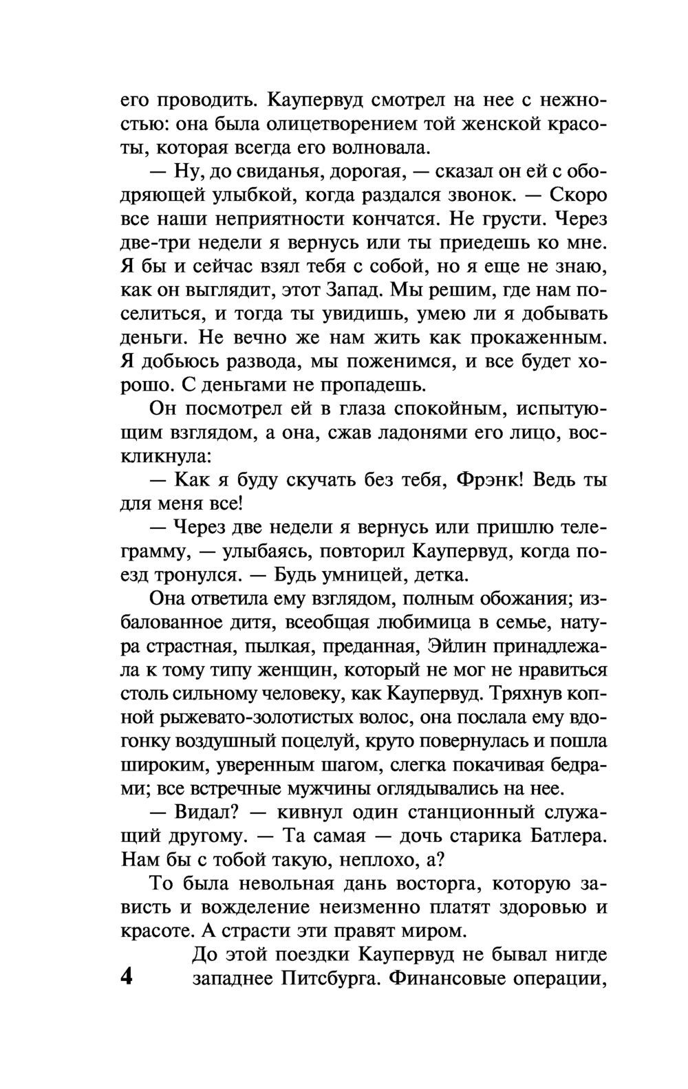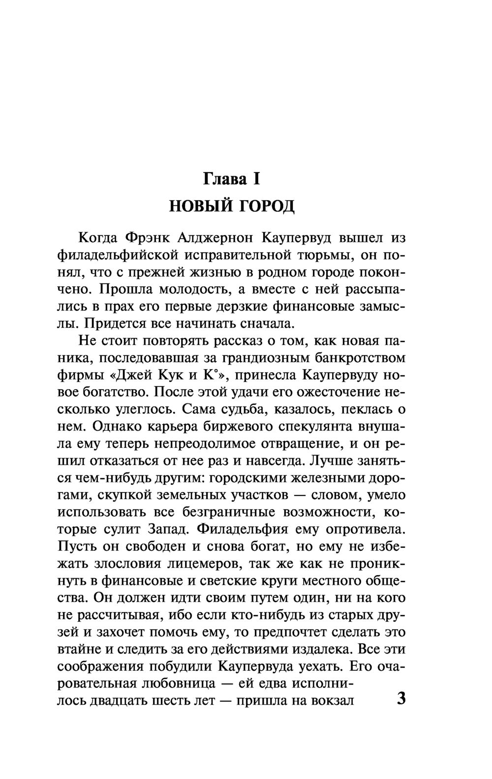Фрэнк Каупервуд – предприниматель с безошибочным деловым чутьем, жесткий и циничный бизнесмен. Выйдя из филадельфийской тюрьмы и совершив ряд удачных спекуляций во время биржевой паники, позволивших ему стать миллионером, он решает продолжить деятельность в Чикаго. Играя на тайных страхах и слабостях великого "города новой промышленности", он продолжает свой беспощадный путь наверх. Беспринципный не только в делах, но и в личной жизни, Фрэнк ищет свой идеал женщины, перебирая бесчисленное количество любовниц. Он идет по опасной тропе, приводящей его к ногам Беренис – прелестной маленькой хищницы, чья мать содержит тайный дом свиданий для политиков...