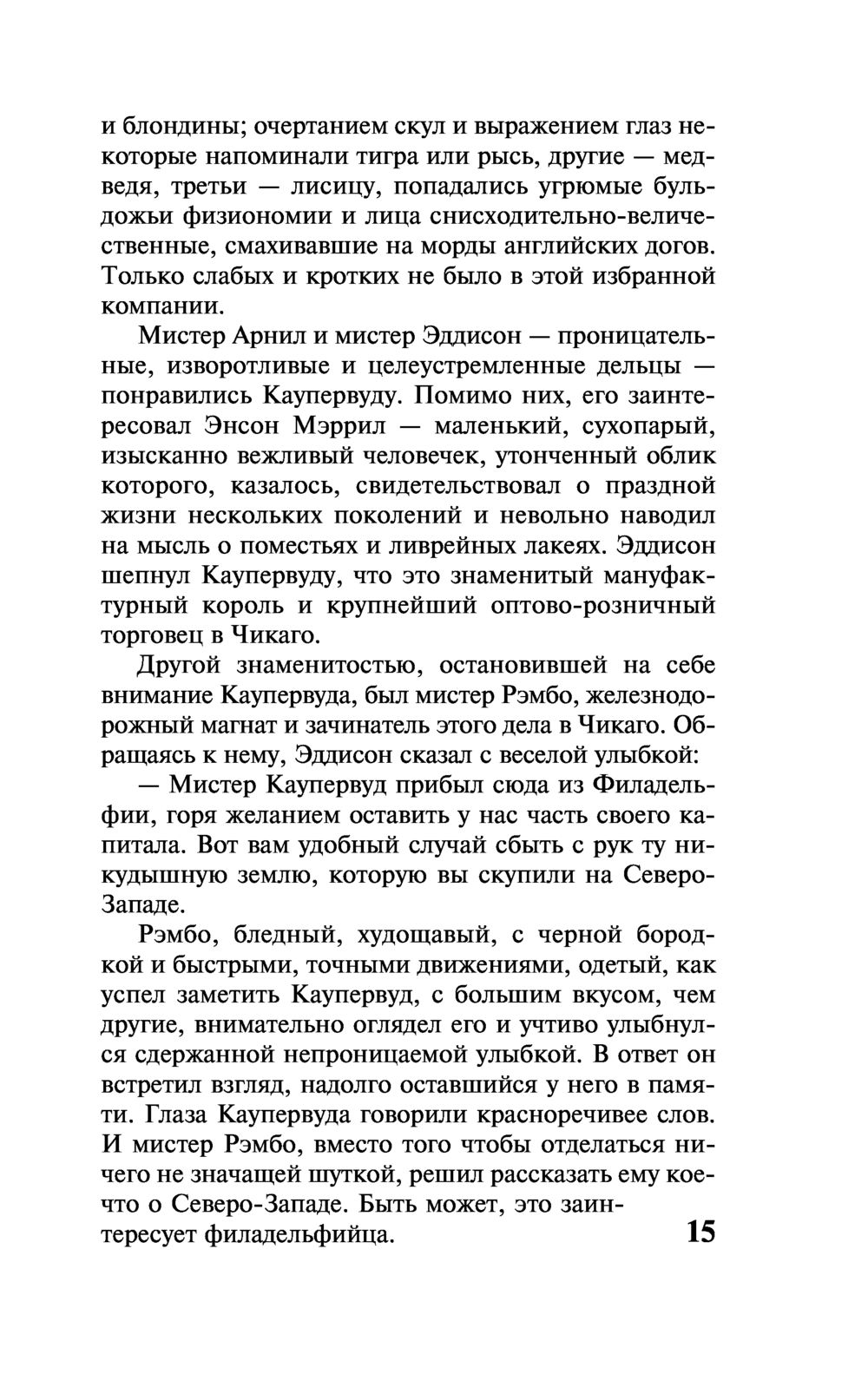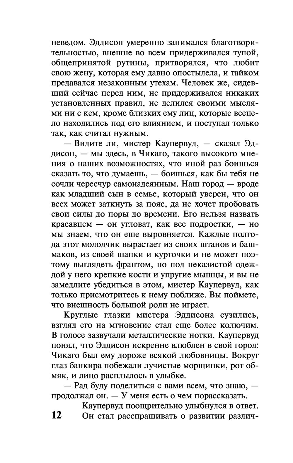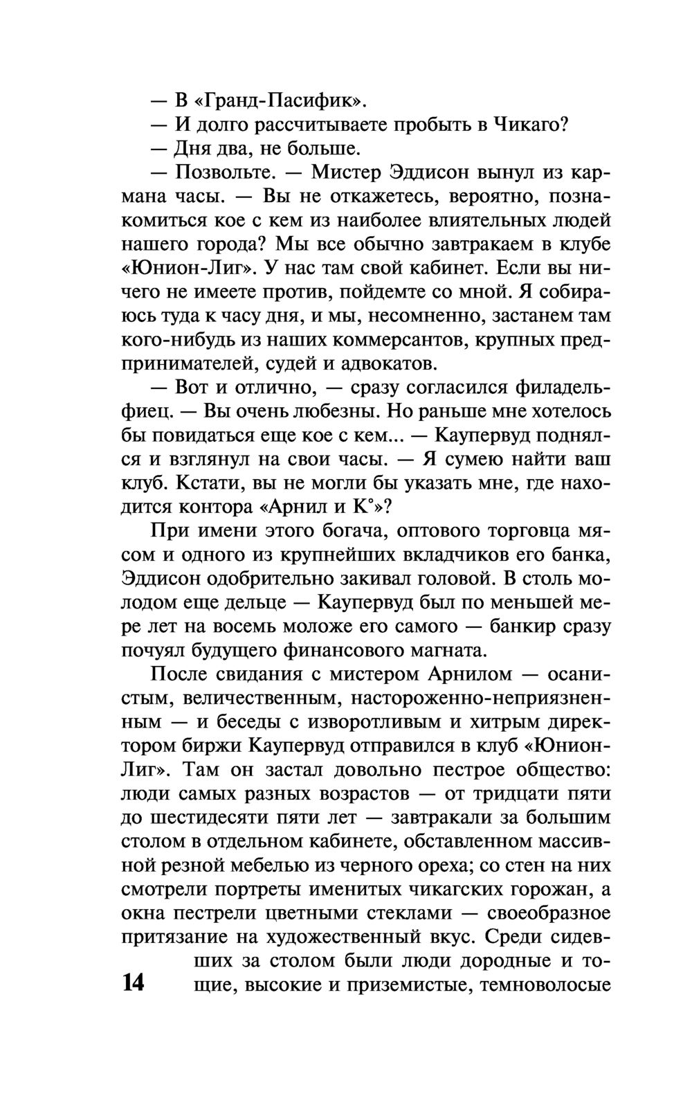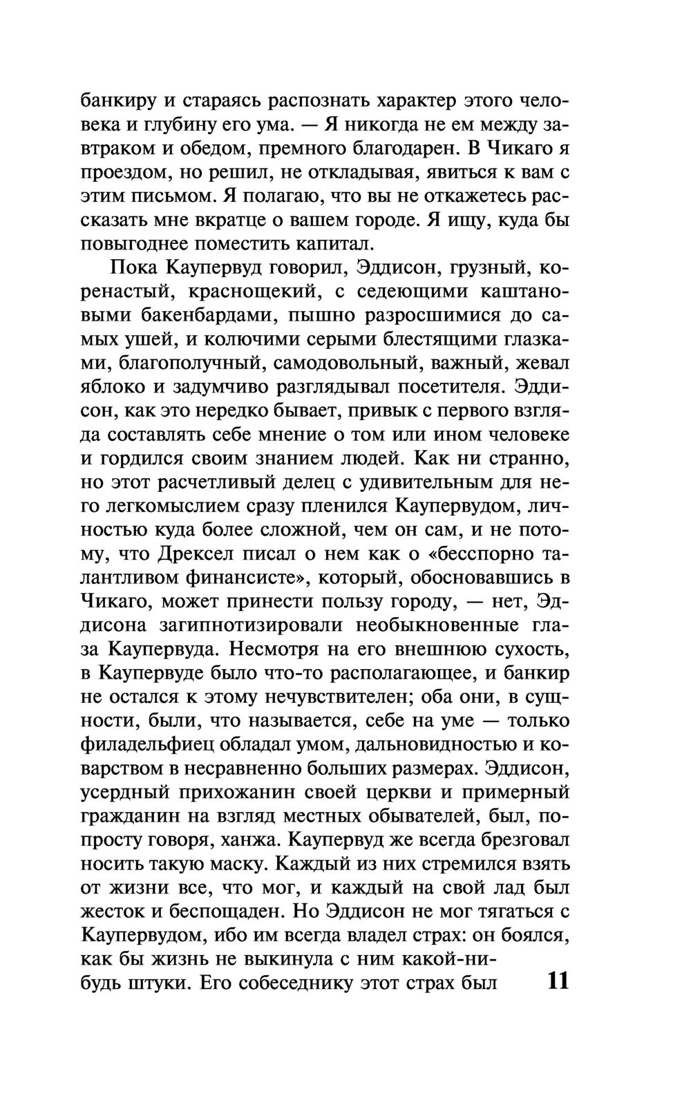 Фрэнк Каупервуд – предприниматель с безошибочным деловым чутьем, жесткий и циничный бизнесмен. Выйдя из филадельфийской тюрьмы и совершив ряд удачных спекуляций во время биржевой паники, позволивших ему стать миллионером, он решает продолжить деятельность в Чикаго. Играя на тайных страхах и слабостях великого "города новой промышленности", он продолжает свой беспощадный путь наверх. Беспринципный не только в делах, но и в личной жизни, Фрэнк ищет свой идеал женщины, перебирая бесчисленное количество любовниц. Он идет по опасной тропе, приводящей его к ногам Беренис – прелестной маленькой хищницы, чья мать содержит тайный дом свиданий для политиков...
