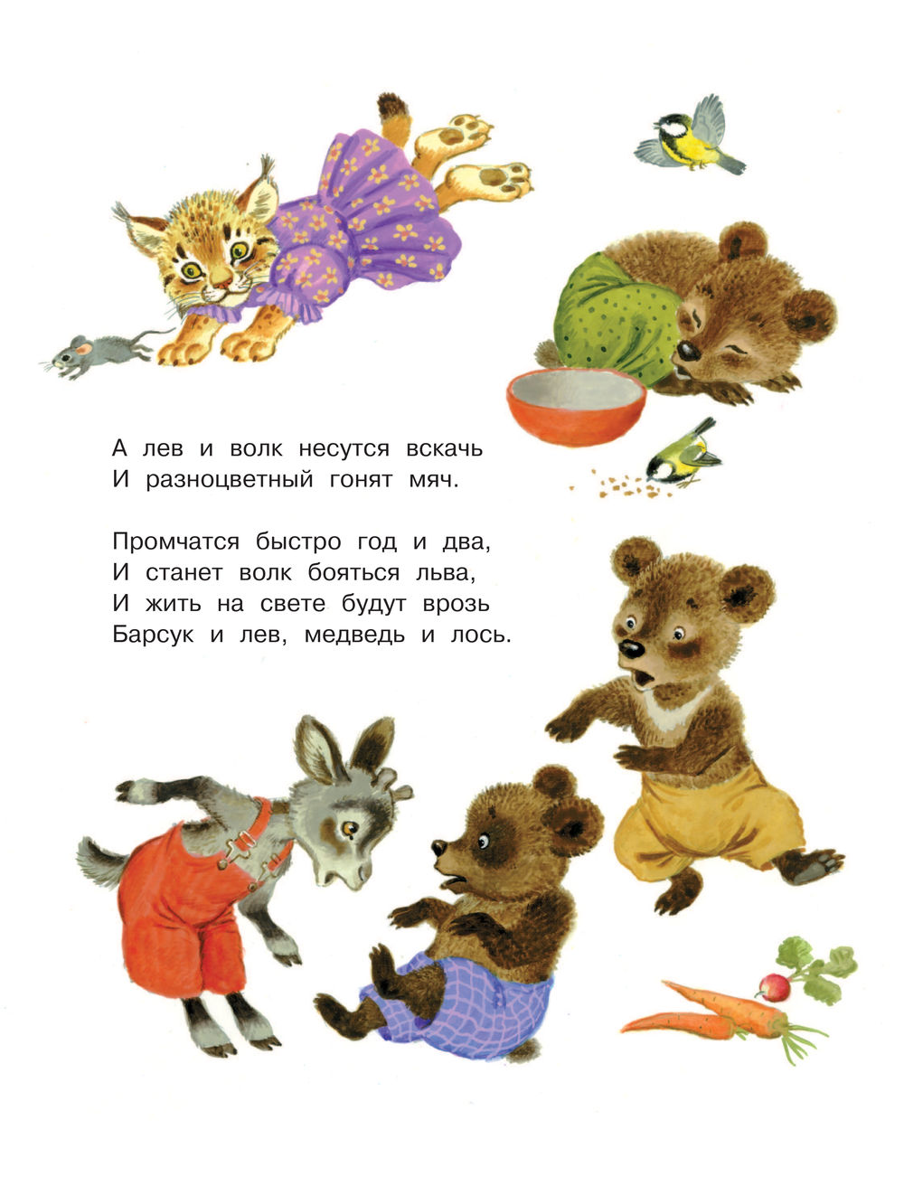 Малыши, послушав эти стихи и посмотрев картинки, познакомятся с животными, узнают, какие бывают цвета, выучат времена года и названия месяцев, запомнят весёлые коротенькие стихотворения-песенки и подружатся с главными героями сказок С. Маршака.