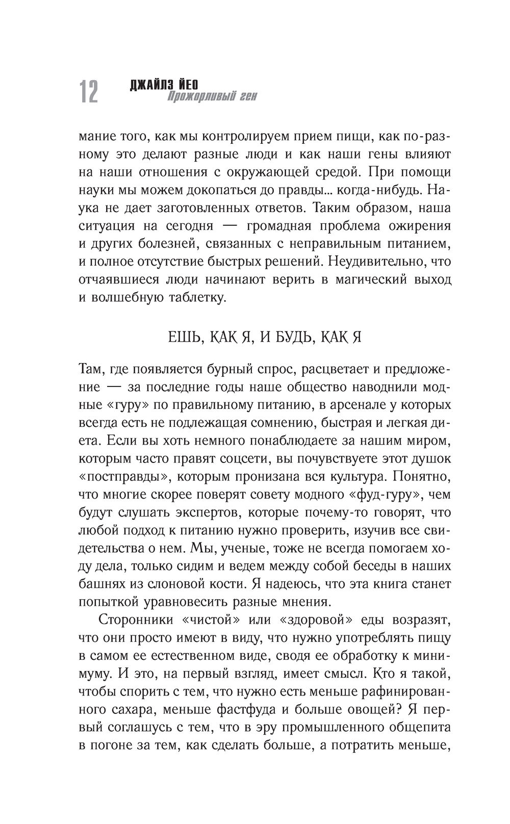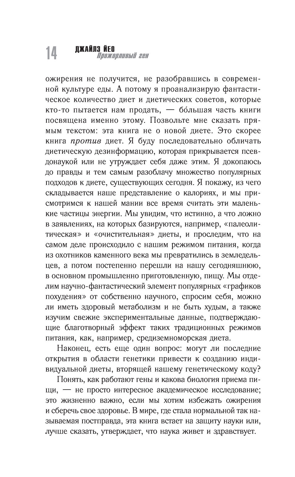 Почему человечество толстеет? Отчего некоторые едят больше других? Как вышло, что чаще всего диеты не работают? Собрав огромный массив данных, в том числе в ходе собственных многолетних генетических исследований, Джайлз Йео выступил против новомодных веяний в практике потребления пищи. Автор расскажет об истории питания, планомерно разоблачая маркетинговые уловки и лидеров мнений, щедро раздающих советы о том, как добиться стройности.