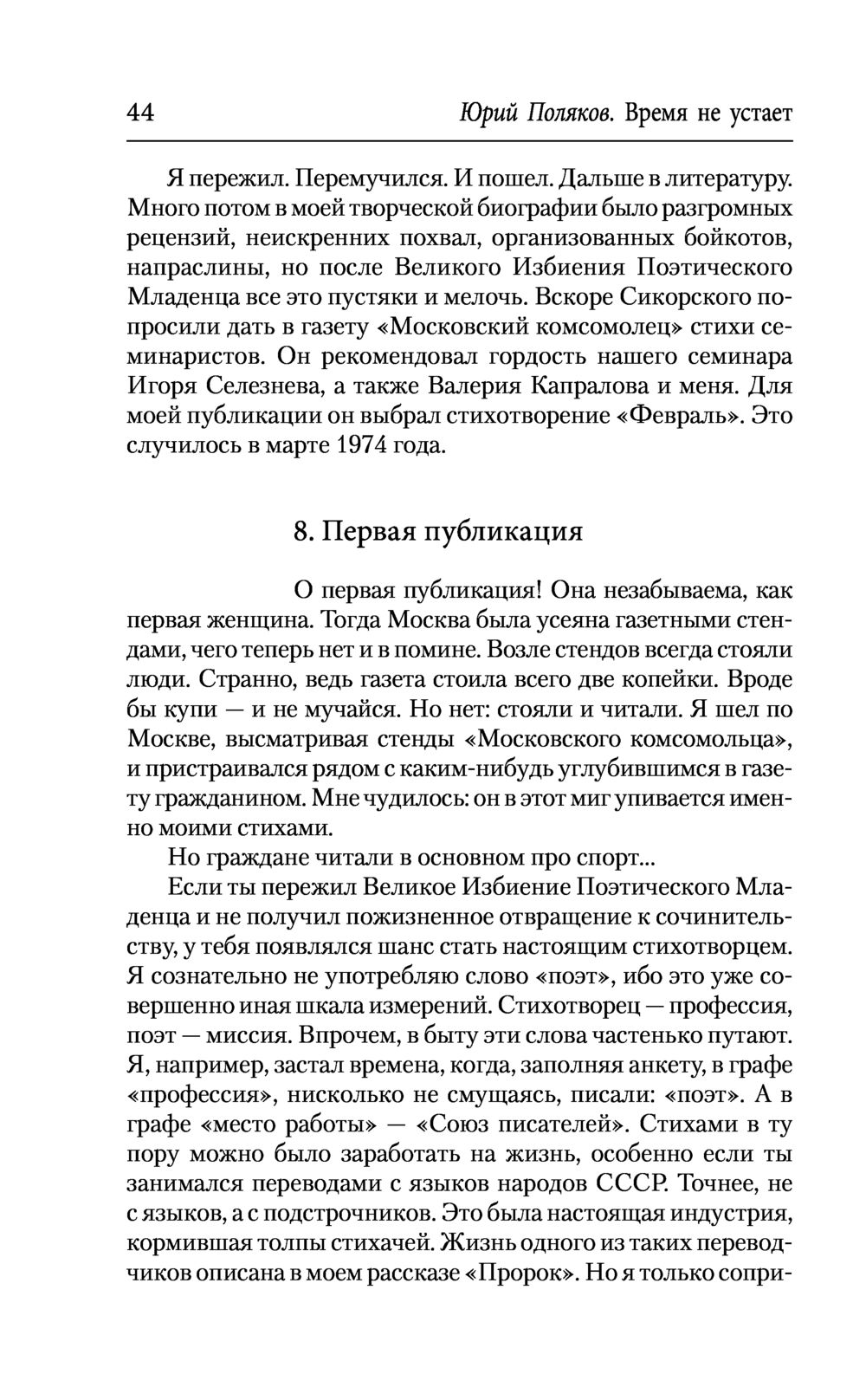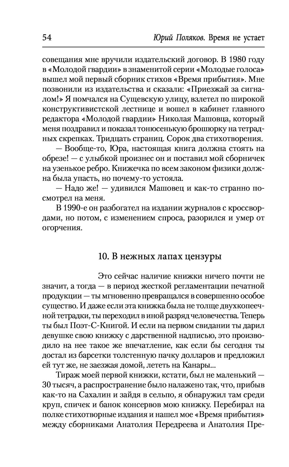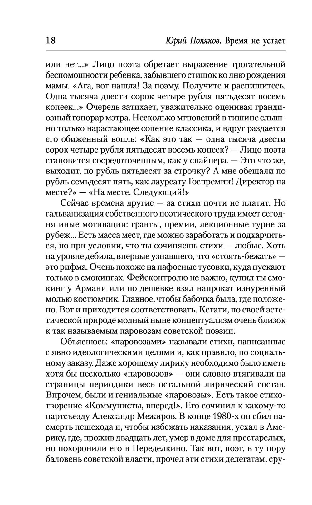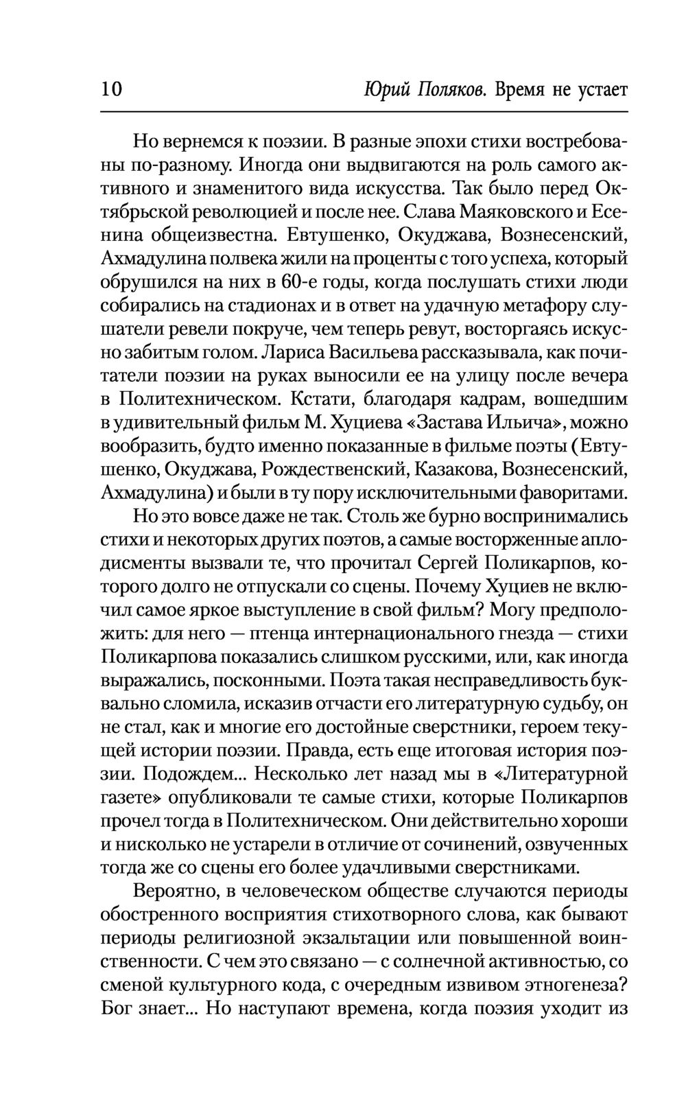 Книга "Время не устает" – последний, двенадцатый том собрания сочинений известного русского писателя Юрия Полякова, успешно работающего в разных жанрах. Он дебютировал как поэт в начале 1970-х, став одним из лидеров поколения поэтов, рожденных в пятидесятые годы. В этот том вошли стихи, сочиненные почти за полвека. Среди них – известные строфы, выходившие в периодике и включавшиеся автором в сборники, а также никогда не публиковавшиеся, хранившиеся в архиве и подготовленные специально для данного издания. Ранняя лирика Полякова принадлежит к лучшим образцам советской поэзии. Не оставят читателей равнодушными острые сатирические стихи на злобу дня, а также новые произведения, написанные зрелым мастером в последние годы. В книгу также включена известная работа Полякова о фронтовой поэзии "Между двумя морями", посвященная жизни и творчеству Георгия Суворова (1919-1944).