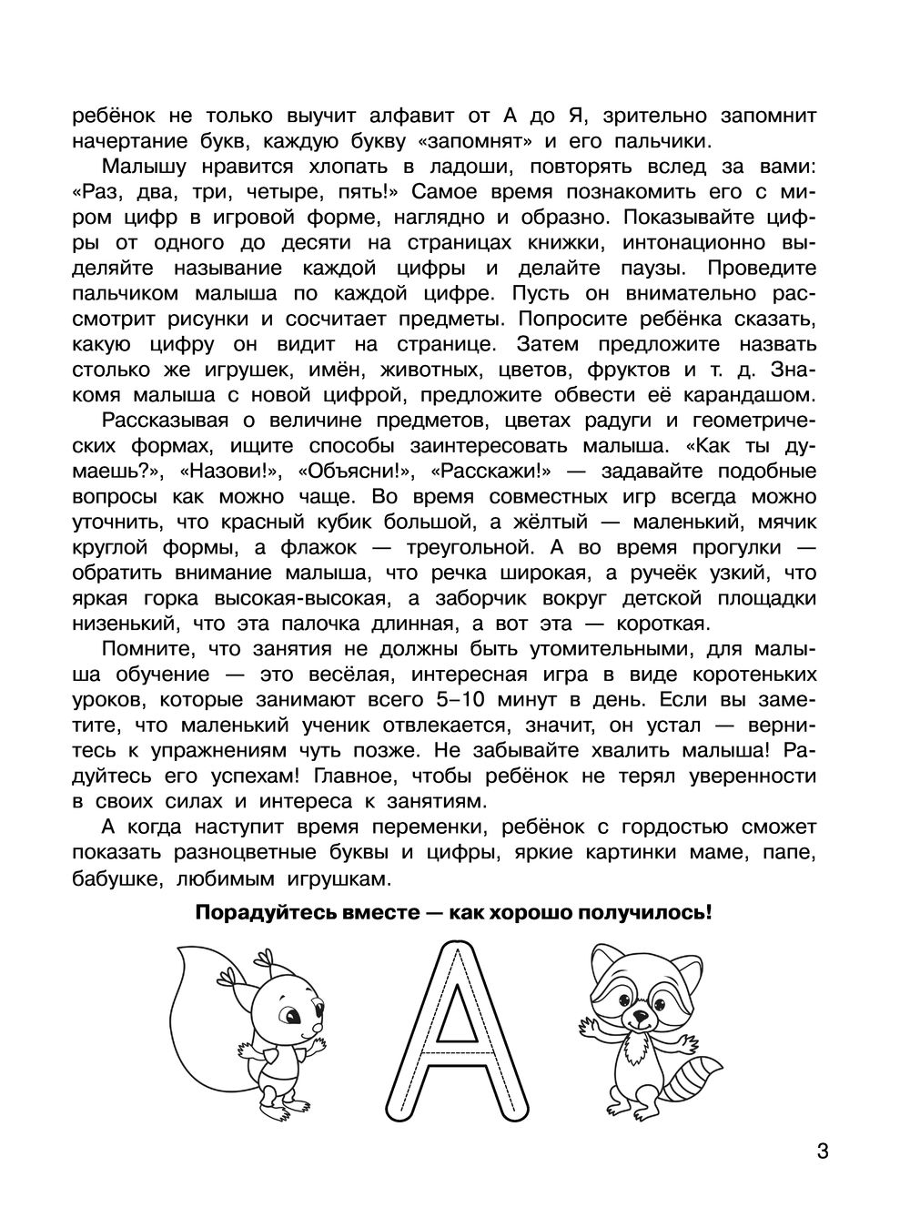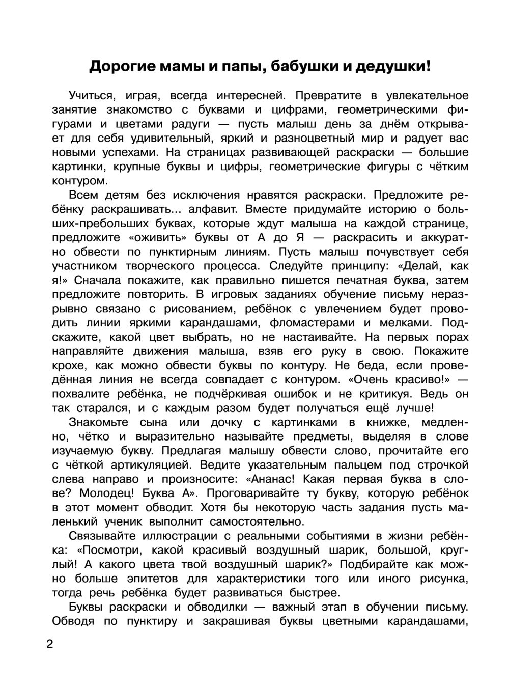 "Большие буквы и цифры. 123 картинки" – обучающая раскраска большого формата для самых маленьких. Малыш с удовольствием примется раскрашивать крупные картинки с четким контуром, вести карандашом по веселым дорожкам, обводить огромные буквы, цифры и фигуры – а это первый шаг в развитии мелкой моторики, координации движений, творческого мышления. С нашей замечательной книжкой ребёнок запомнит основные цвета и формы, буквы алфавита и цифры от 1 до 10, с удовольствием освоит азы слогового чтения и устного счёта.
