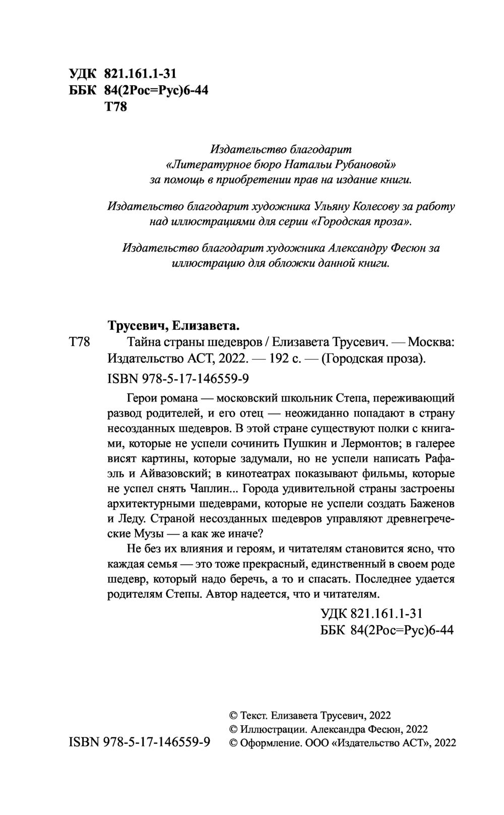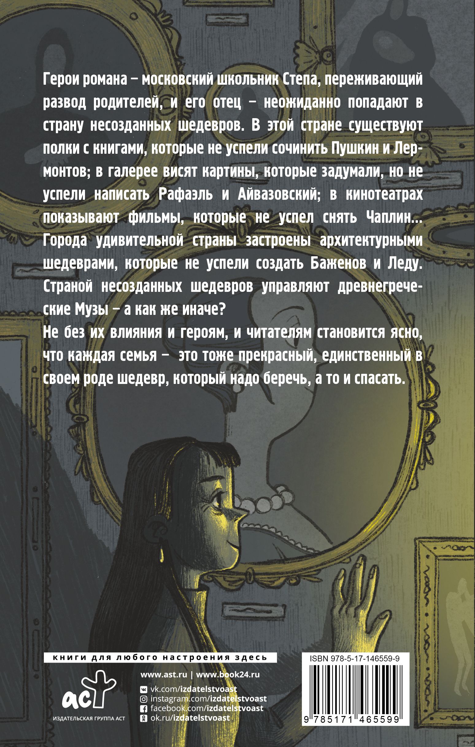 Герои романа – московский школьник Степа, переживающий развод родителей, и его отец – неожиданно попадают в страну несозданных шедевров. В этой стране существуют полки с книгами, которые не успели сочинить Пушкин и Лермонтов; в галерее висят картины, которые задумали, но не успели написать Рафаэль и Айвазовский; в кинотеатрах показывают фильмы, которые не успел снять Чаплин... Города удивительной страны застроены архитектурными шедеврами, которые не успели создать Баженов и Леду. Страной несозданных шедевров управляют древнегреческие Музы – а как же иначе?