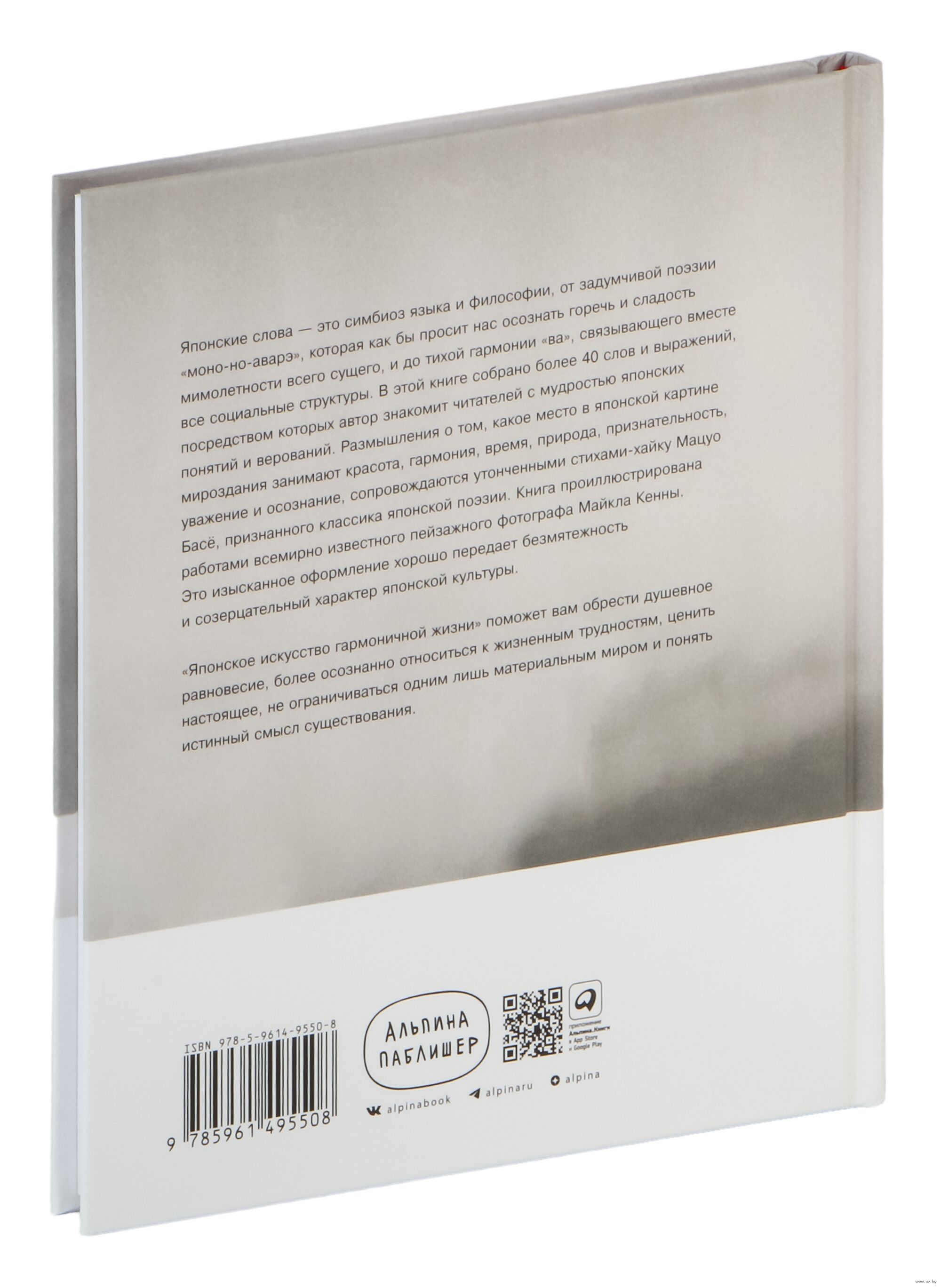 В книге лингвиста Мари Фудзимото рассказывается о 43 базовых ценностях японской культуры, которые помогают понять себя, стать ближе к природе, примириться с течением времени и улучшить отношения с близкими. Среди этих понятий есть и широко известные, например кайдзен, ваби-саби, икигай, и практически незнакомые нам хансэй, сунао, сибуи и многие другие. Текст дополняют хайку великого Мацуо Басё, поэтические эссе влюбленного в Японию южноафриканца Дэвида Баклера и работы признанного мастера черно-белой фотографии Майкла Кенны.