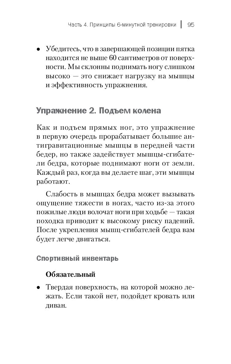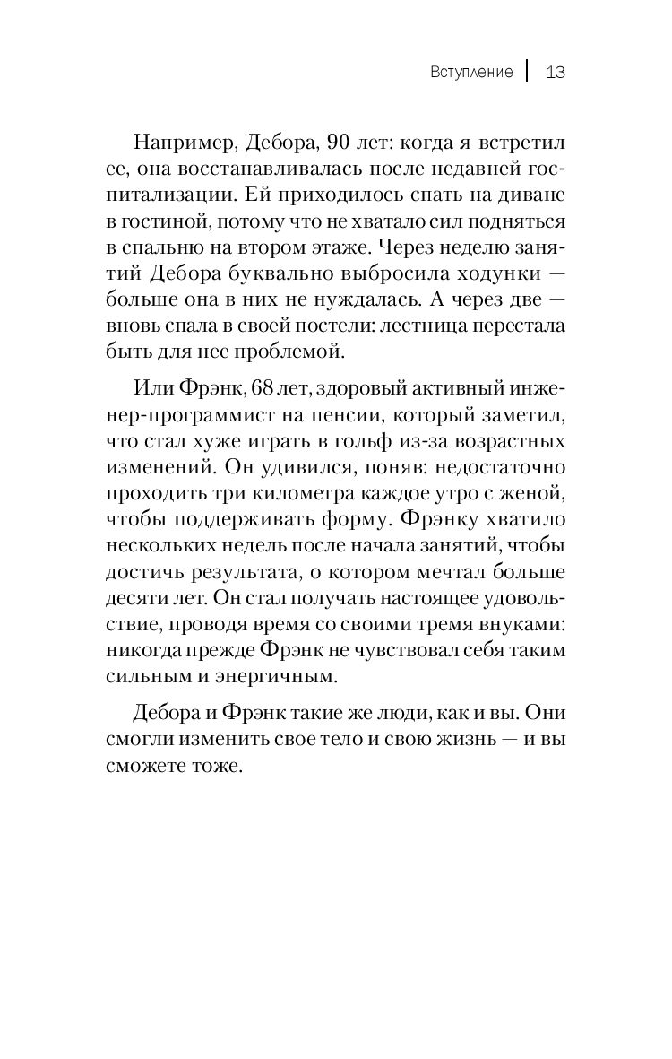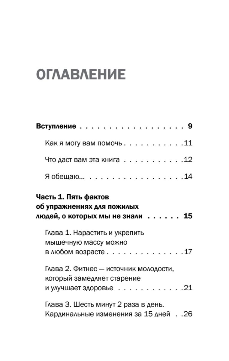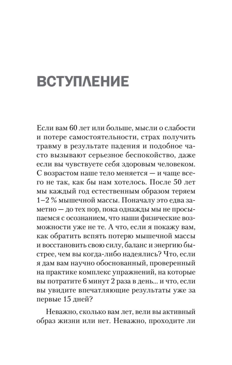 В 60 лет наше тело с трудом справляется с задачами, которые раньше давались нам безо всяких усилий: после игры с внуками необходим отдых, подъем по лестнице отнимает много времени и сил, а поход в магазин превратился в настоящее испытание. Но что, если бы у вас был проверенный комплекс упражнений, который займет всего 6 минут 2 раза в день и улучшит ваше самочувствие за первые 15 дней? Сделайте шаг навстречу новой версии себя – более сильной, жизнедеятельной и энергичной – благодаря фитнес-программе физиотерапевта доктора Джонатана Су – автора мирового бестселлера, изменившего жизни тысяч пожилых людей. С помощью этой книги вы: