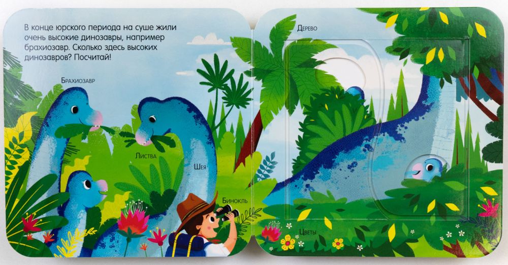 Как играть с этой книгой? Открывайте окошки из плотного картона, запоминайте названия динозавров, ищите тех, кто спрятался.
