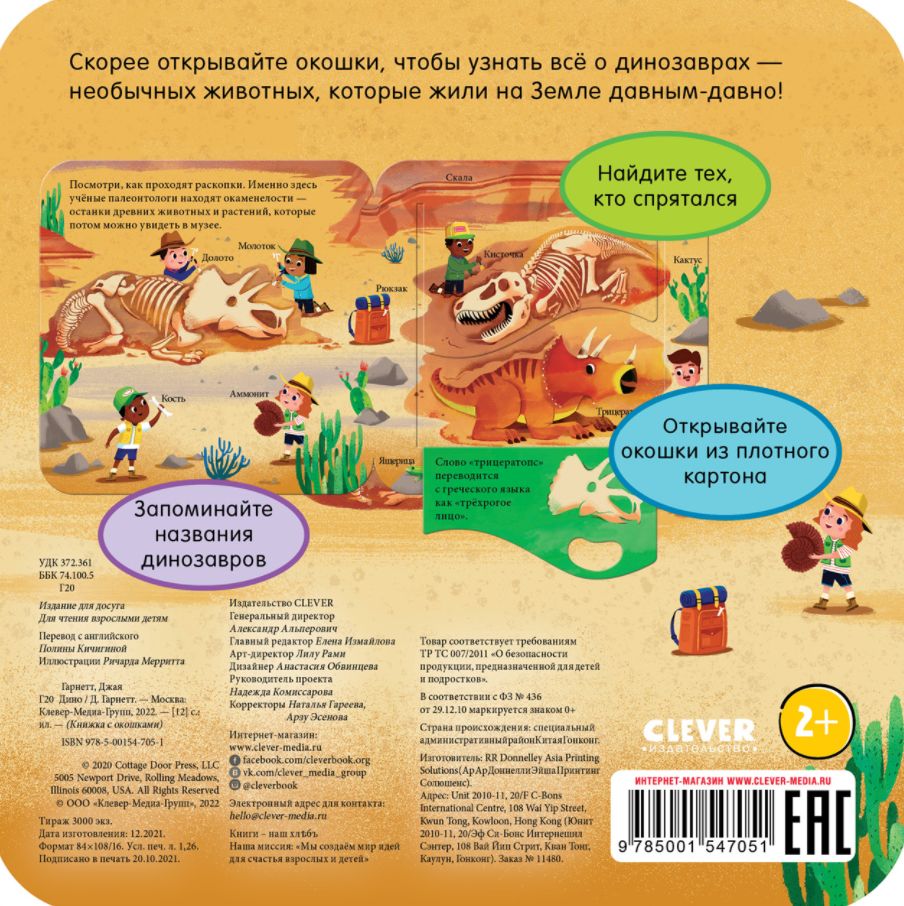Книга выполнена из экологичного прочного картона и идеально подходит для маленьких ручек. Специально разработанная система клапанов-окошек превратит занятия с малышом в веселую игру, и ребенок захочет возвращаться к милой и познавательной книге "Дино" снова и снова.