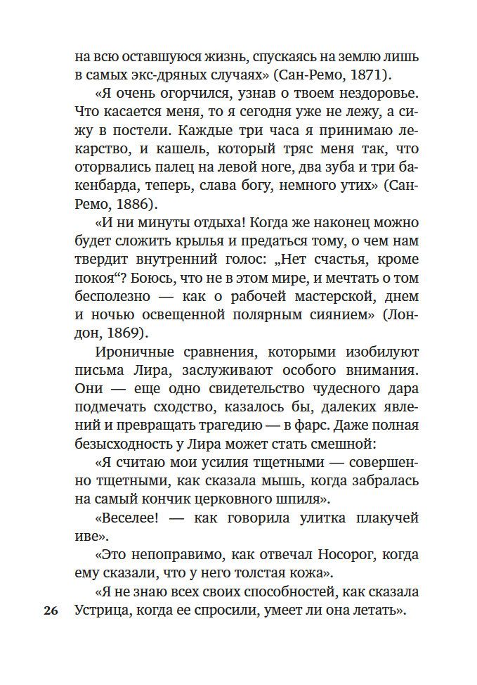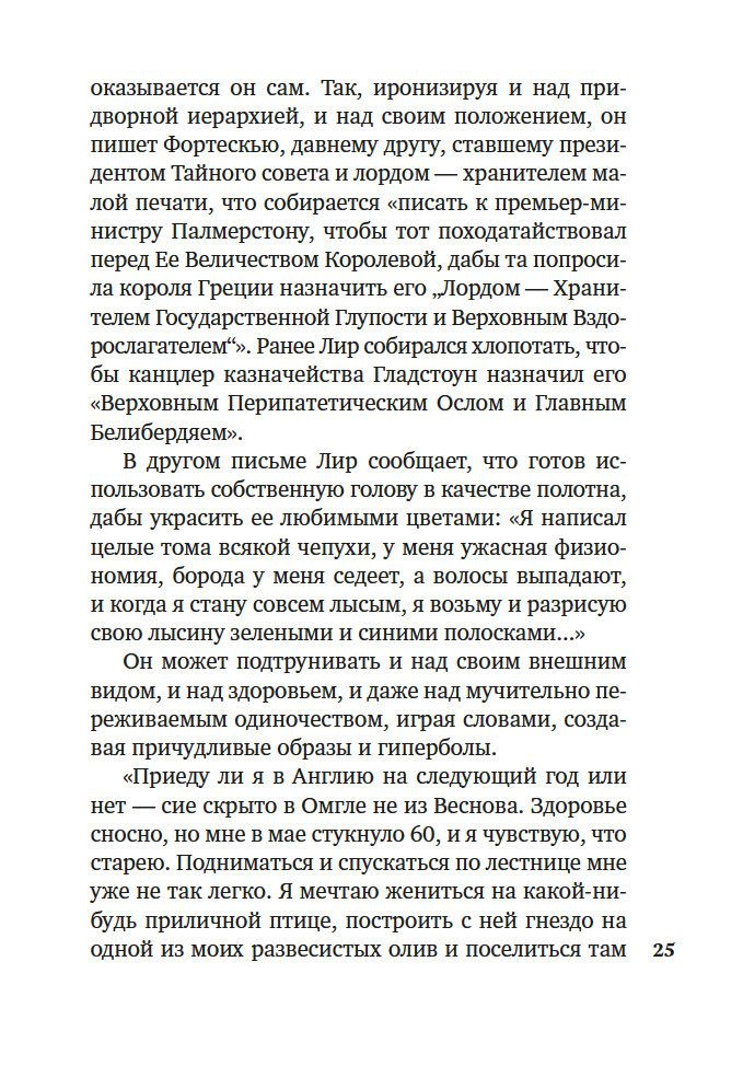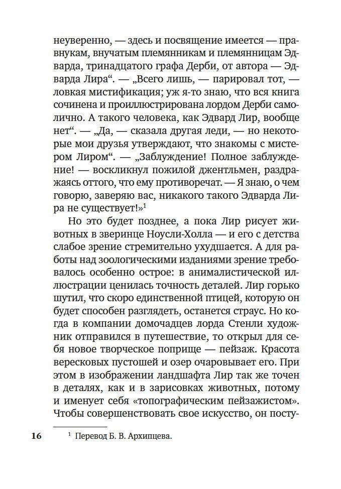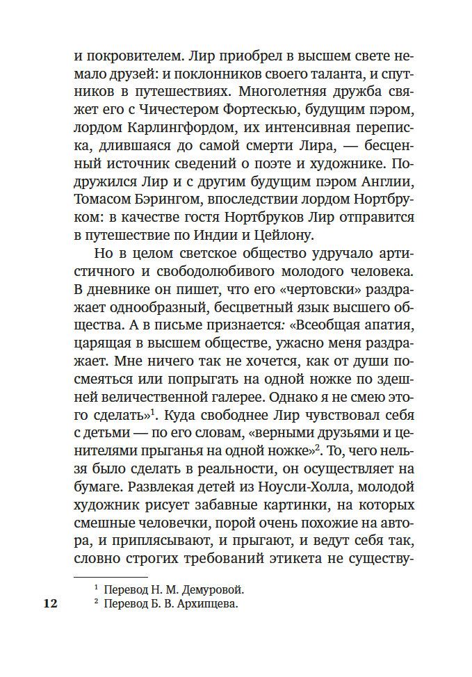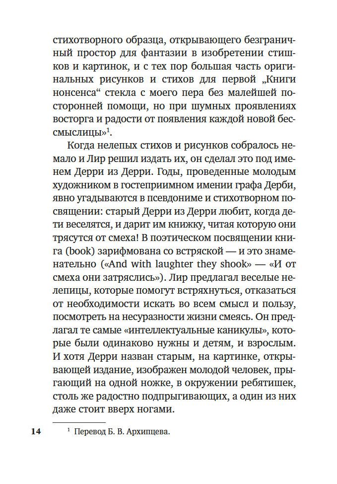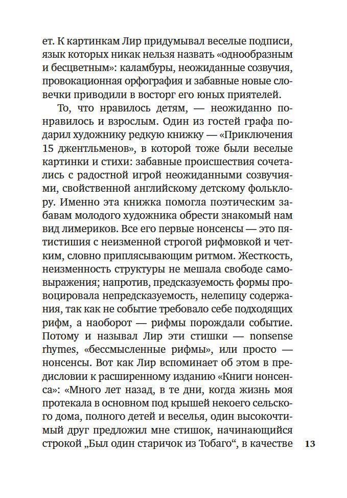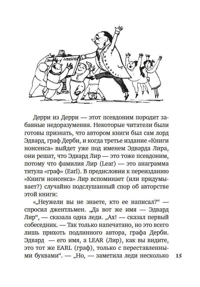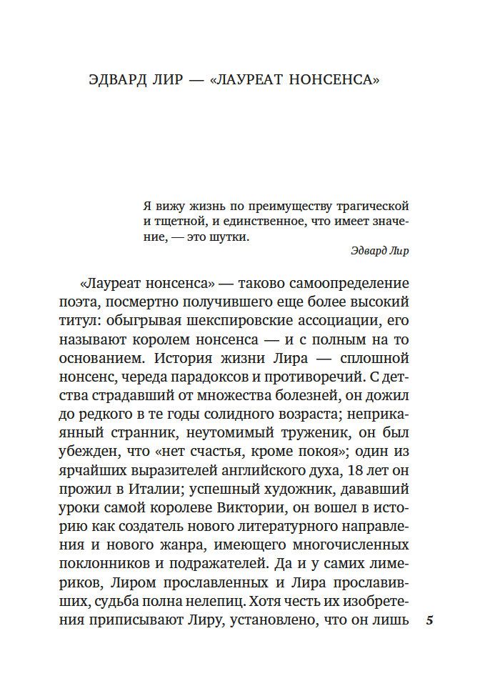 Олдос Хаксли писал: "Мало чьи сочинения я читаю больше, чем однажды, и конечно, среди таких авторов Эдвард Лир. Нонсенс, как и высокая поэзия, с которой он весьма тесно связан, как и философские построения, как и всякое создание нашего воображения, отстаивает духовную свободу человека перед лицом всех угнетающих обстоятельств". Свобода, гармония с собой, принятие жизни во всех ее проявлениях, подчас парадоксальных и абсурдных, – вот в чем пафос поэзии Лира и ее непреходящее значение.