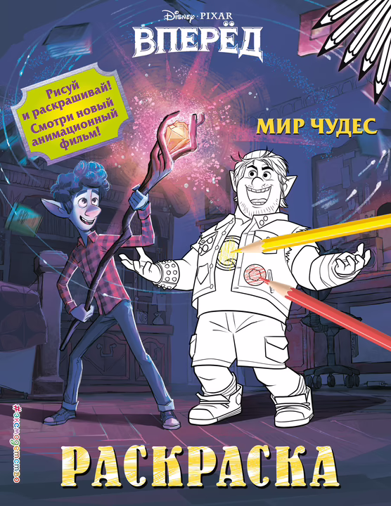 На каждой страничке тебя ждут Иэн, Барли и другие герои нового мультфильма Disney "Вперёд". Смотри кино и раскрашивай картинки!