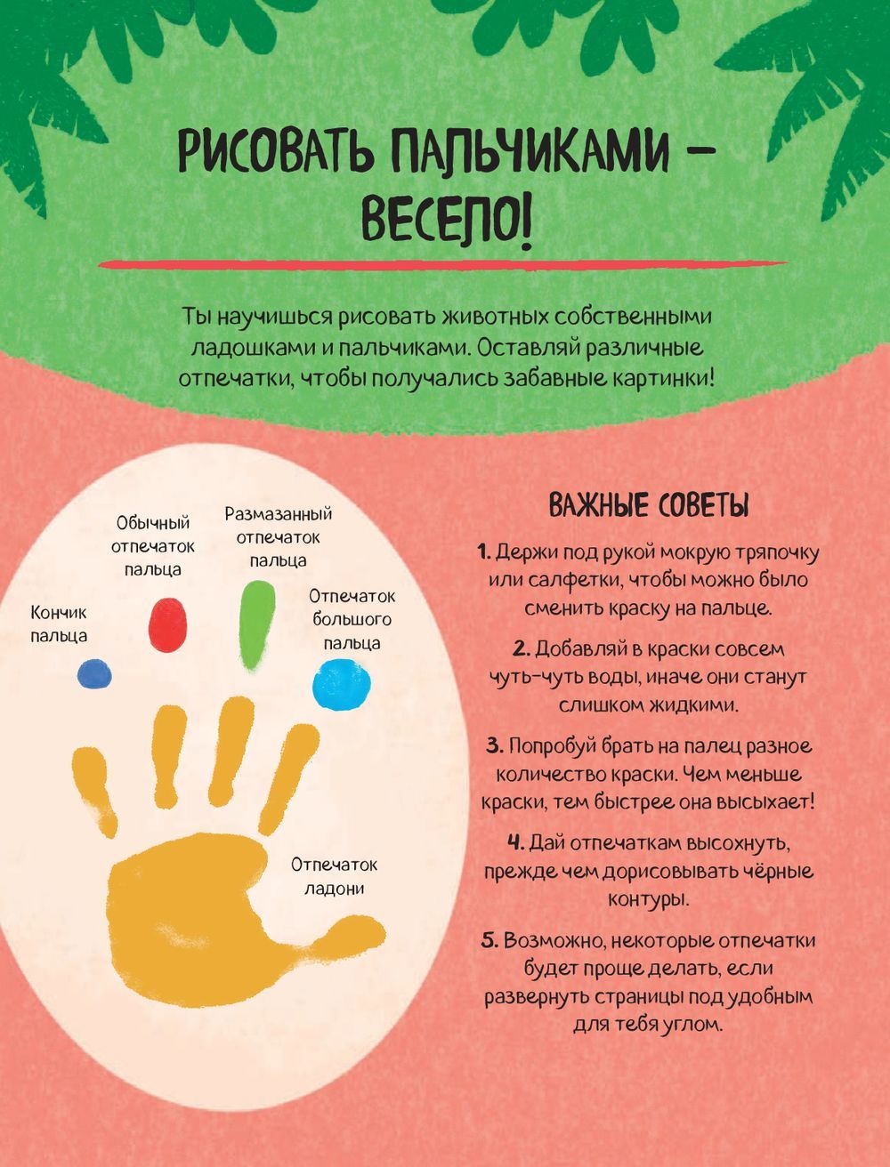 Зачем кисточки? Используй свои пальчики и ладошки, чтобы создавать удивительные красочные картины! Тебя ждут опасные дикие животные, таинственные обитатели подводного мира, большие и маленькие динозавры, а ещё любимые и всем известные домашние животные!