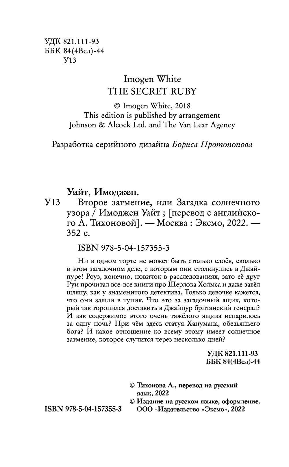 Ни в одном торте не может быть столько слоёв, сколько в этом загадочном деле, с которым они столкнулись в Джайпуре! Роуз, конечно, новичок в расследованиях, зато её друг Руи прочитал все-все книги про Шерлока Холмса и даже завёл шляпу, как у знаменитого детектива. Только девочке кажется, что они зашли в тупик. Что это за загадочный ящик, который так торопился доставить в Джайпур британский генерал? И как содержимое этого очень тяжёлого ящика испарилось за одну ночь? Причём здесь статуя Ханумана, обезьяньего бога? И какое отношение ко всему этому имеет солнечное затмение, которое случится через несколько дней?
