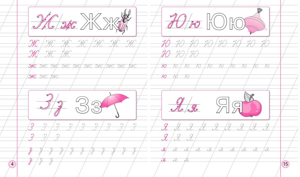 Пропись содержит образцы правильного написания букв русского алфавита. Сначала ребёнок познакомится с прописной и печатной буквой, далее он сможет обвести буквы по пунктирным линиям, а затем перейти к самостоятельному письму. Такой подход будет способствовать формированию правильного почерка, поможет маленькому ученику научиться ориентироваться в пространстве линейки.