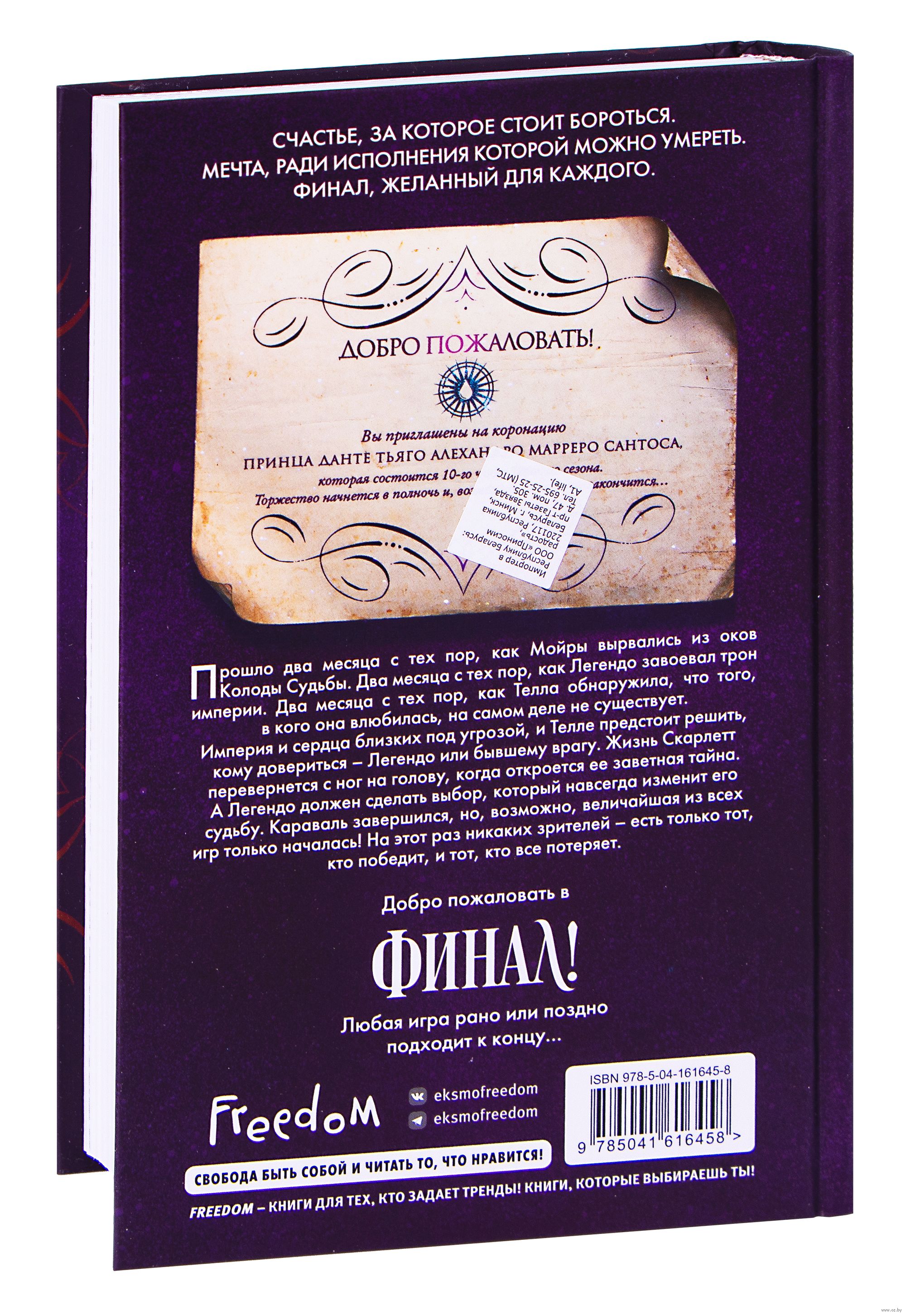 Империя и сердца близких под угрозой, и Телле предстоит решить, кому довериться – Легендо или бывшему врагу. Жизнь Скарлетт перевернется с ног на голову, когда откроется ее заветная тайна. А Легендо должен сделать выбор, который навсегда изменит его судьбу. Караваль завершился, но, возможно, величайшая из всех игр только началась! На этот раз никаких зрителей – есть только тот, кто победит, и тот, кто все потеряет.