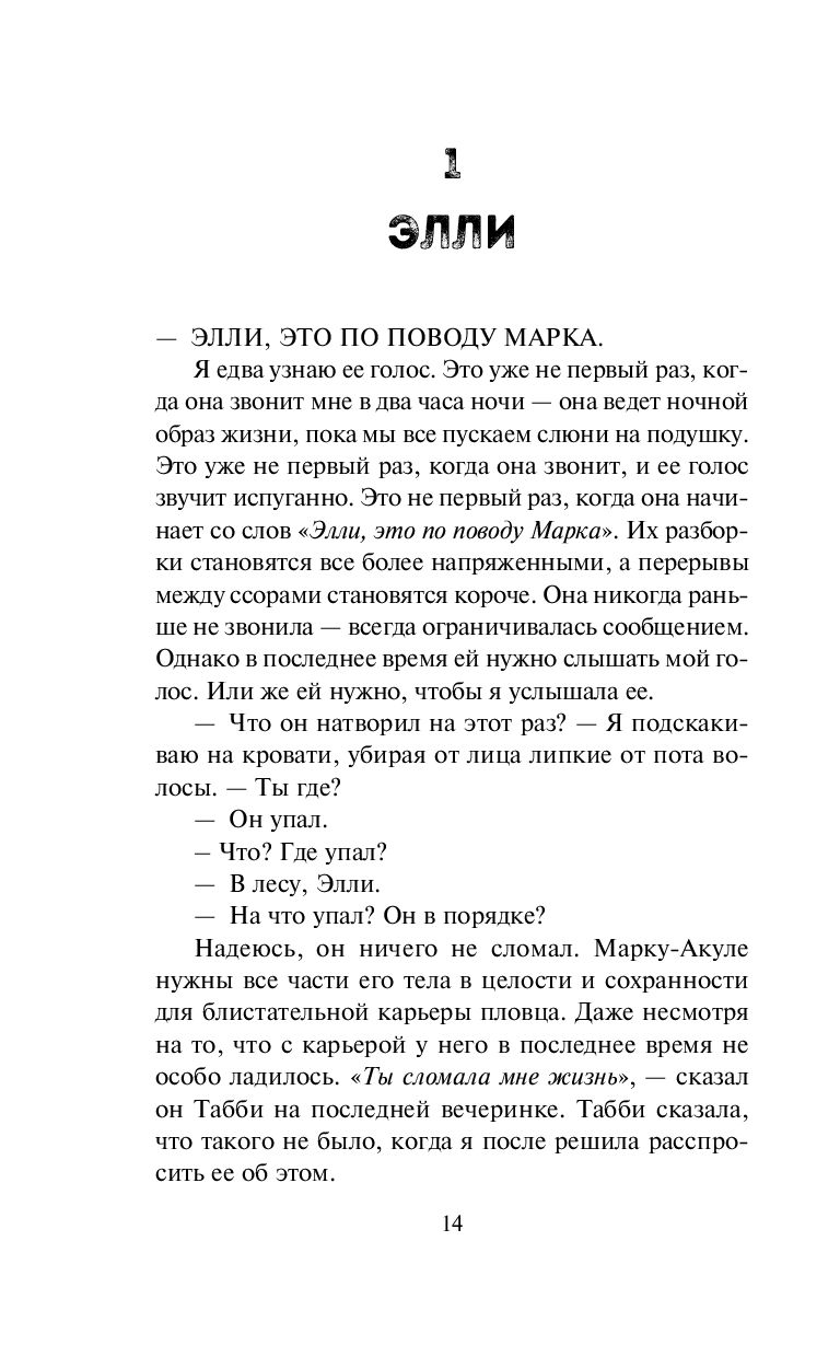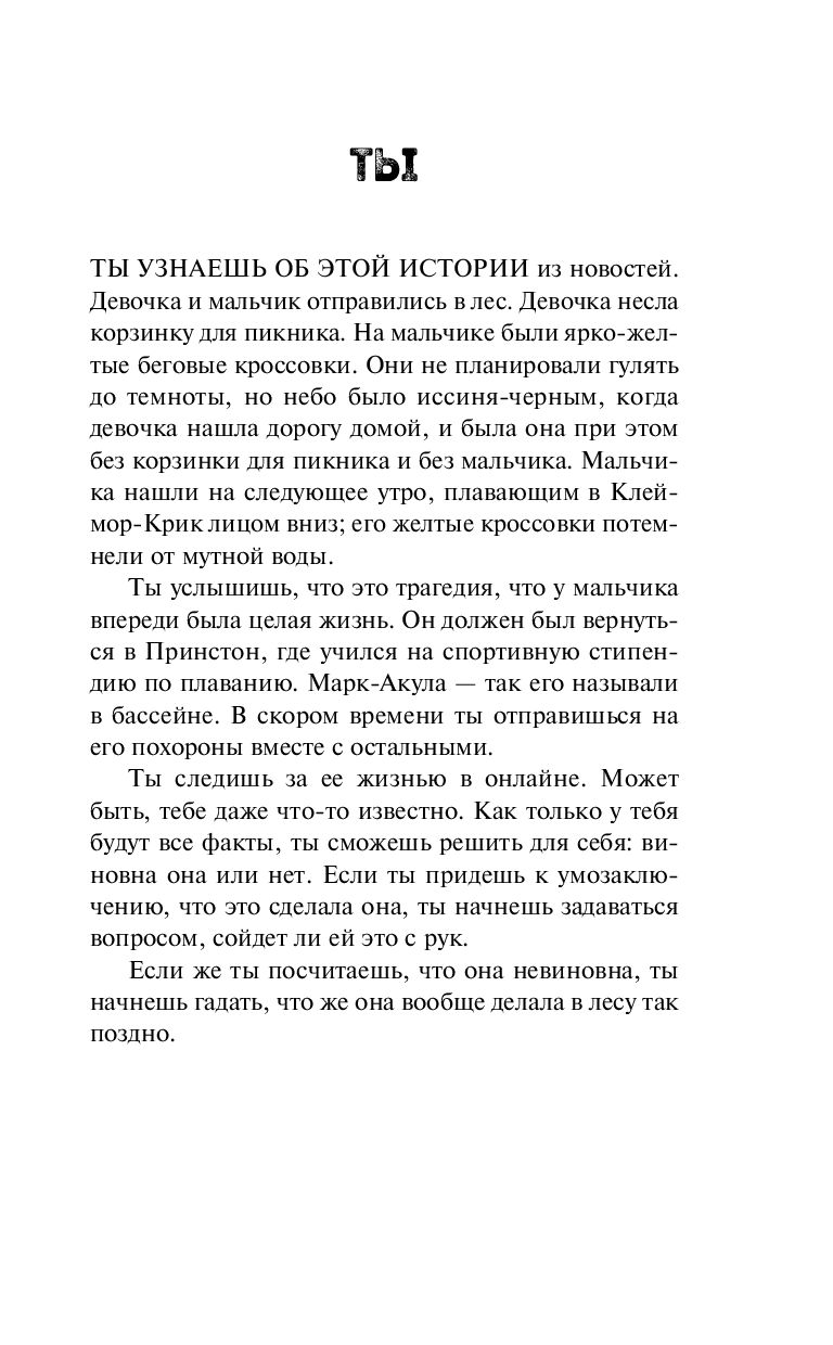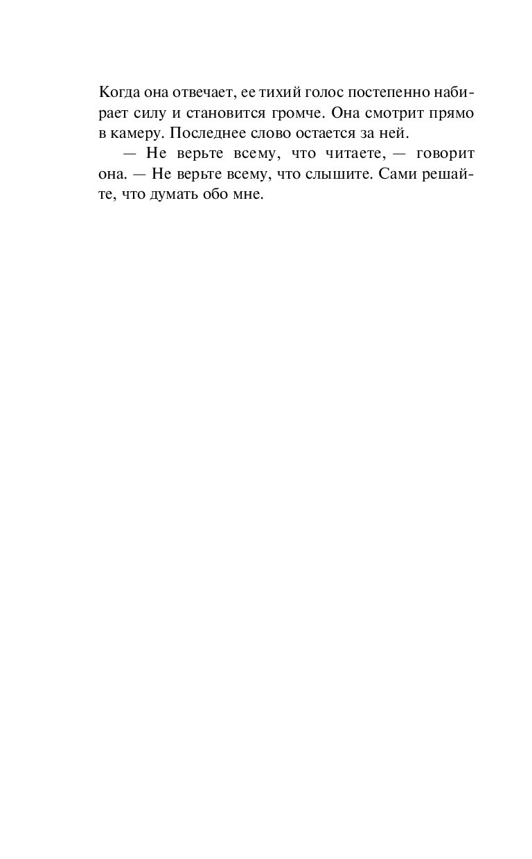Все вокруг уверены: им известна правда. Некоторые говорят, что Табби столкнула Марка с обрыва. Она ревновала. У нее было достаточно причин, чтобы избавиться от него. Другие полагают, что он упал с обрыва случайно. Ведь Табби любила его и не могла причинить Марку боль.... Кажется, что каждый знает правду лучше самой Табби: ее подруга, ее сестра, ее враги, ее бывший парень. Вот только они забыли, что лишь одной Табби известно, что произошло на самом деле.