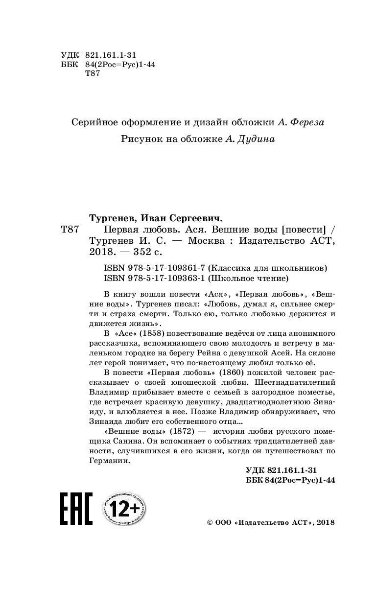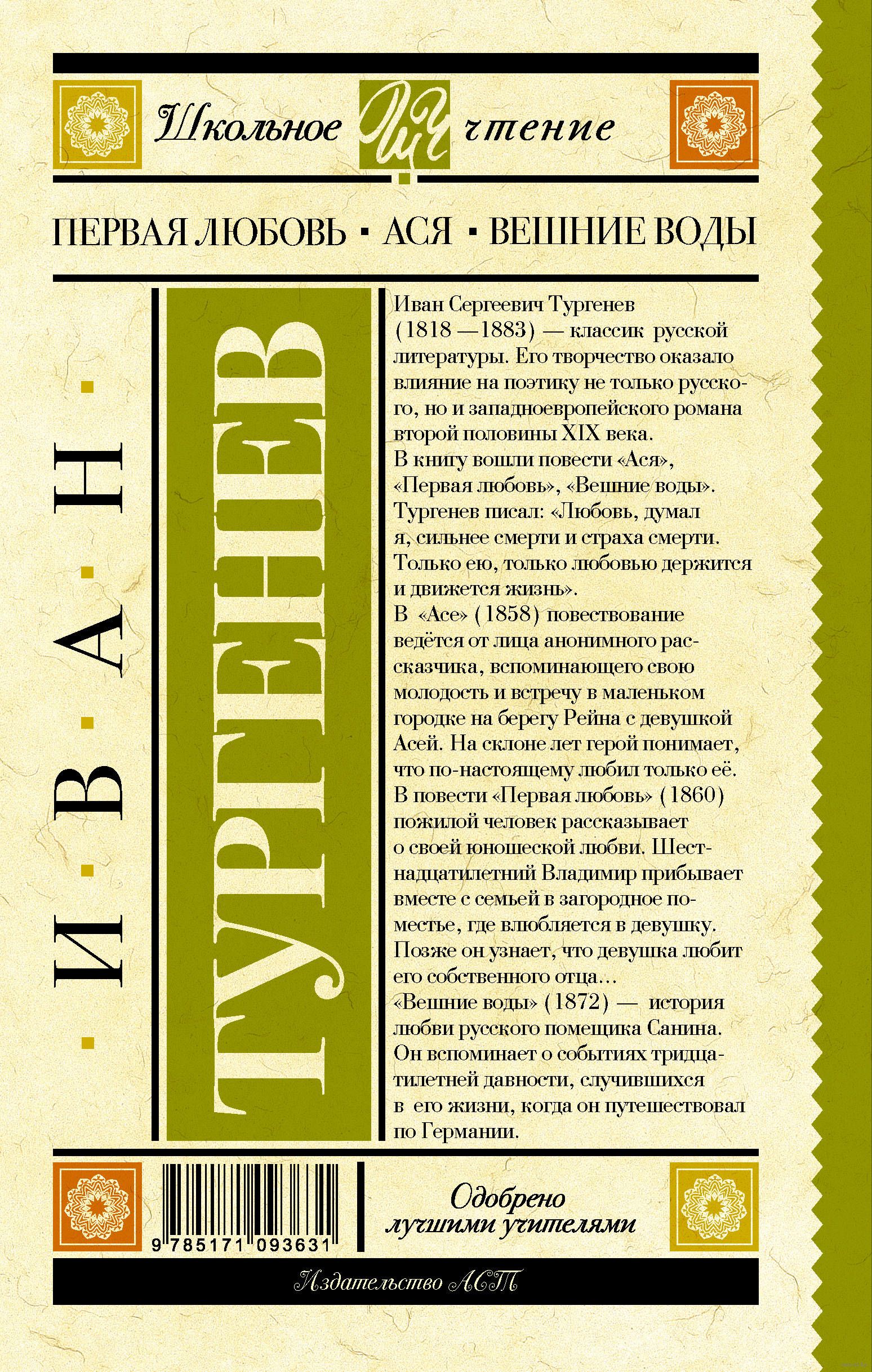 В книгу вошли повести "Ася", "Первая любовь", "Вешние воды". Тургенев писал: "Любовь, думал я, сильнее смерти и страха смерти. Только ею, только любовью держится и движется жизнь".