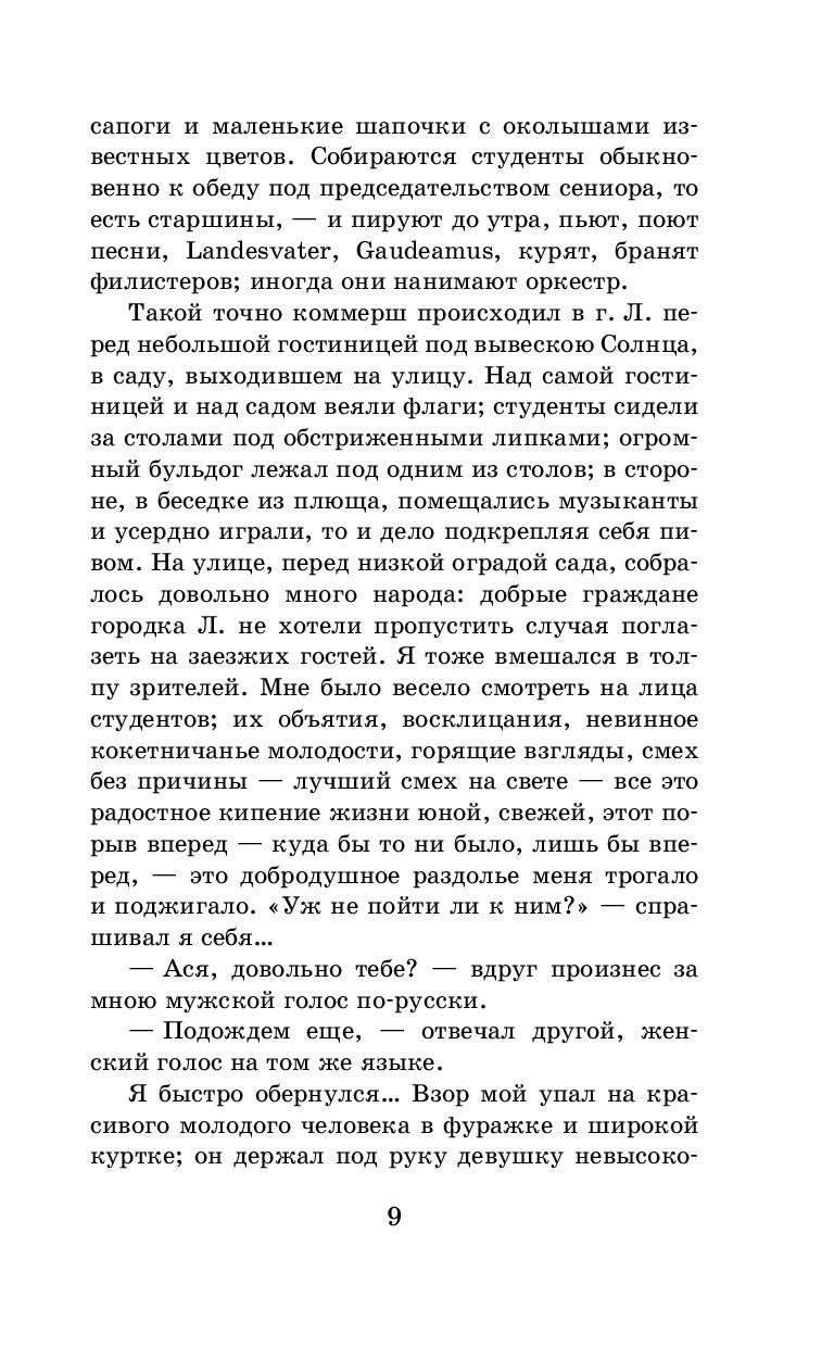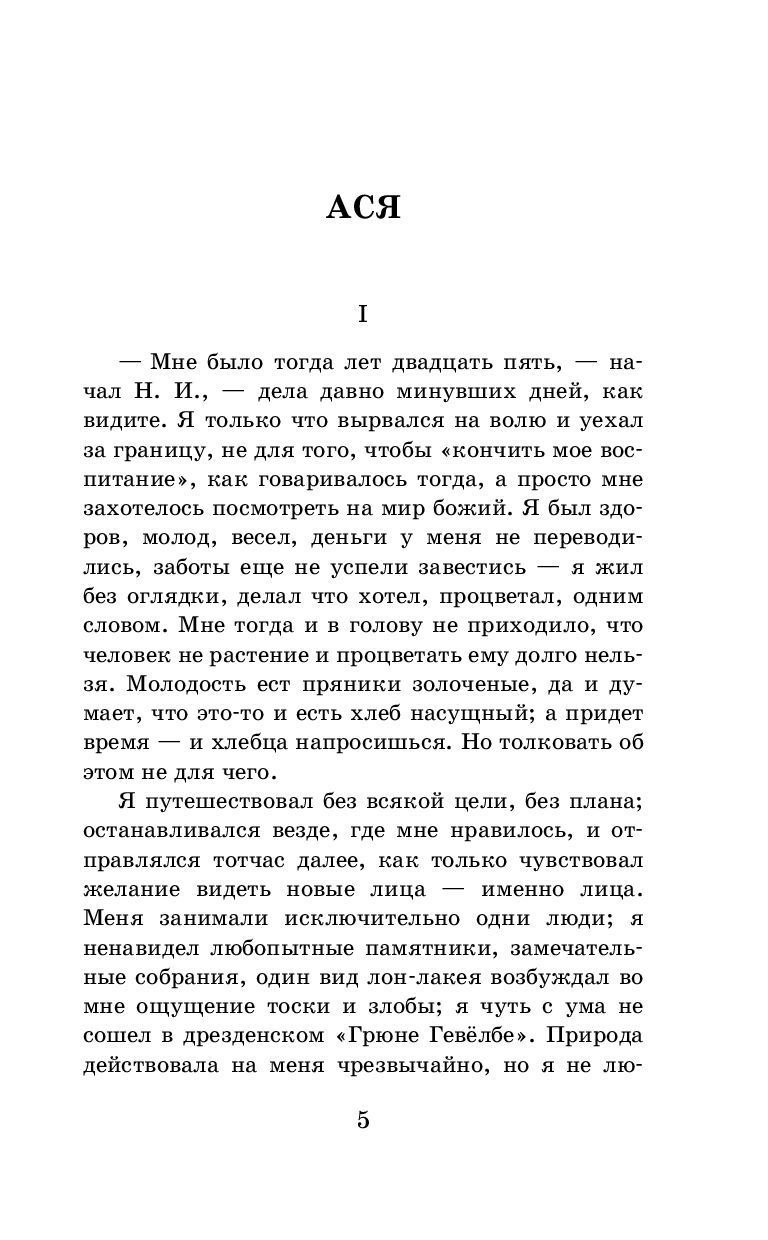 В "Асе" (1858) повествование ведётся от лица анонимного рассказчика, вспоминающего свою молодость и встречу в маленьком городке на берегу Рейна с девушкой Асей. На склоне лет герой понимает, что по-настоящему любил только её.