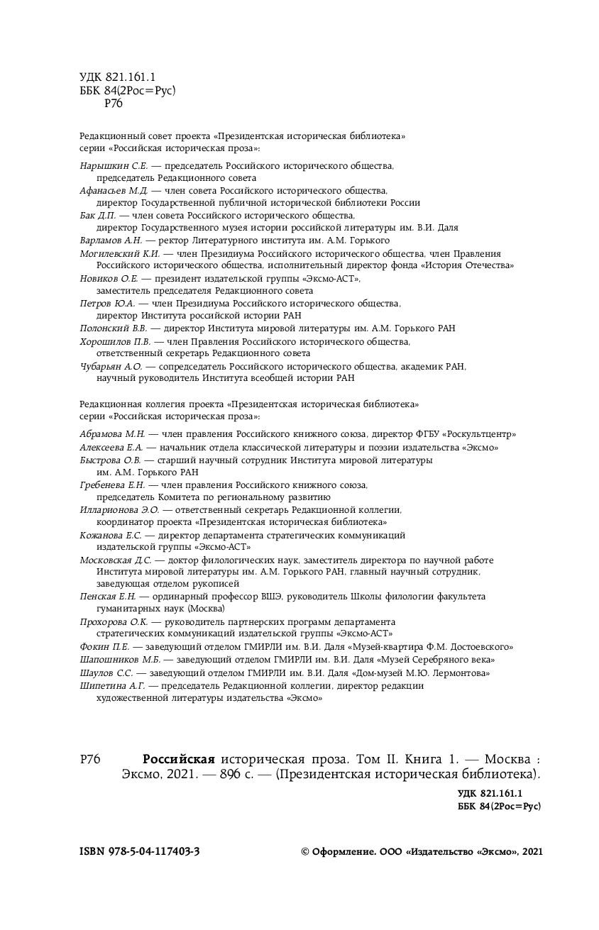 "Российская историческая проза" – социальная просветительская серия. Состоит из пяти томов, в которые вошли художественные произведения, написанные в конце в конце XVIII – XX вв. и посвященные знаковым событиям российской истории.
