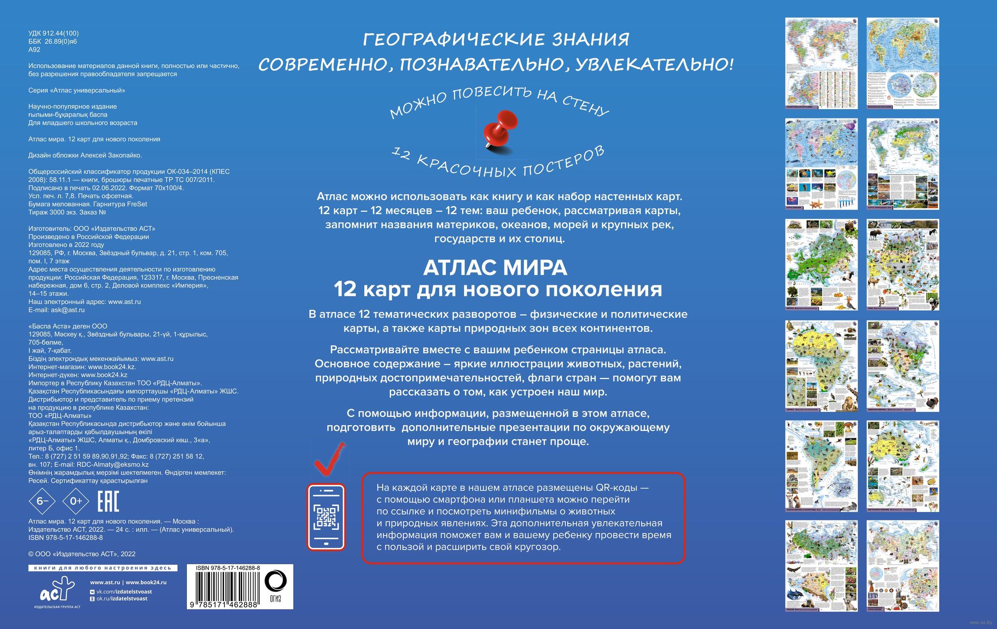 В атласе 12 карт – физические и политические карты, а также карты природных зон всех континентов. Карты подготовлены редакцией ОГИЗ, выпускающей картографическую продукцию для детей и взрослых. Рассматривайте вместе с вашим ребенком карты атласа. Основное содержание – яркие иллюстрации животных, растений, природных достопримечательностей, флаги стран – помогут вам рассказать о том, как устроен наш мир.