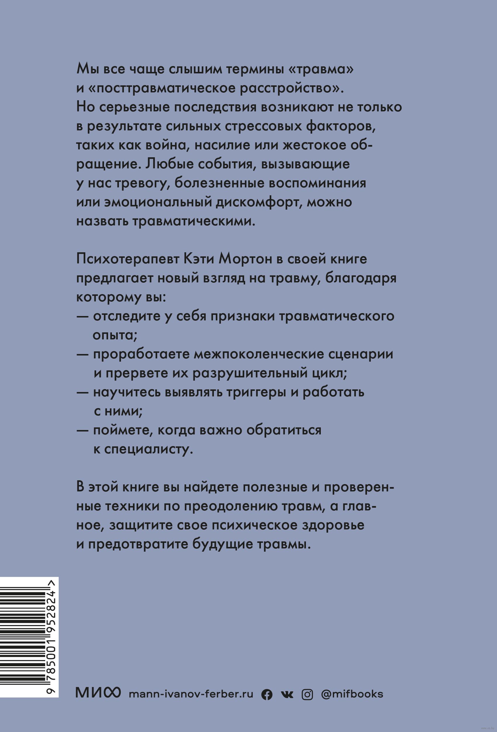 Психотерапевт Кэти Мортон предлагает новый взгляд на травму. Только осознав, как она определяется, мы сможем преодолеть последствия. В книге вы найдете проверенные способы исцеления травмы, а также узнаете, что наносит вред вашему психическому здоровью и как с этим справиться.