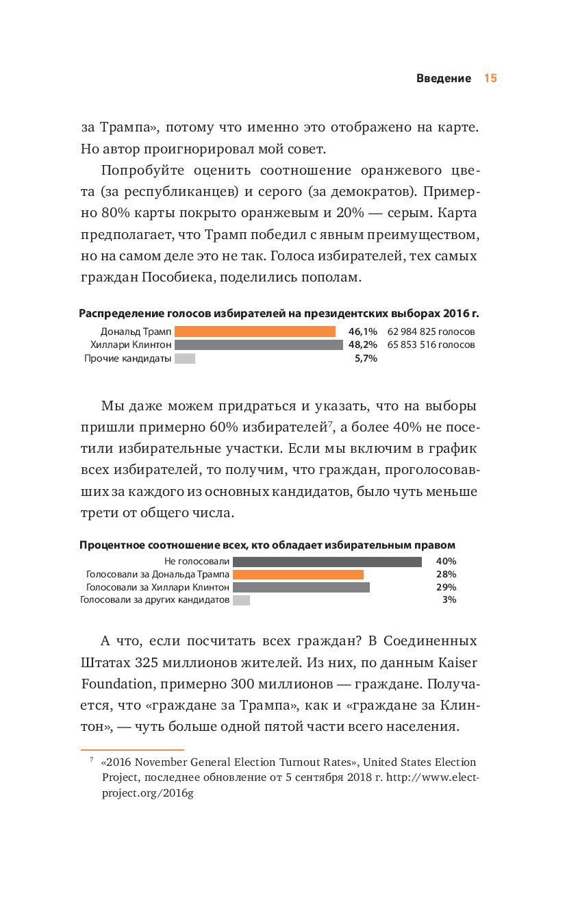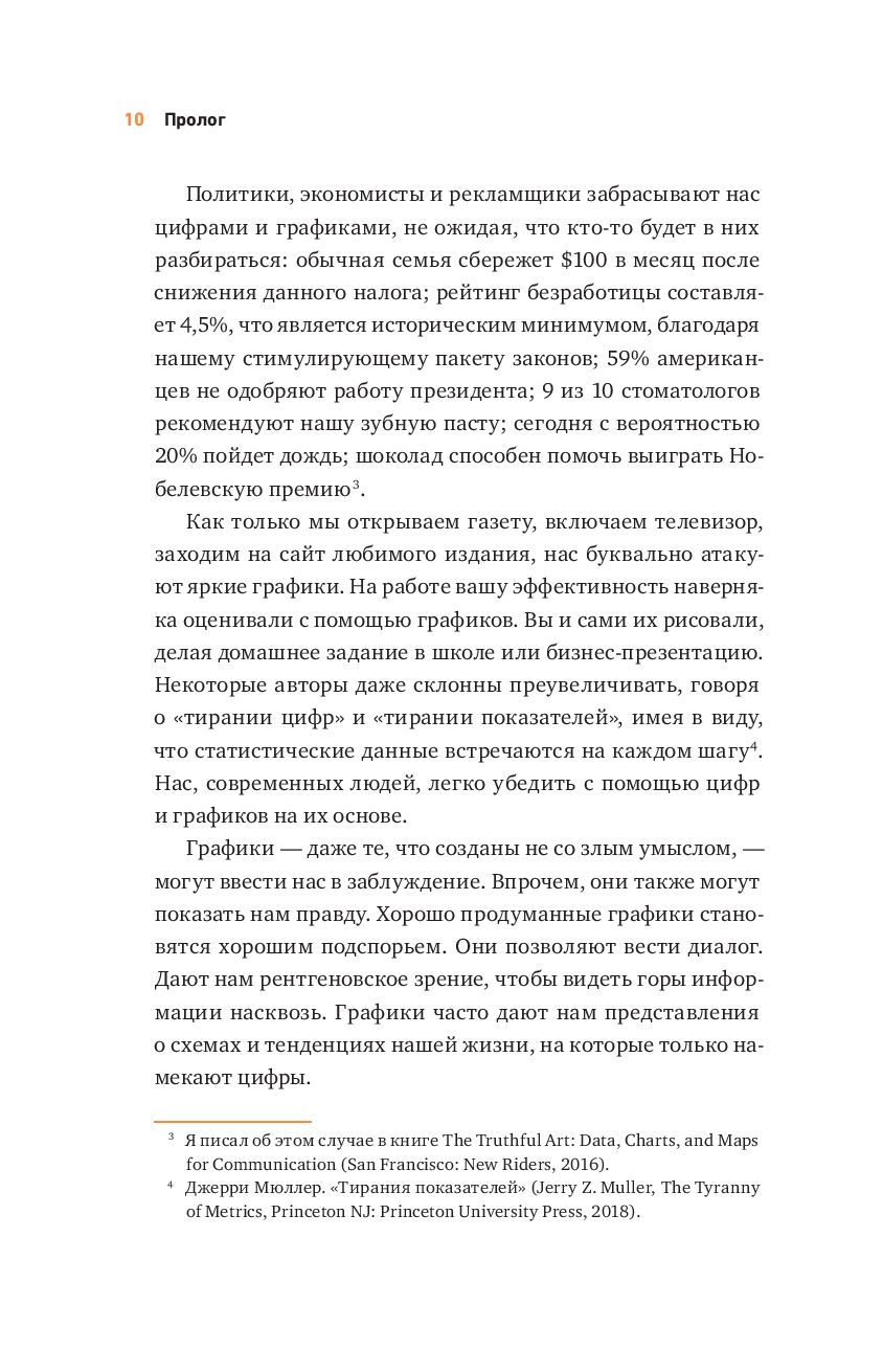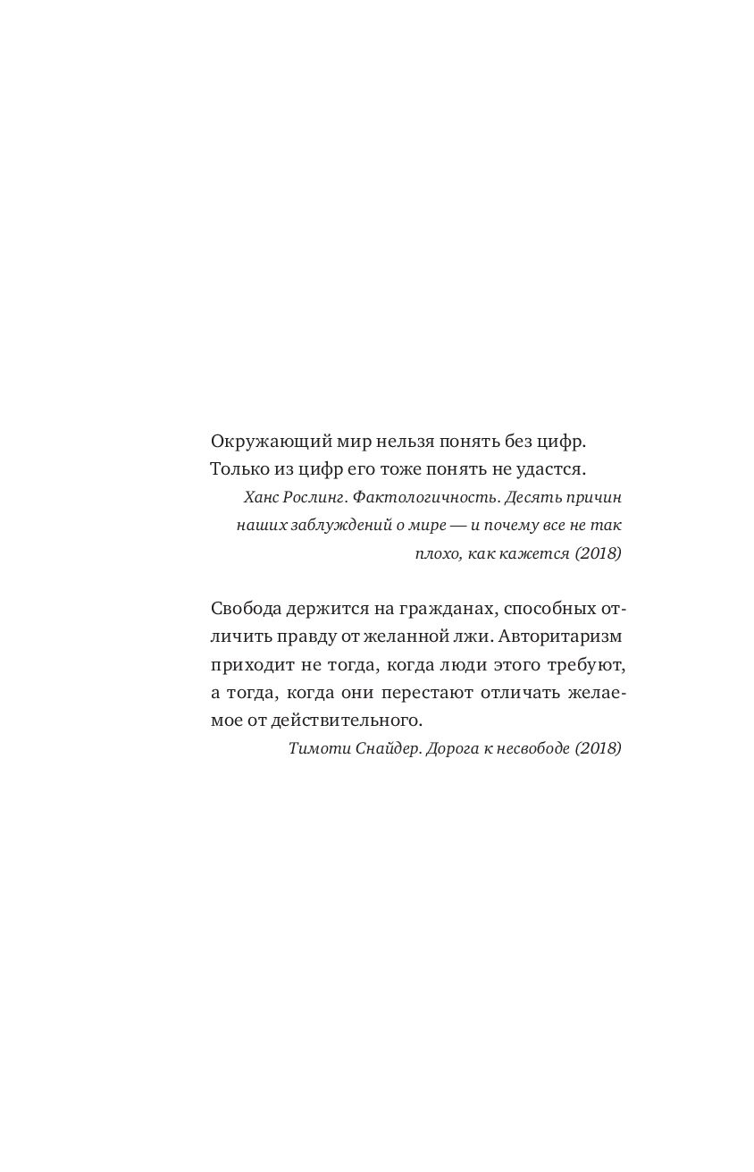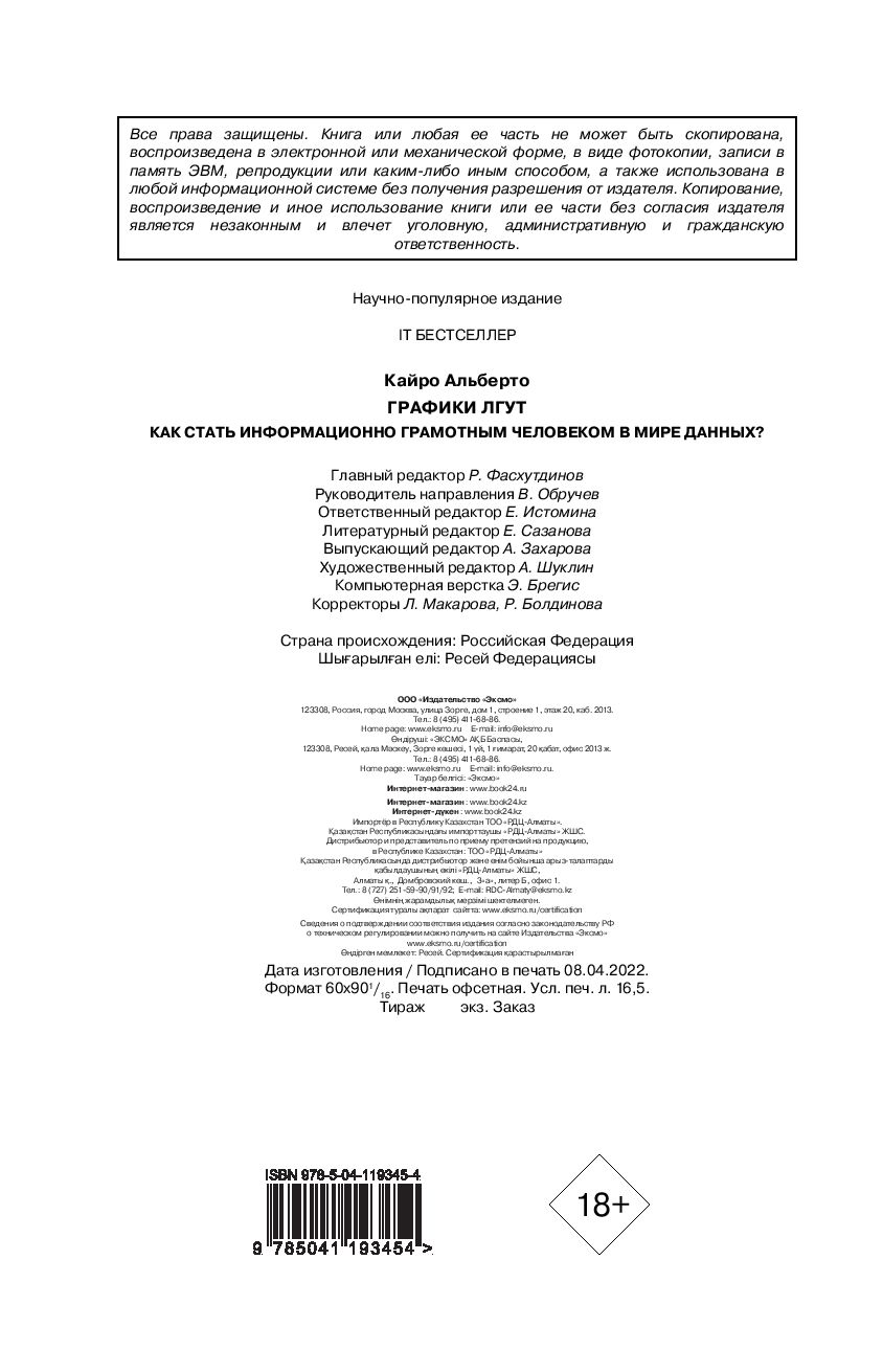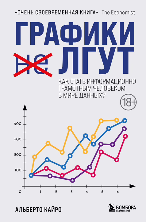 Мы живем в век визуальной информации и больших данных. Любой аналитический материал, будь то статья, исследование, телепередача или статистическая сводка, сегодня просто обязан содержать инфографику в виде диаграмм, графиков или схем – это помогает быстрее усвоить информацию и сделать ее нагляднее. Альберто Кайро, ведущий мировой эксперт по визуальной коммуникации, консультирующий такие компании как Apple и Google, в своей книге предостерегает нас от чрезмерного доверия графикам. Зачастую, намеренно или случайно, говорит автор, инфографика вводит нас в заблуждение. Каким образом? Кайро выделил десятки причин, почему графики лгут, – зная их, вы больше никогда не попадетесь на удочку некорректной инфографики и сможете составить верное мнение о любых данных, от статистики заболеваемости COVID и рейтингов кинопроката до корпоративных отчетов.