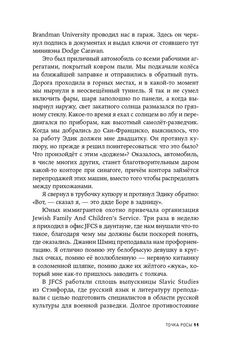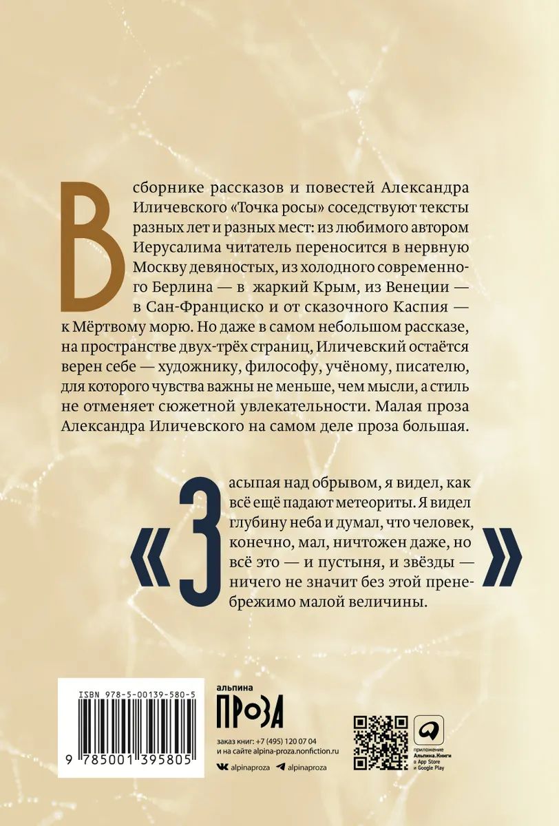 В сборнике рассказов и повестей Александра Иличевского "Точка росы" соседствуют тексты разных лет и разных мест – из любимого автором Иерусалима читатель переносится в нервную Москву девяностых, из холодного современного Берлина – в жаркий Крым, из Венеции – в Сан-Франциско и от сказочного Каспия – к Мёртвому морю. Но даже в самом небольшом рассказе, на пространстве двух-трёх страниц, Иличевский остаётся верен себе – художнику, философу, учёному, писателю, для которого чувства важны не меньше, чем мысли, а стиль не отменяет сюжетной увлекательности. Малая проза Александра Иличевского на самом деле проза большая.