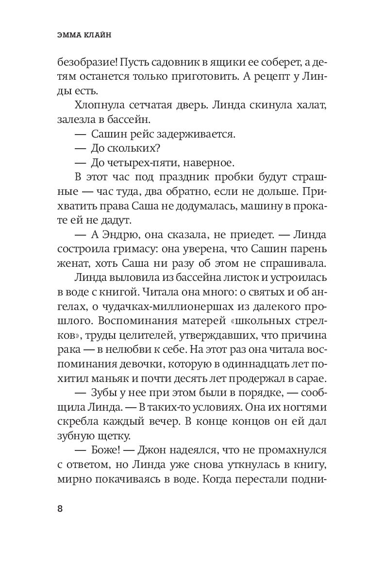 Отец забирает сына из школы-интерната после шокирующего акта насилия. Няня, работавшая в семье знаменитостей, прячется у друзей матери после бульварного скандала. Молодая женщина продает свое белье незнакомцам. Девочка-подросток впервые сталкивается с сексуальностью и несправедливостью. Десять тревожных, красивых, щемящих рассказов Эммы Клайн – это десять эпизодов, в которых незаметно, но неотвратимо рушится мир, когда кожица повседневности лопается и обнажается темная изнанка жизни, пульсирующая, притягивающая, пугающая. Герои Эммы Клайн разрывают стенки безопасного кокона, в котором они пребывали прежде, и открывают себя заново. Это истории о доминировании в мирных семьях, о том, насколько далеки друг от друга истинное и ложное "я", о провокации ради любви, о бездействии, о всех тем странных импульсах, что порой вспышками взрывают медленное течение обычной жизни.