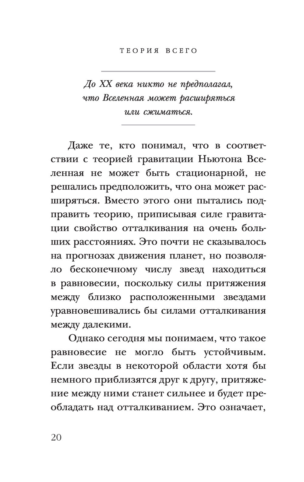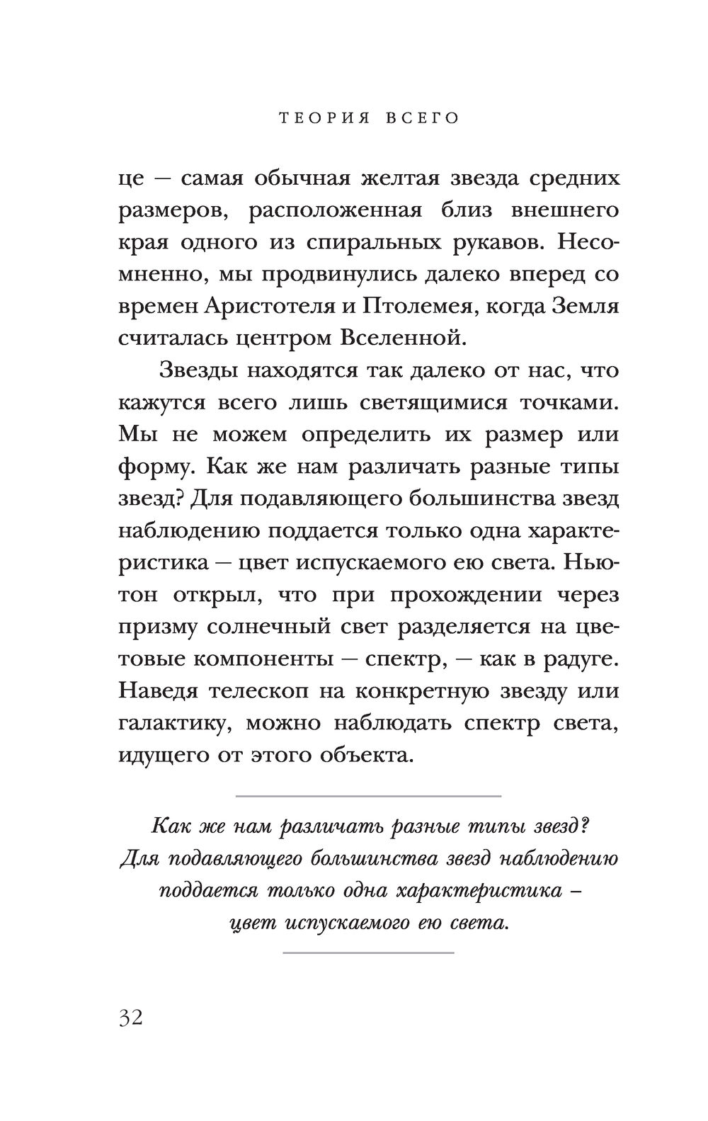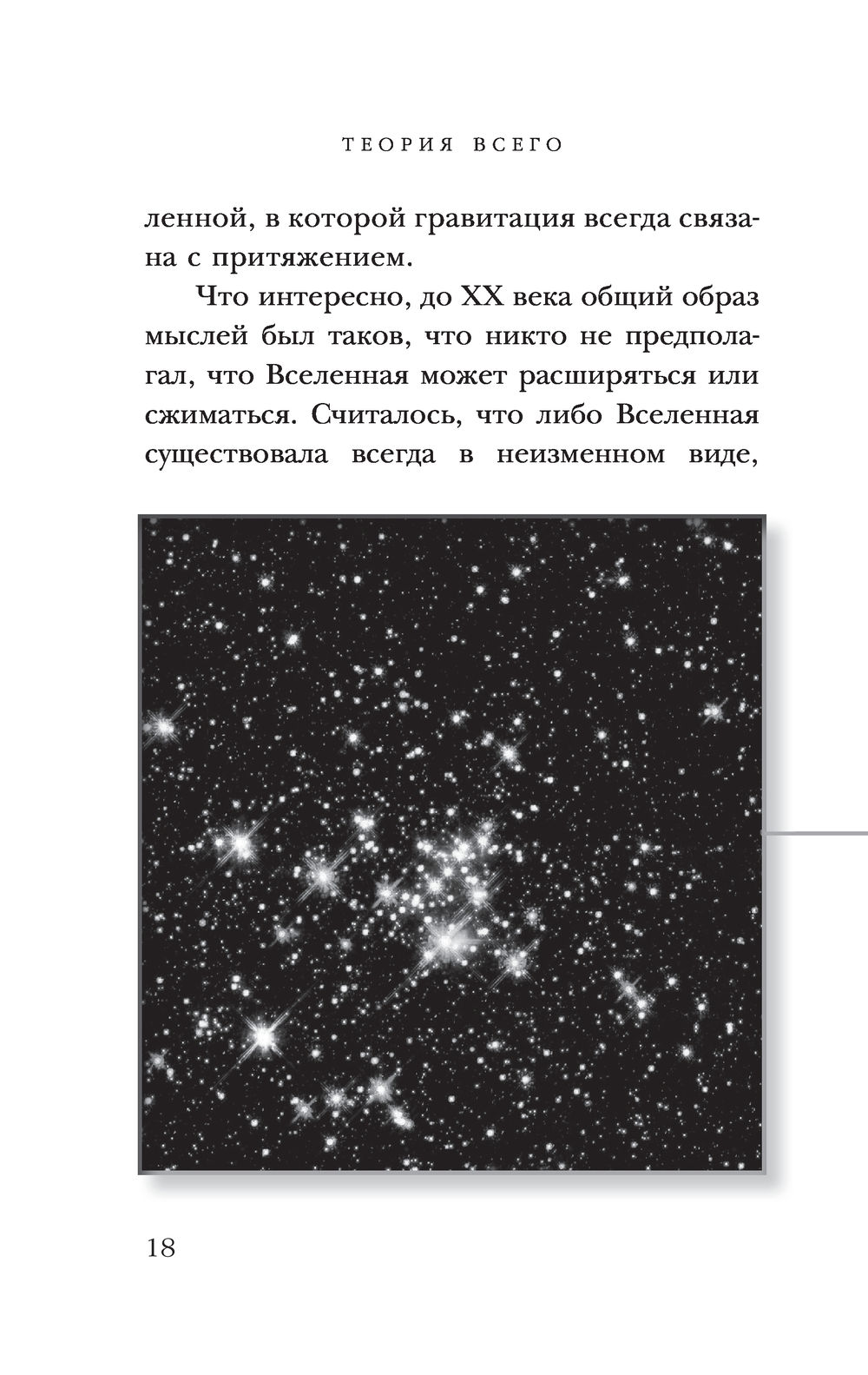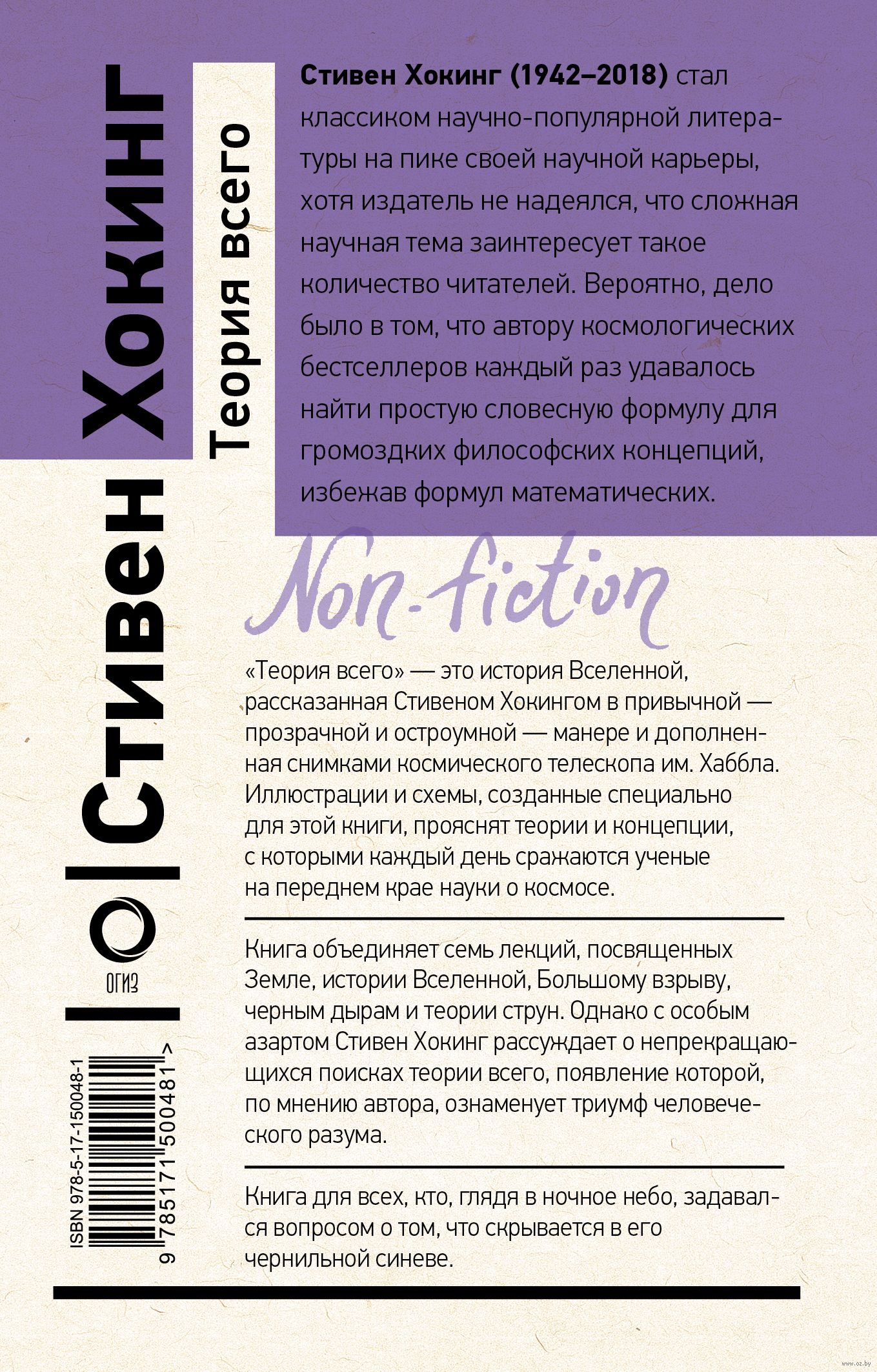 "Теория всего" – это история Вселенной, рассказанная Стивеном Хокингом в привычной – прозрачной и остроумной – манере и дополненная снимками космического телескопа им. Хаббла. Иллюстрации и схемы, созданные специально для этой книги, прояснят теории и концепции, с которыми каждый день сражаются ученые на переднем крае науки о космосе.