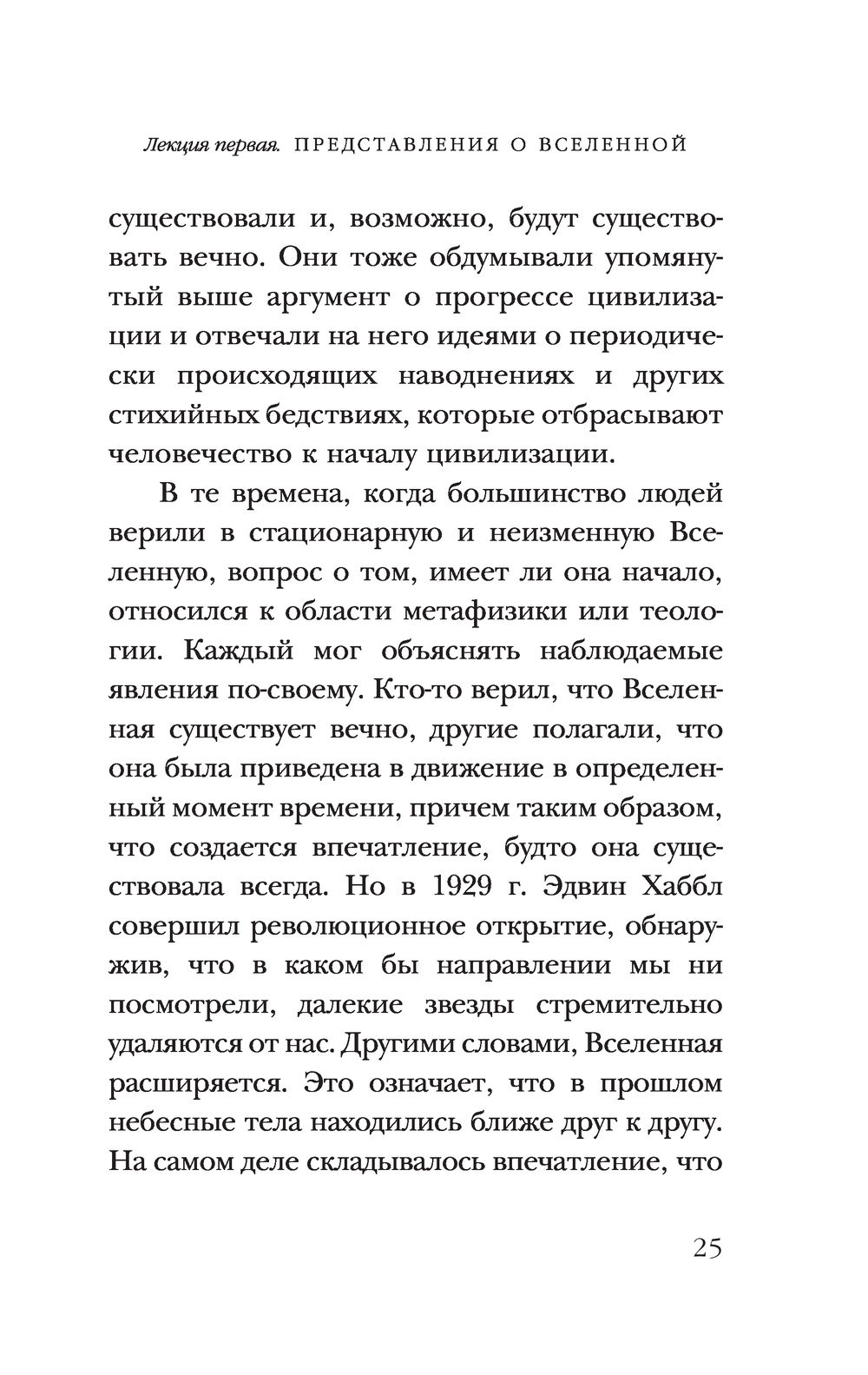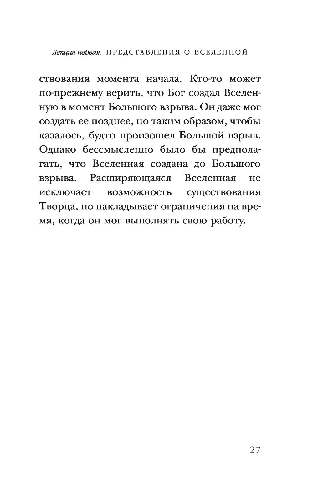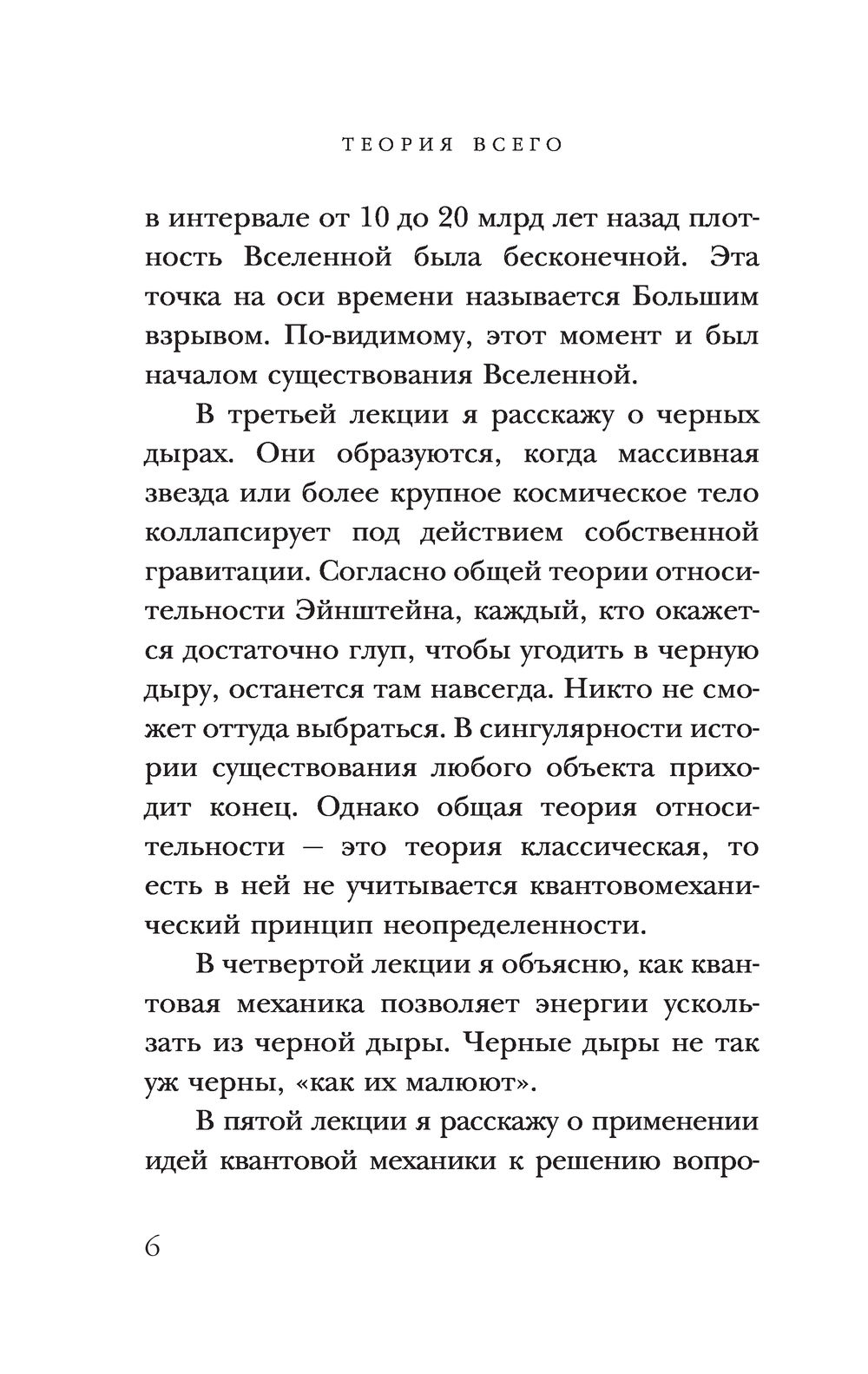 Книга объединяет семь лекций, посвященных Земле, истории Вселенной, Большому взрыву, черным дырам и теории струн. Однако с особым азартом Стивен Хокинг рассуждает о непрекращающихся поисках теории всего, появление которой, по мнению автора, ознаменует триумф человеческого разума.
