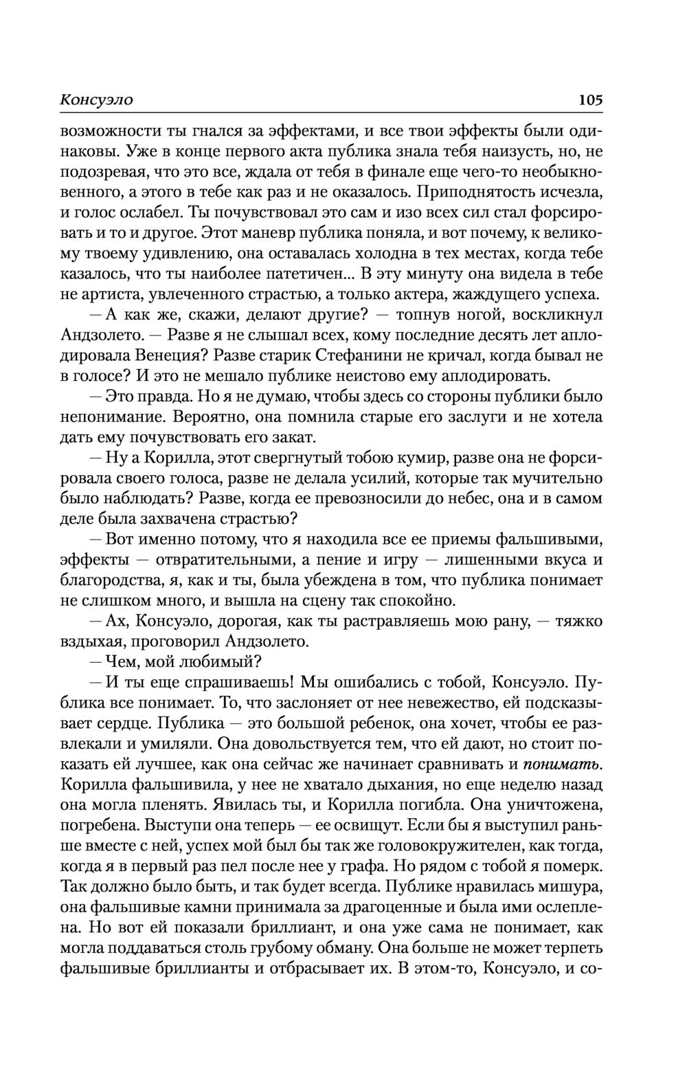 Жанр этого произведения, балансирующего между историческим и приключенческим романом и готической мистикой, совершенно не поддается определению, однако тем интереснее следить за его сюжетом и за крутыми поворотами судьбы главной героини, прототипом которой послужила знаменитая Полина Виардо. Молодой венецианской оперной певице Консуэло приходится преодолевать нелегкие испытания, даря людям свое искусство. Это книга о судьбе истинного художника, о сложном, а порой даже трагическом выборе между славой и личным счастьем.