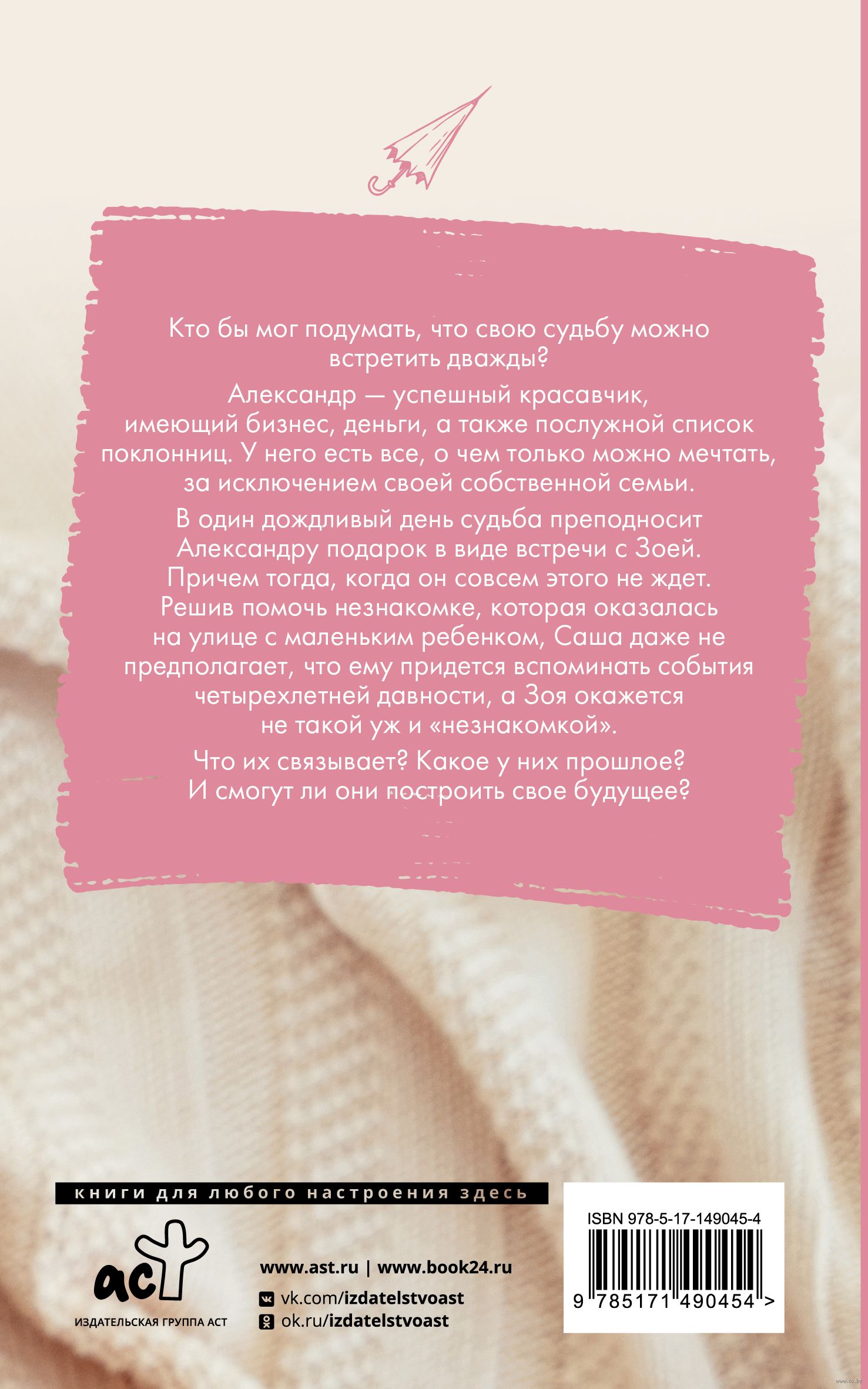 Кто бы мог подумать, что свою судьбу можно встретить дважды? Александр – успешный красавчик, имеющий бизнес, деньги, а также послужной список поклонниц. У него есть все, о чем только можно мечтать, за исключением своей собственной семьи. В один дождливый день судьба преподносит Александру подарок в виде встречи с Зоей. Причем тогда, когда он совсем этого не ждет. Решив помочь незнакомке, которая оказалось на улице с маленьким ребенком, Саша даже не предполагает, что ему придется вспоминать события четырехлетней давности, а Зоя окажется не такой уж и "незнакомкой". Что их связывает? Какое у них прошлое? И смогут ли они построить свое будущее?