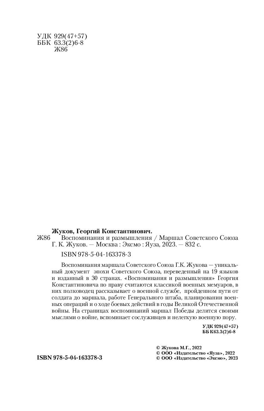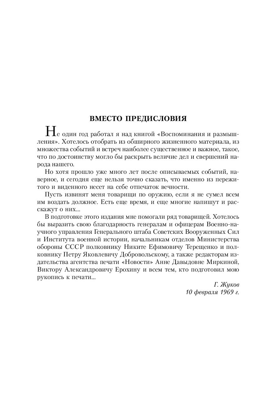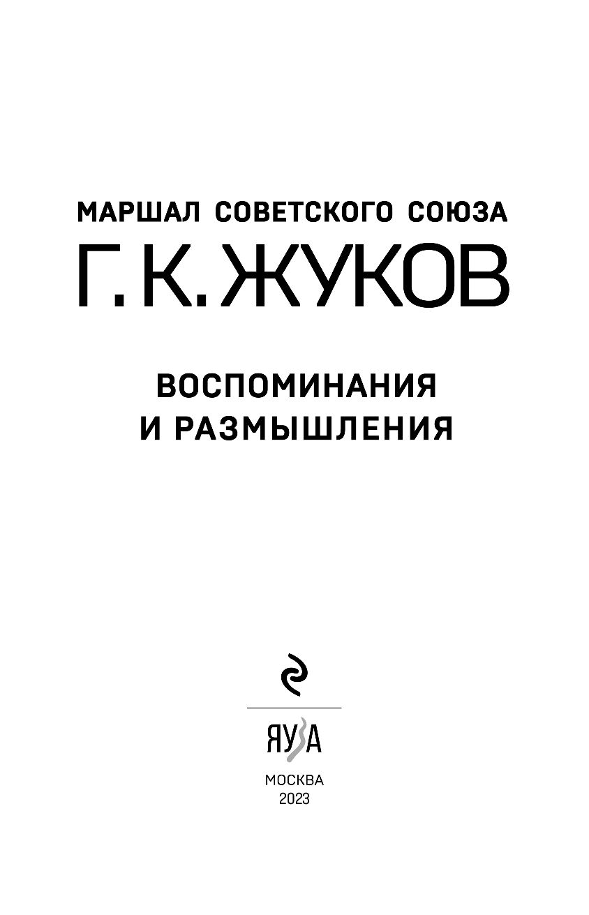 Воспоминания Маршала Советского Союза Г.К. Жукова – уникальный документ эпохи Советского Союза, переведенный на 19 языков и изданный в 30 странах. "Воспоминания и размышления" Георгия Константиновича по праву считаются классикой военных мемуаров, в них полководец рассказывает о военной службе, пройденном пути от солдата до маршала, работе Генерального штаба, планировании военных операций и о ходе боевых действий в годы Великой Отечественной войны. На страницах воспоминаний маршал Победы делится своими мыслями о войне, вспоминает сослуживцев и нелегкую военную пору.
