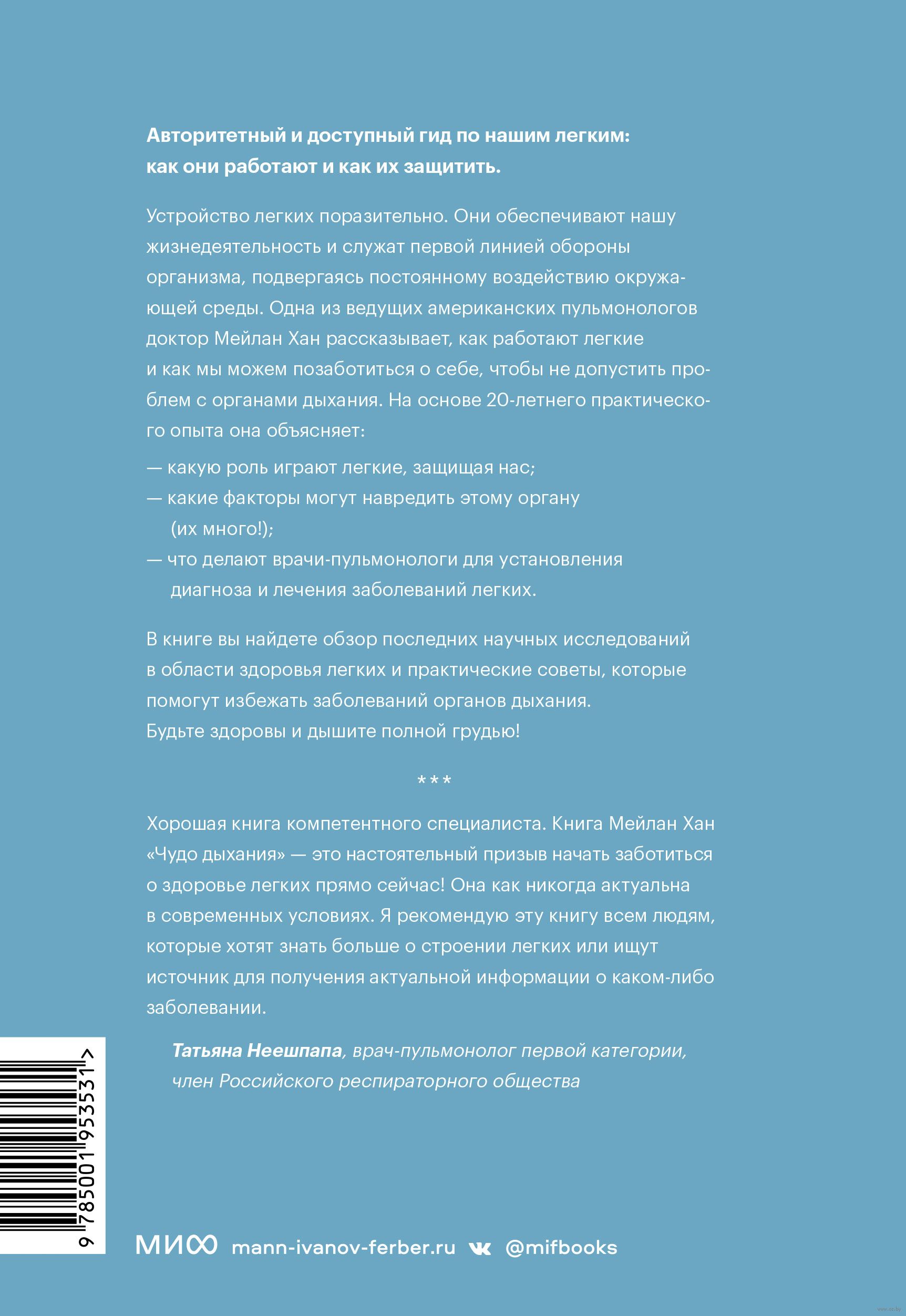 Доктор Хан объясняет чудо дыхания и показывает, что легкие служат первой линией обороны организма. Она дает обзор последних научных исследований о рисках для органов дыхания, включая загрязнение воздуха в помещении и вне его, курение, дым лесных пожаров и вирусы. А главное – предлагает практические советы, которые помогут поддержать здоровье легких.