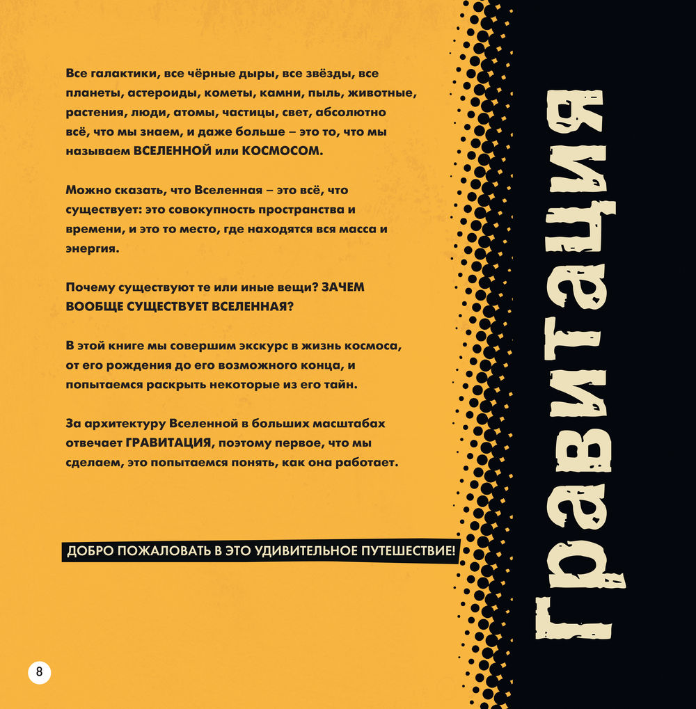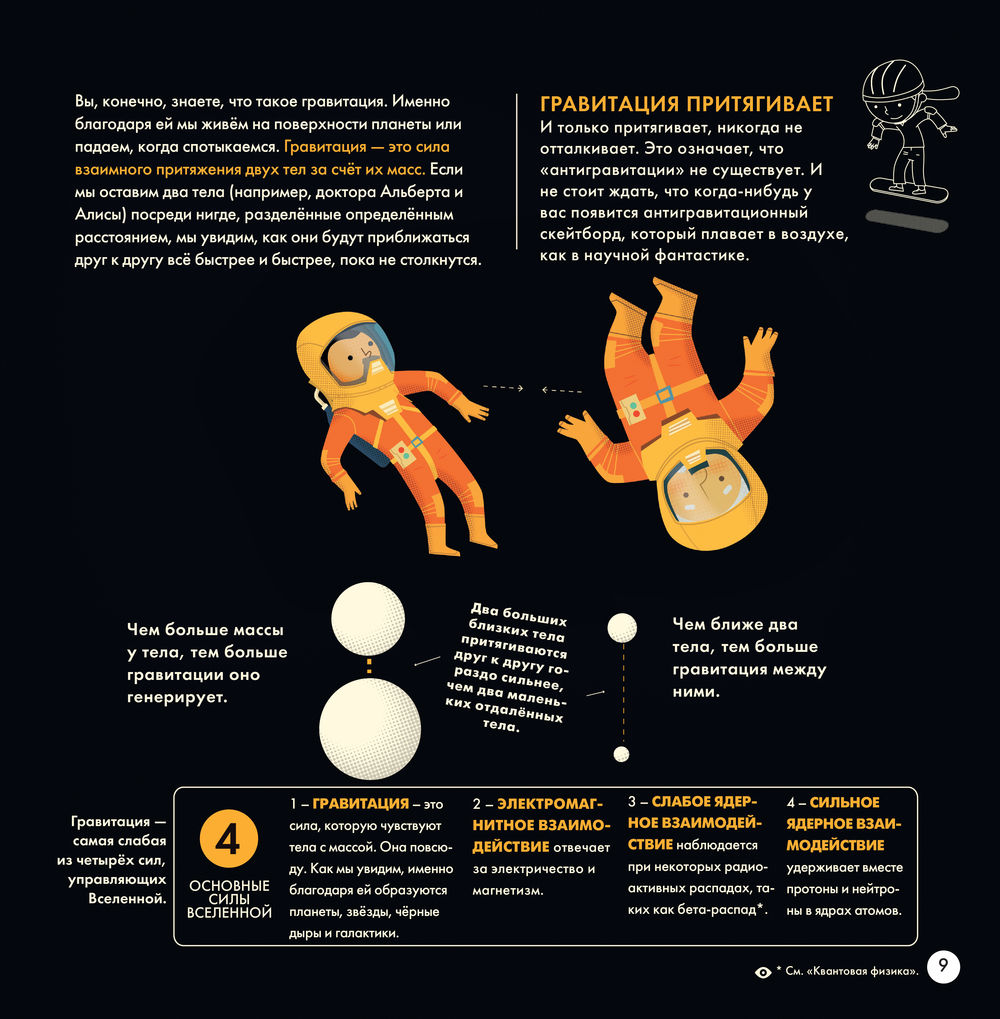 Книги этой серии объясняют сложные темы детям от девяти лет невероятно простым и весёлым способом. Сочетание большого количества фактов и красочных современных иллюстраций делает это издание идеальным подарком и незаменимым помощником в школьных проектах. Вам предстоит отправиться в увлекательное путешествие по жизни Вселенной, от её зарождения до возможного конца, и раскрыть многочисленные тайны: как живут и умирают звёзды, что такое экзопланета, сколько существует галактик, что такое тёмная материя, почему Вселенная расширяется, как путешествовать через "кротовые норы" и многое-многое другое.