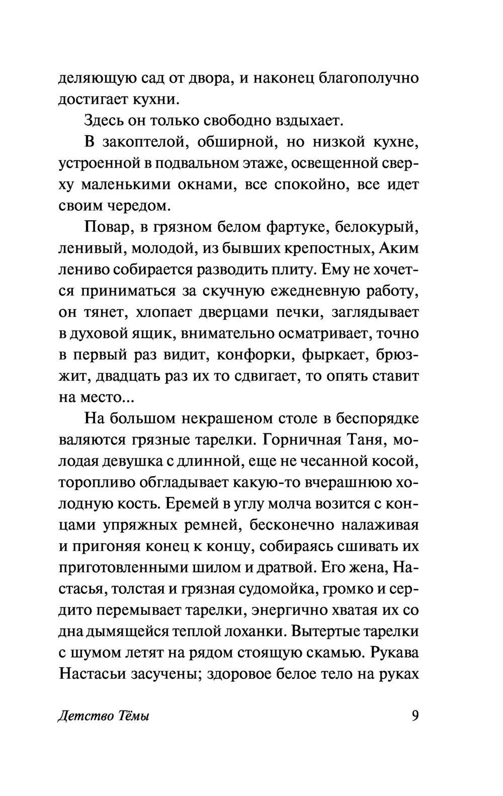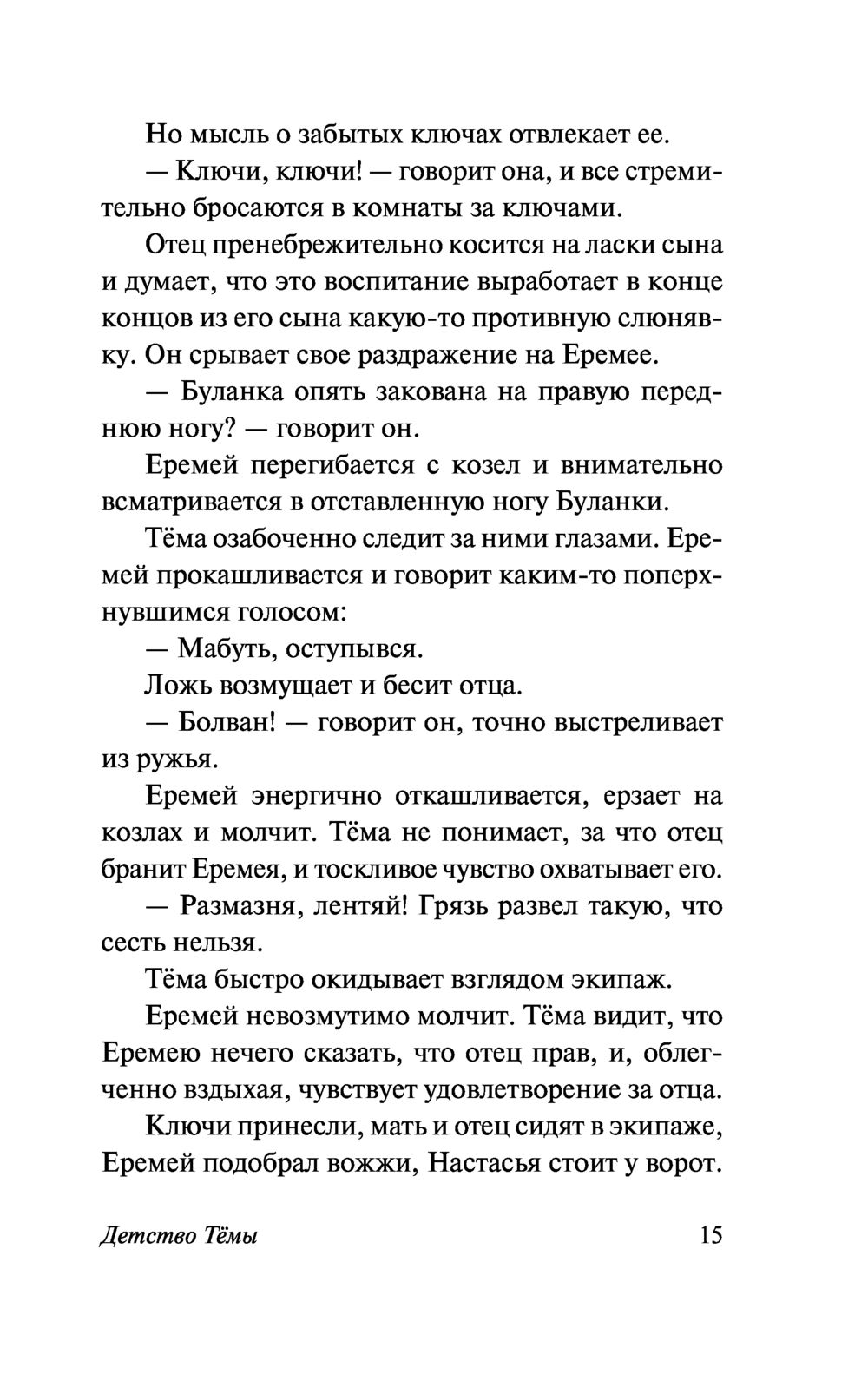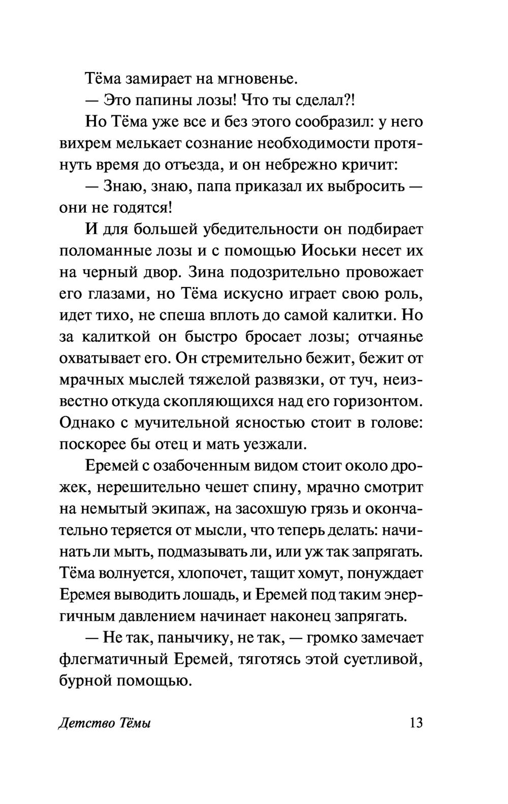 Без во многом автобиографичной повести "Детство Тёмы" невозможно представить русскую литературу на рубеже XIX-XX веков. Маленький Тёма Карташев – беспечный, шаловливый, но добрый мальчик. Его жизнь полна проказ, простых детских радостей и первых глубоких переживаний: то он ломает отцовский любимый цветок, то случайно рвет платье гувернантке, то спасает из колодца собаку Жучку. Через забавные происшествия, в которые попадает Тёма, и столкновение с "взрослым" миром проходил каждый, поэтому эта книга так близка многим поколениям читателей.
