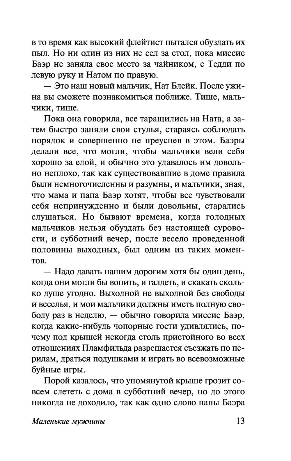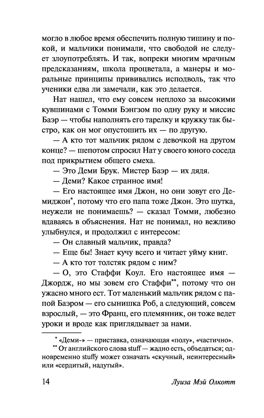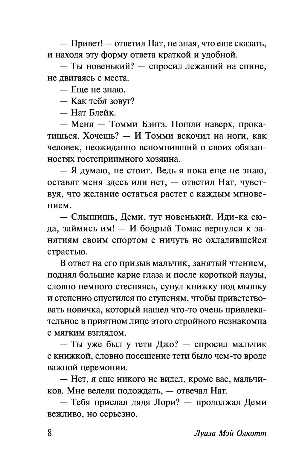 Бывшая озорница и сорвиголова Джо Марч, которую читатели помнят по "Маленьким женщинам", выходит замуж и открывает экспериментальную школу для мальчиков в поместье Пламфильд. Юные ученики школы, двенадцать мальчиков-сирот разных возрастов, учась и играя, работая и ссорясь, борются с недостатками и развивают свои сильные стороны.