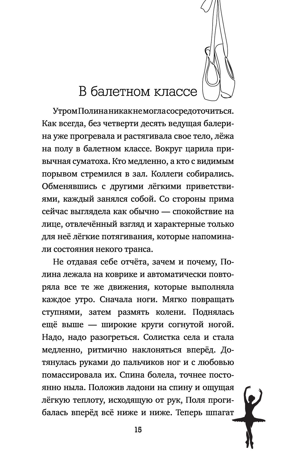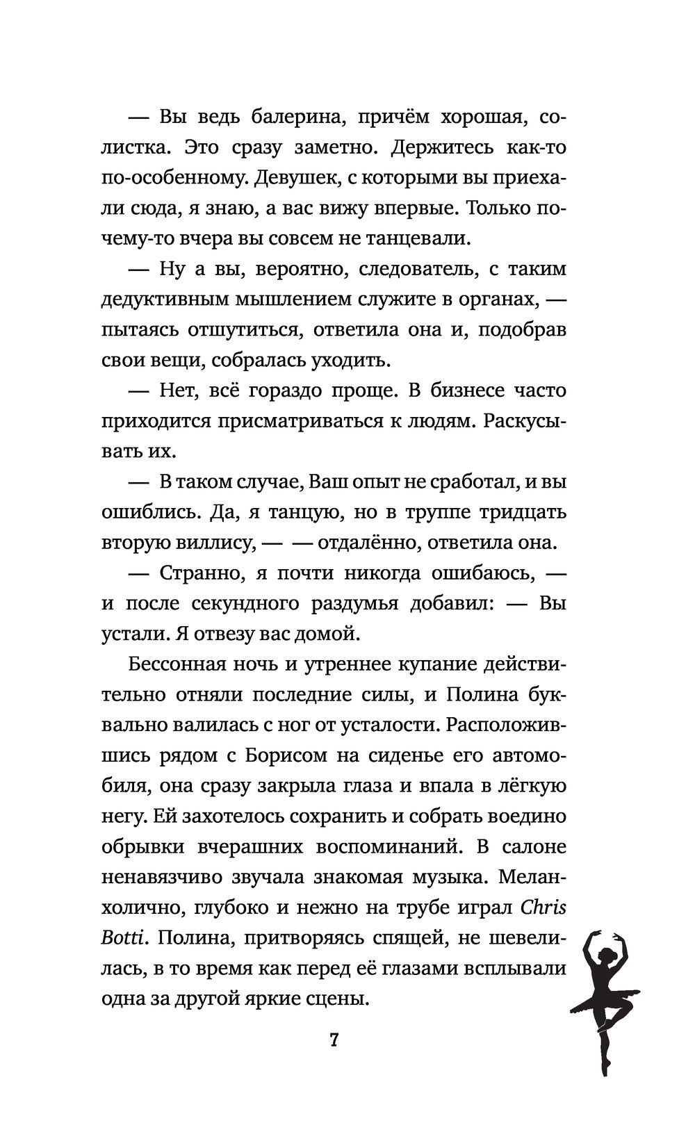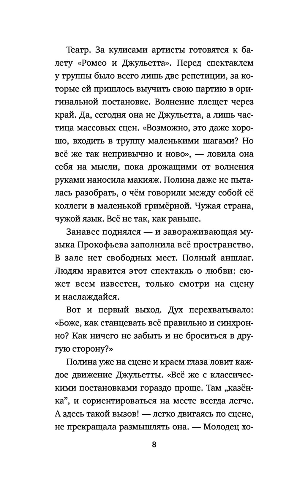 Главная героиня Полина, профессиональная балерина, как каждая одинокая девушка, мечтает быть счастливой. Творить, любить и быть любимой. Под завораживающие звуки музыки сюжет романа увлекает читателя за собой не только на сцену театра и за кулисы, но и по извилистым улочкам старого Вильнюса, чарующего Нью-Йорка и на загадочную землю инков. Интригующие и стремительно разворачивающиеся события уносят героиню в пучины страстей и вожделений. Сможет ли Полина пережить все жизненные невзгоды и встретит ли она свою судьбу?