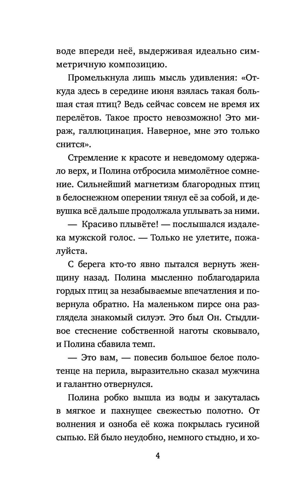 "Словно старую шкуру, Полина сбросила с себя платье и нырнула в озеро. Мгновенно приятная прохлада и свежесть прошла по всему её телу. Плыть было легко и приятно. За густым утренним туманом не было видно ни деревьев, ни другого берега. Она плыла в никуда, в неизвестность, разводя руками парное молоко и глядя вдаль, через густую завесу бархатной мглы".