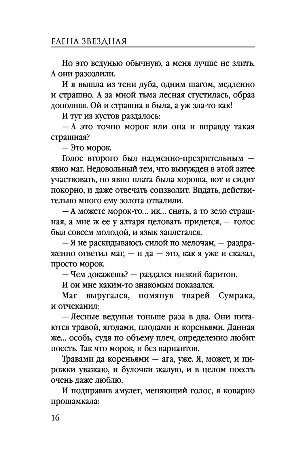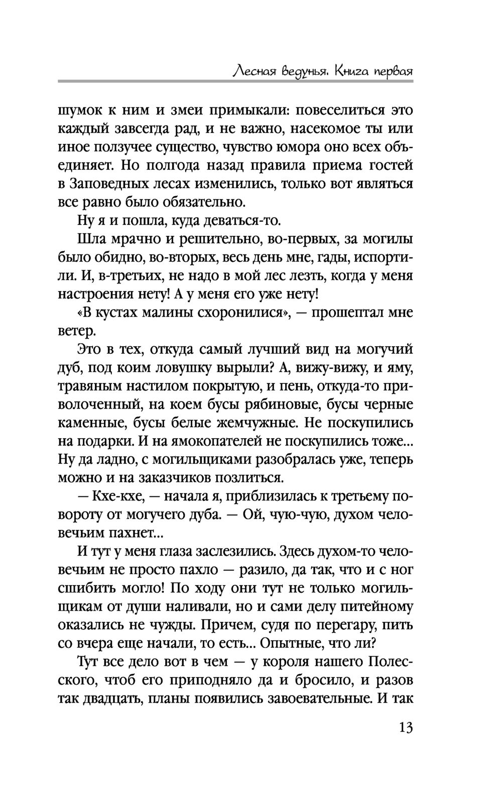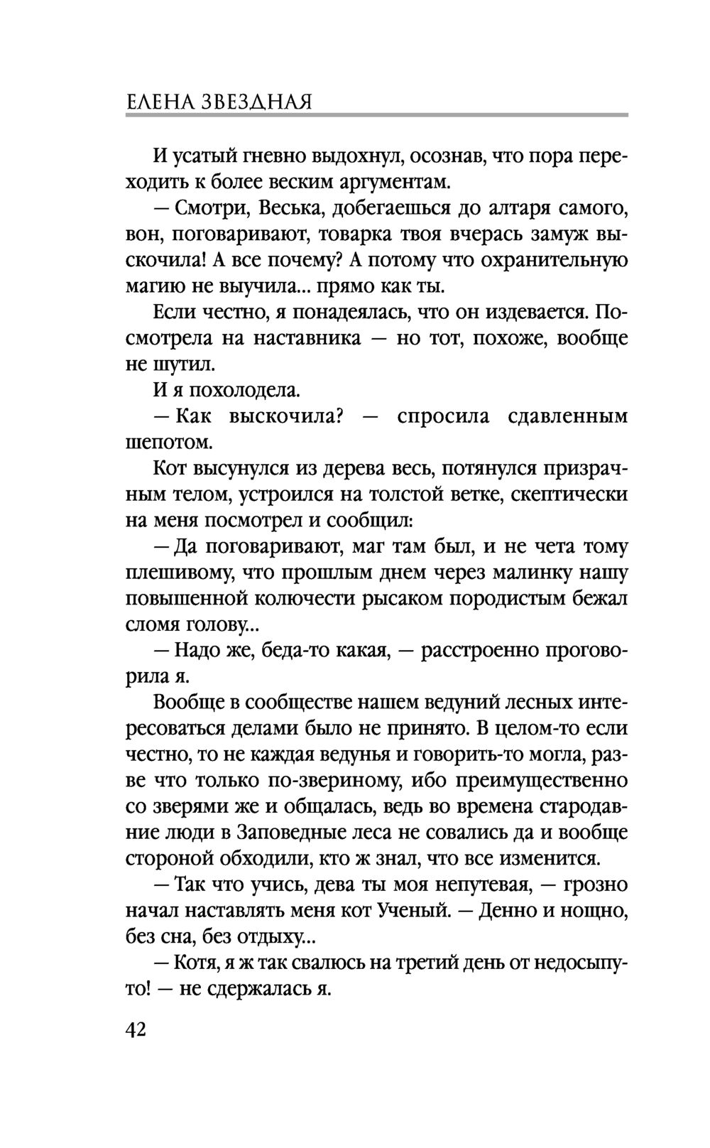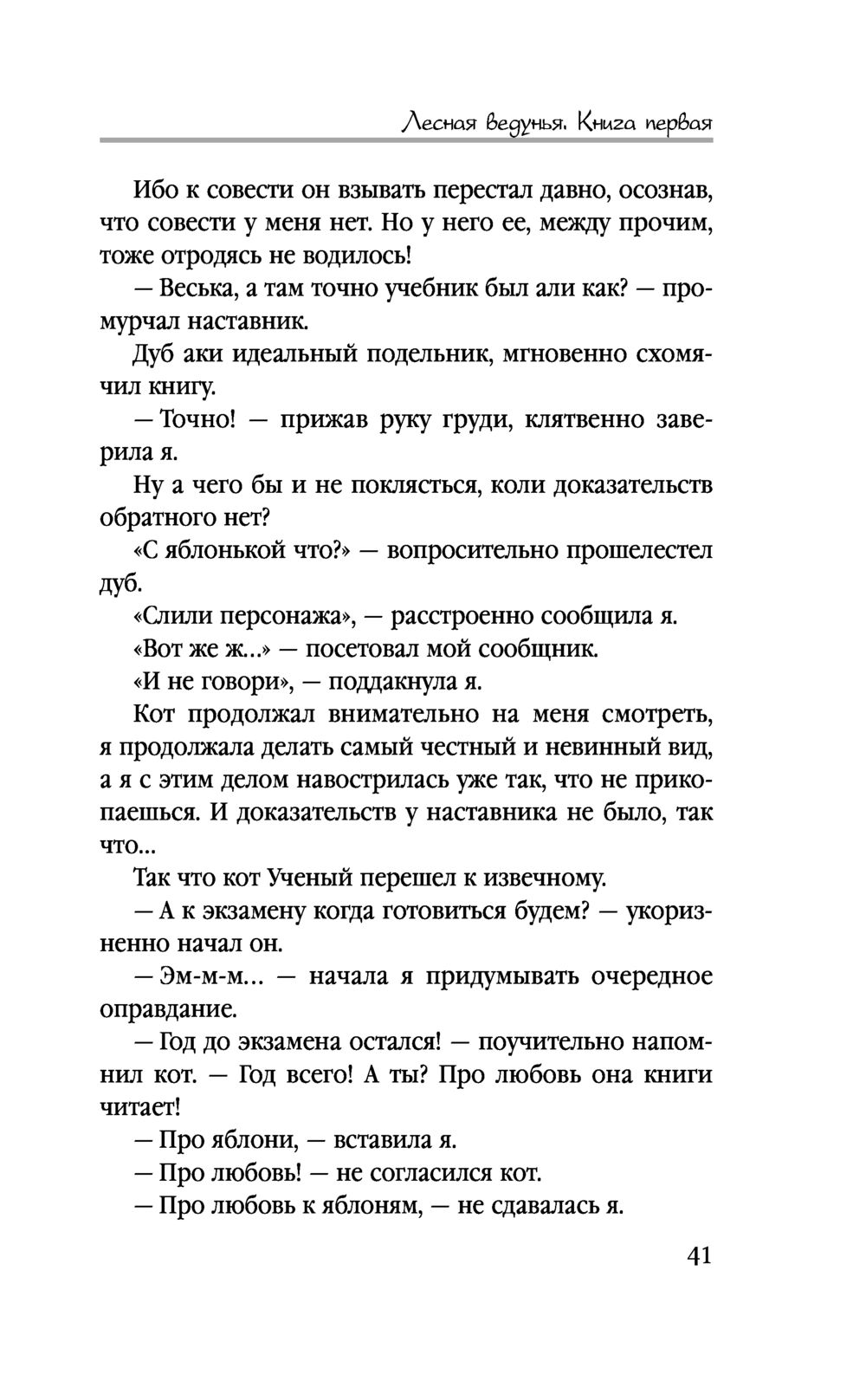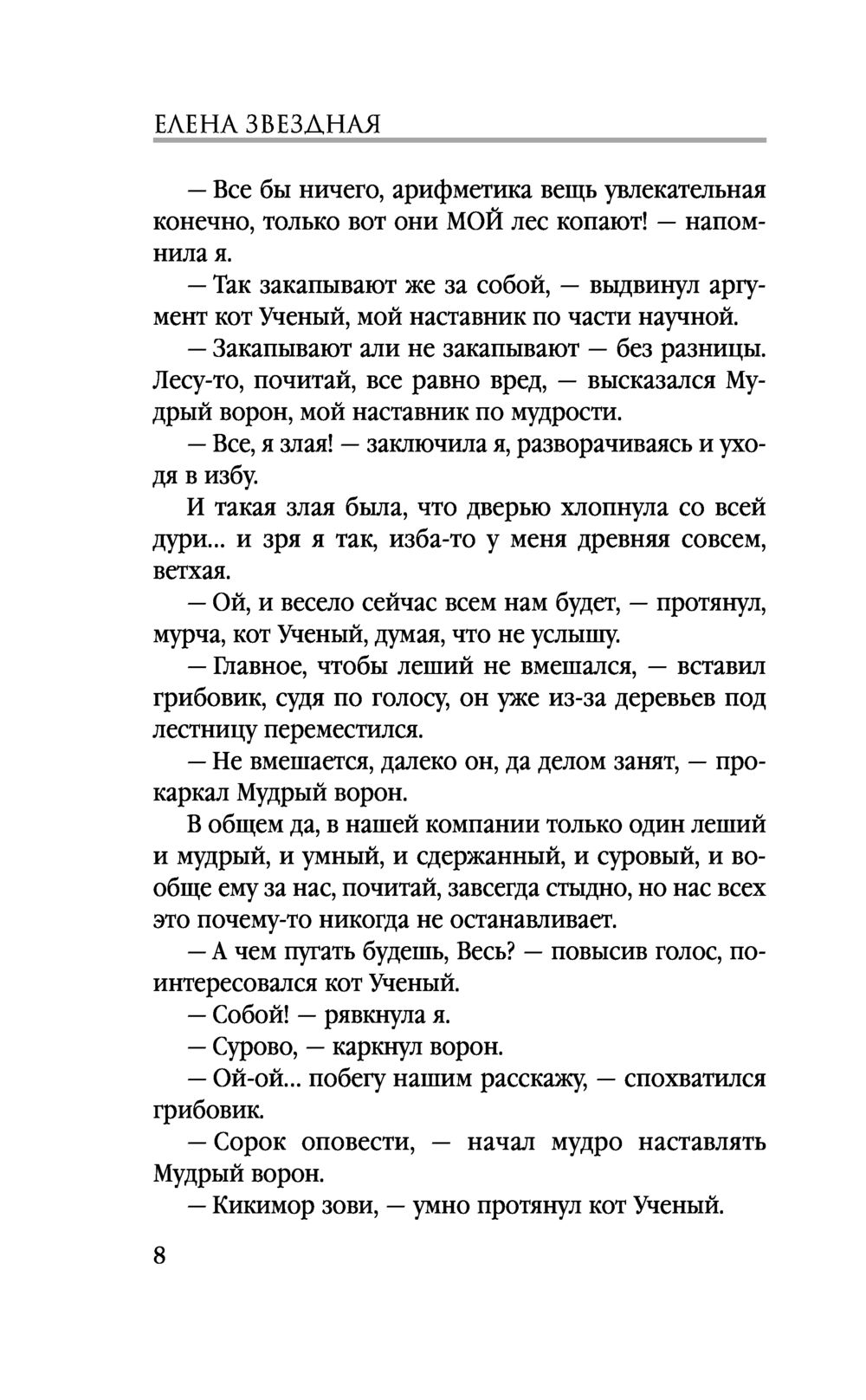 Сказочно живется ведьмочке Весе в Заповедном лесу! И чудеса есть, и с лешим бродит, и русалки присутствуют, не на ветвях, правда, а в реке ближней, зато с весьма привлекательным водяным. И кот Ученый имеется, и ворон Мудрый, и даже дуб Знаний, который вообще-то для этих самых знаний и подготовки к экзаменам полагается, но так-то почитать о приключениях на досуге предпочитает, и Веся это увлечение с ним разделяет. В общем, живет себе ведьмочка, не тужит, серые волки ей верно служат, Силушка Лесная помогает, и горя никто не знает.