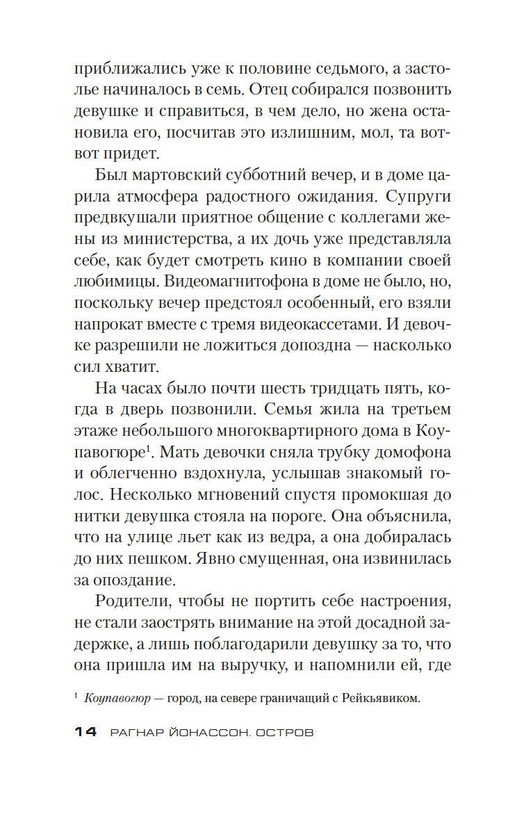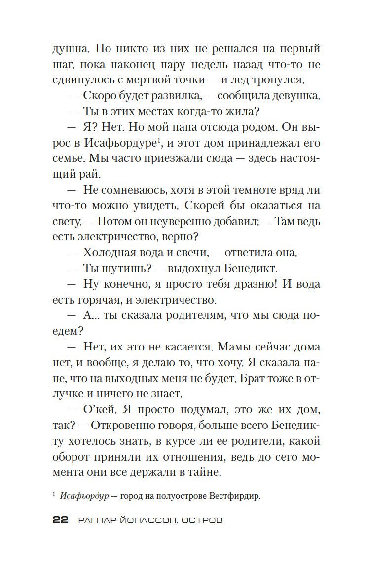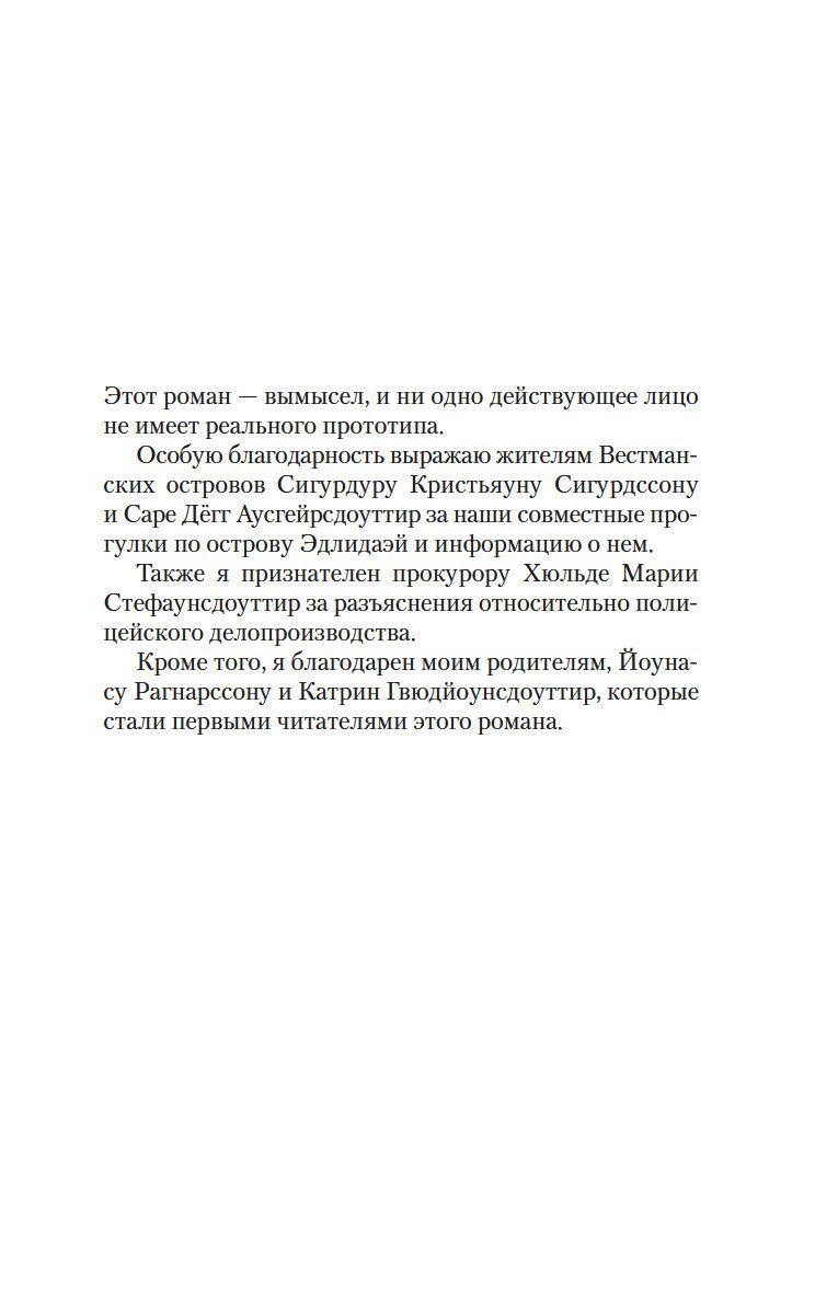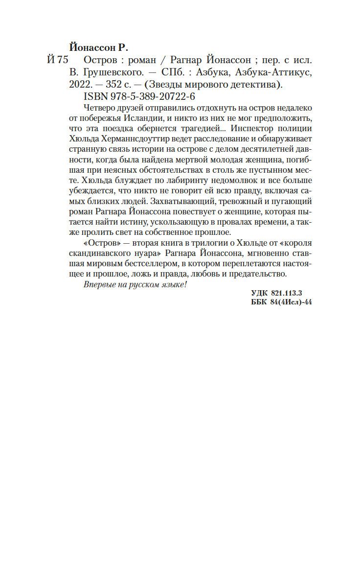 Четверо друзей отправились отдохнуть на остров недалеко от побережья Исландии, и никто из них мог предположить, что эта поездка обернется трагедией... Инспектор полиции Хюльда Херманнсдоуттир ведет расследование и обнаруживает странную связь истории на острове с делом десятилетней давности, когда была найдена мертвой молодая женщина, погибшая при неясных обстоятельствах в столь же пустынном месте. Хюльда блуждает по лабиринту недомолвок и все больше убеждается, что никто не говорит ей всю правду, включая самых близких людей. Захватывающий, тревожный и пугающий роман Рагнара Йонассона повествует о женщине, которая пытается найти истину, ускользающую в провалах времени, а также пролить свет на свое собственное прошлое.